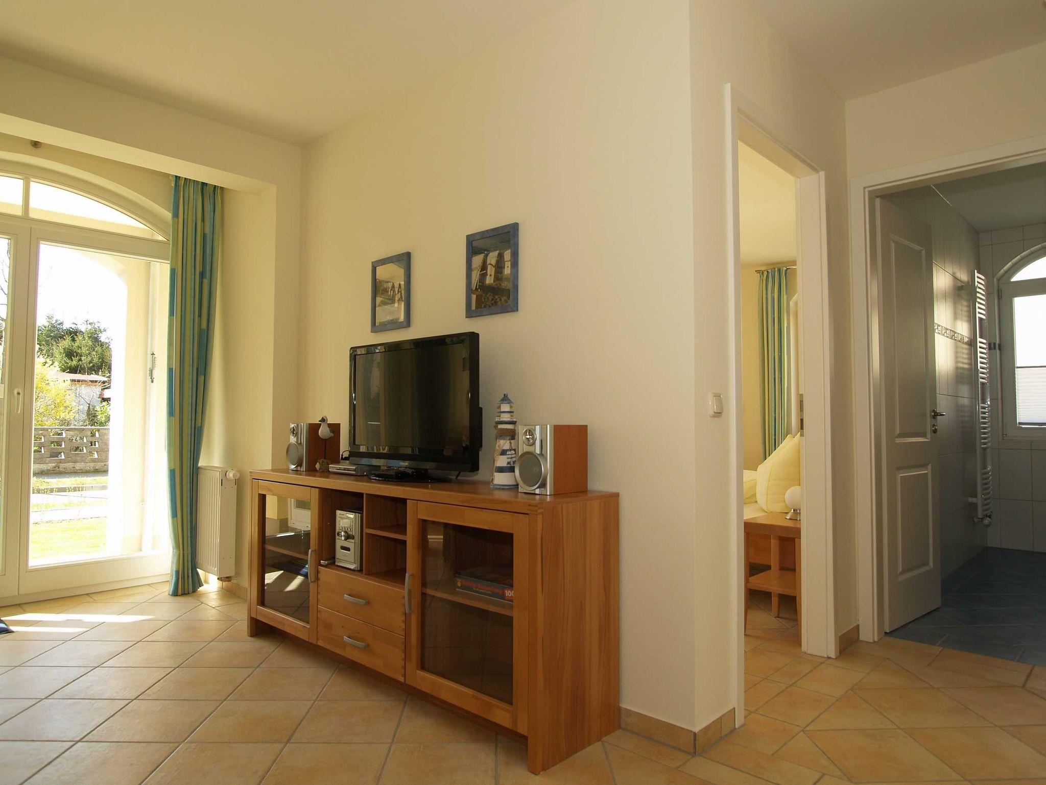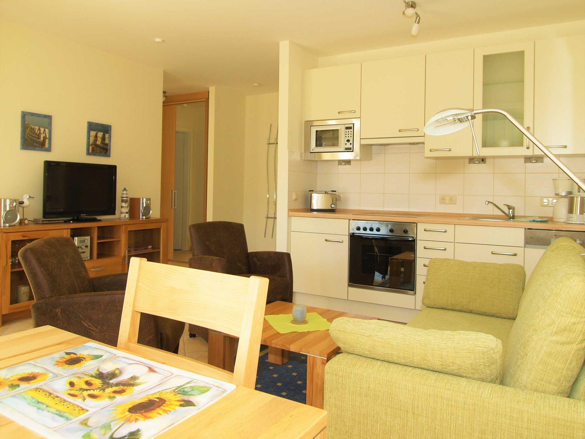 Sie wohnen in einer 50 m² großen 2-Raum-Ferienwohnung, die sich im Erdgeschoss der Villa Strandkuss befindet. Der helle freundliche Wohnraum ist ausgestattet mit einer gemütlichen Couchgarnitur, 32-Zoll-Flachbild-TV sowie mit einem Radio und einem Esstisch.