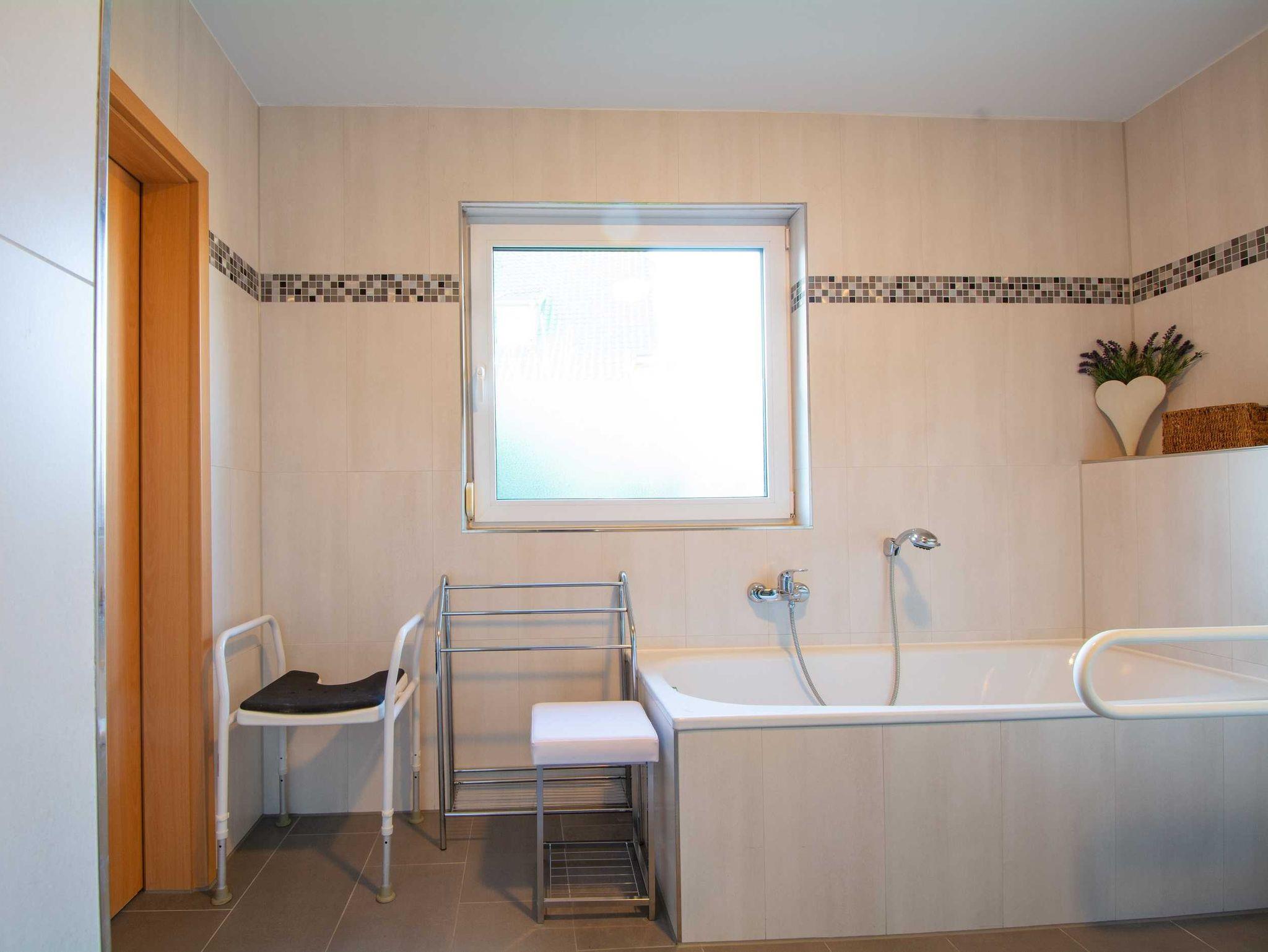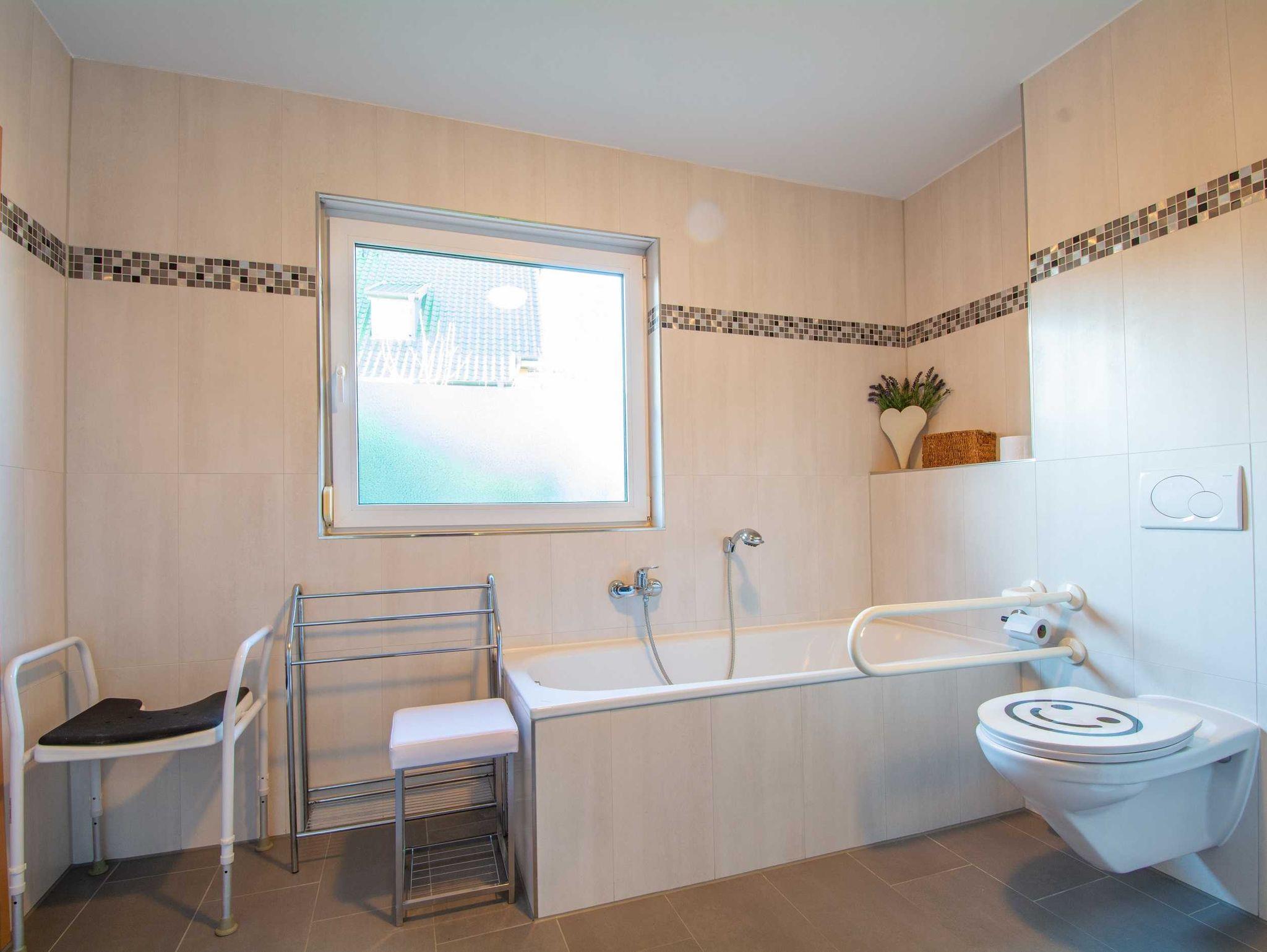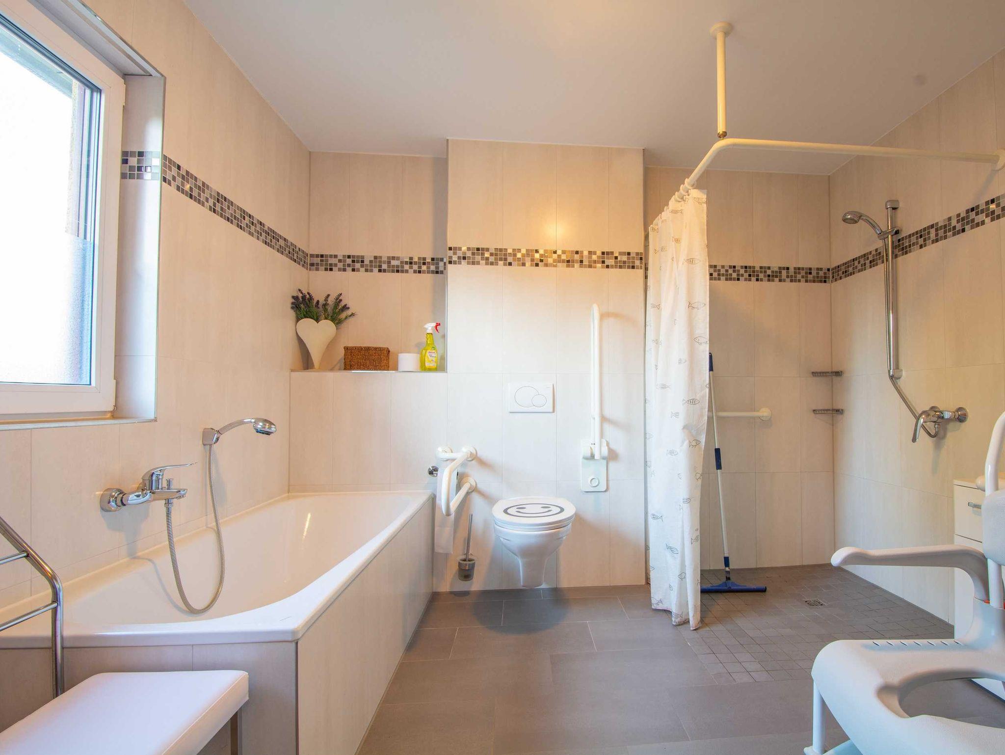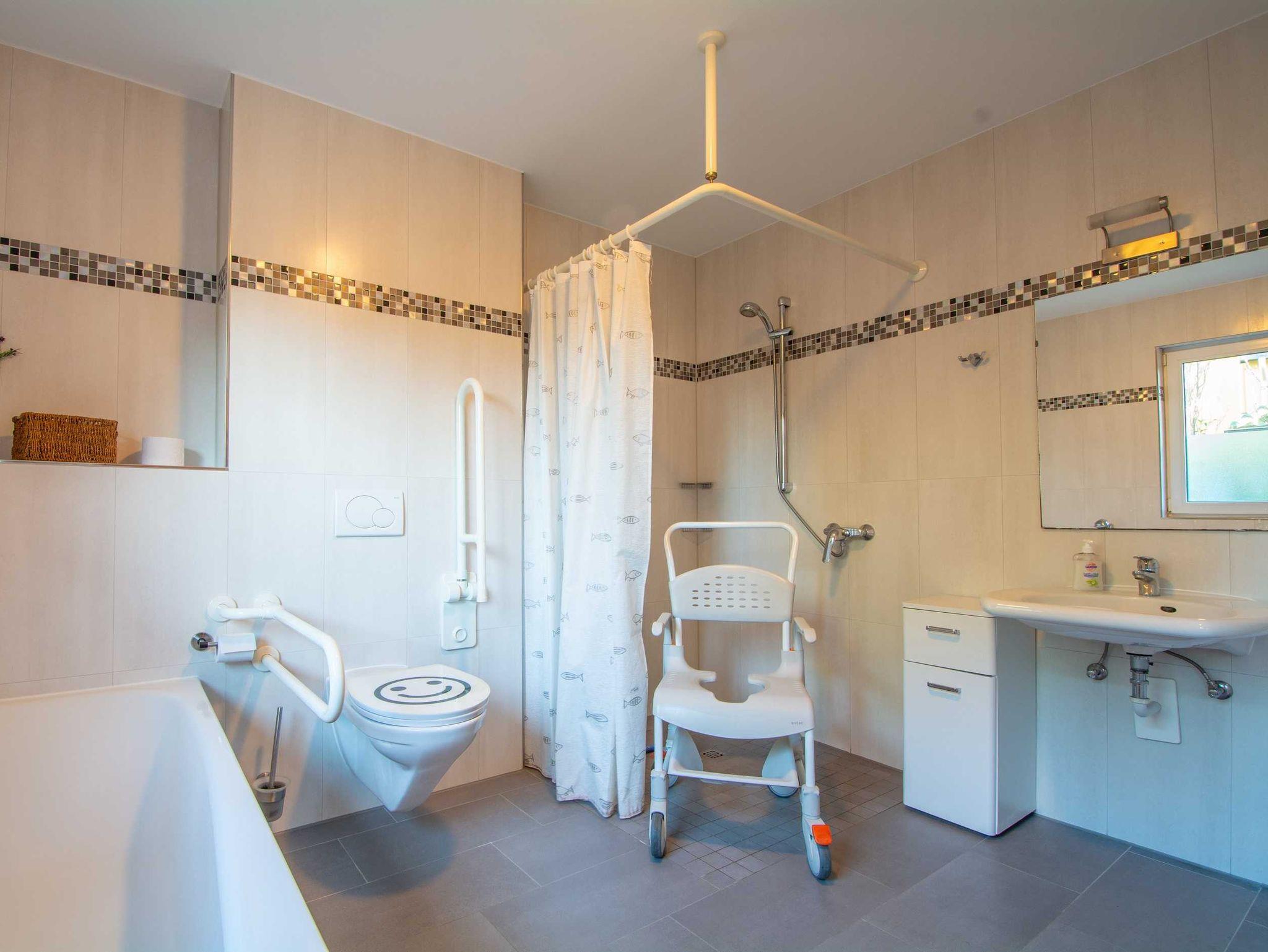 Im Erdgeschoss lädt ein Wannenbad zur Entspannung ein. Eine bodengleiche Dusche und ein WC mit Haltegriffen sowie ein unterfahrbares Waschbecken und breite Türen machen das Erdgeschoss für Personen mit Bewegungseinschränkungen zu einem idealen Aufenthaltsort.
