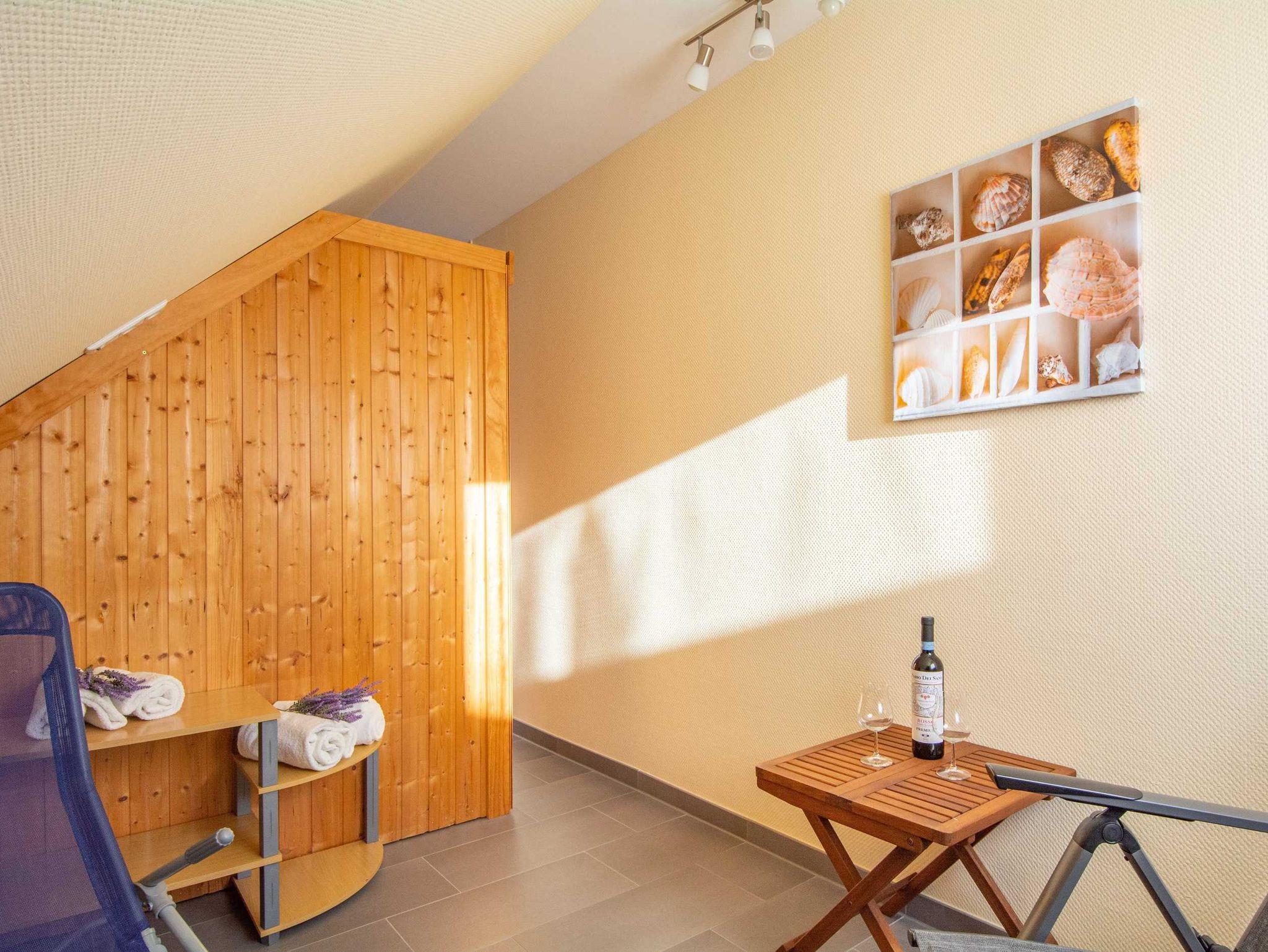 Vom Wohnbereich betreten Sie die möblierte Terrasse mit Gartenanteil, die nach Osten ausgerichtet ist. Hier können Sie Sonne tanken, relaxen und den Abend nach einem schönen Tag am Meer ausklingen lassen.