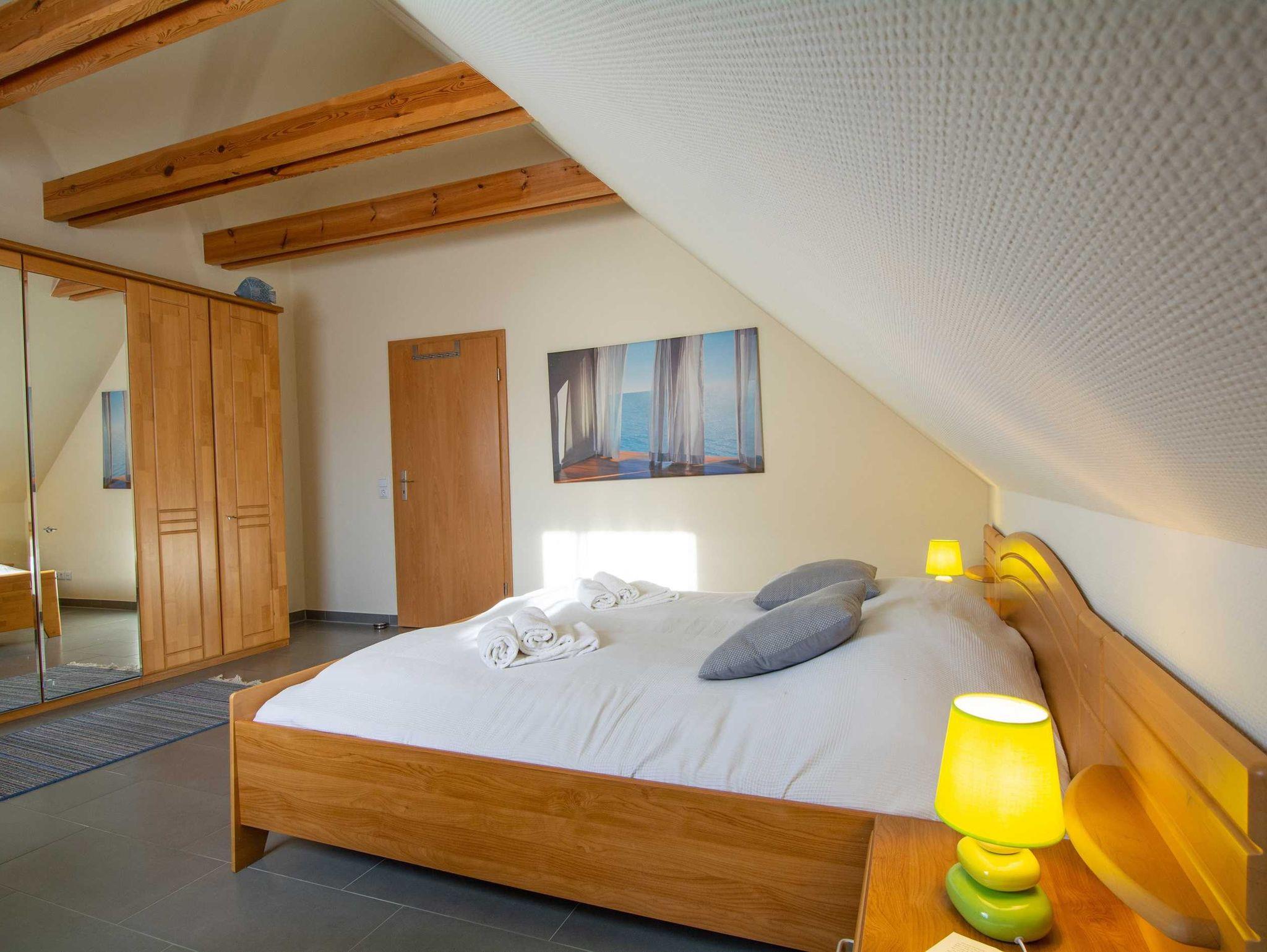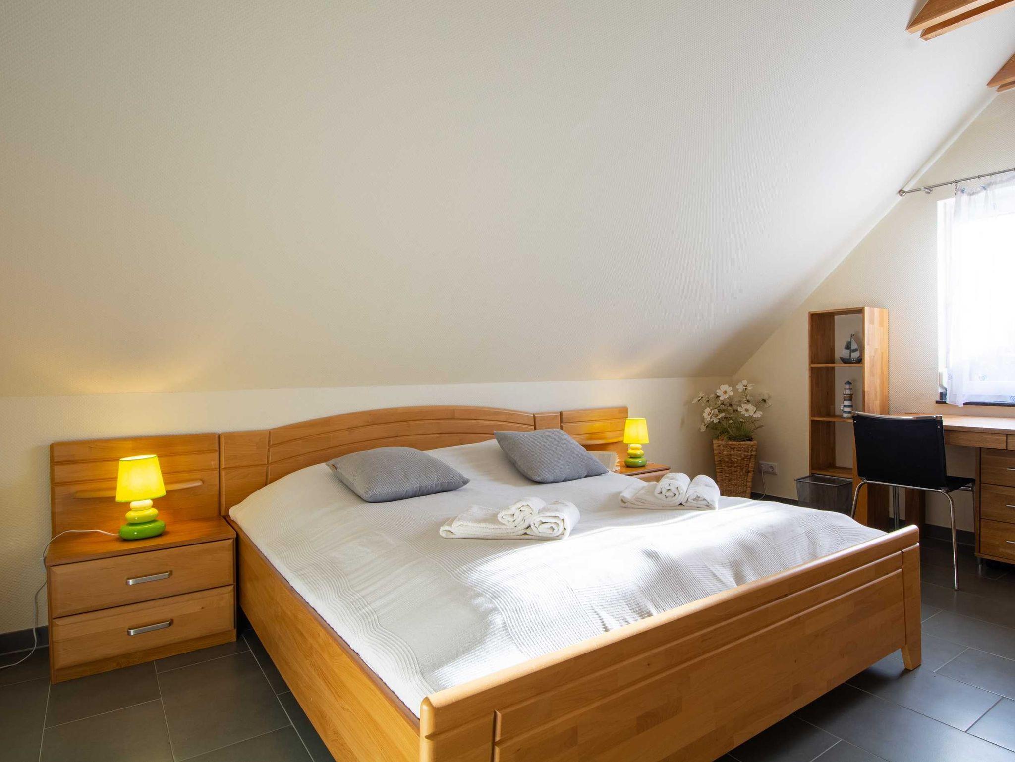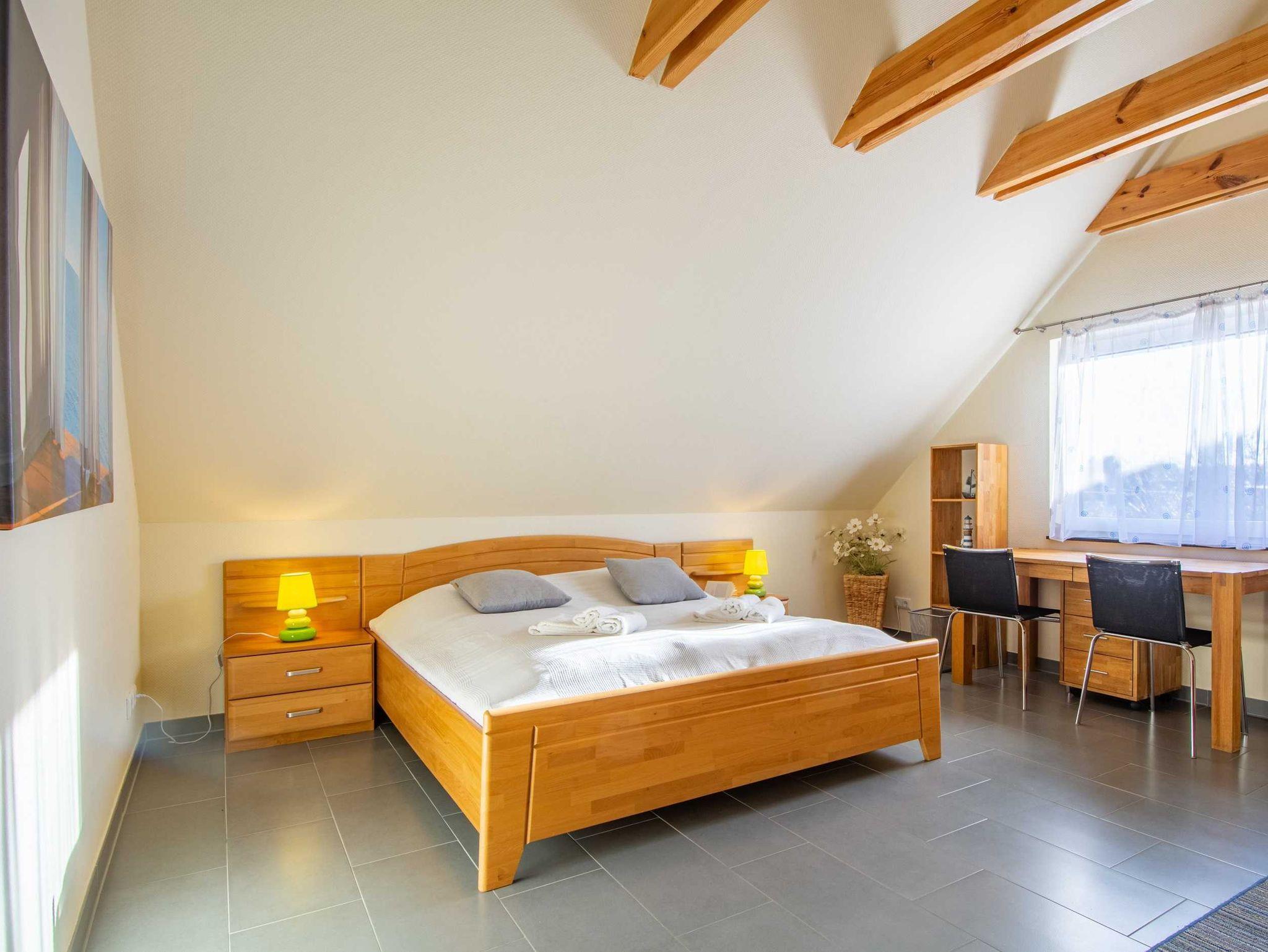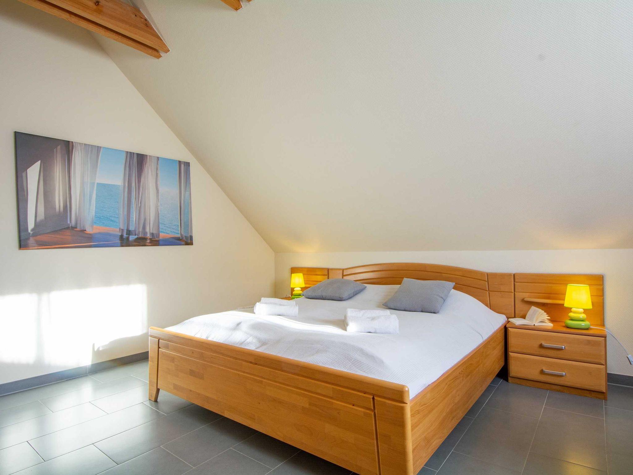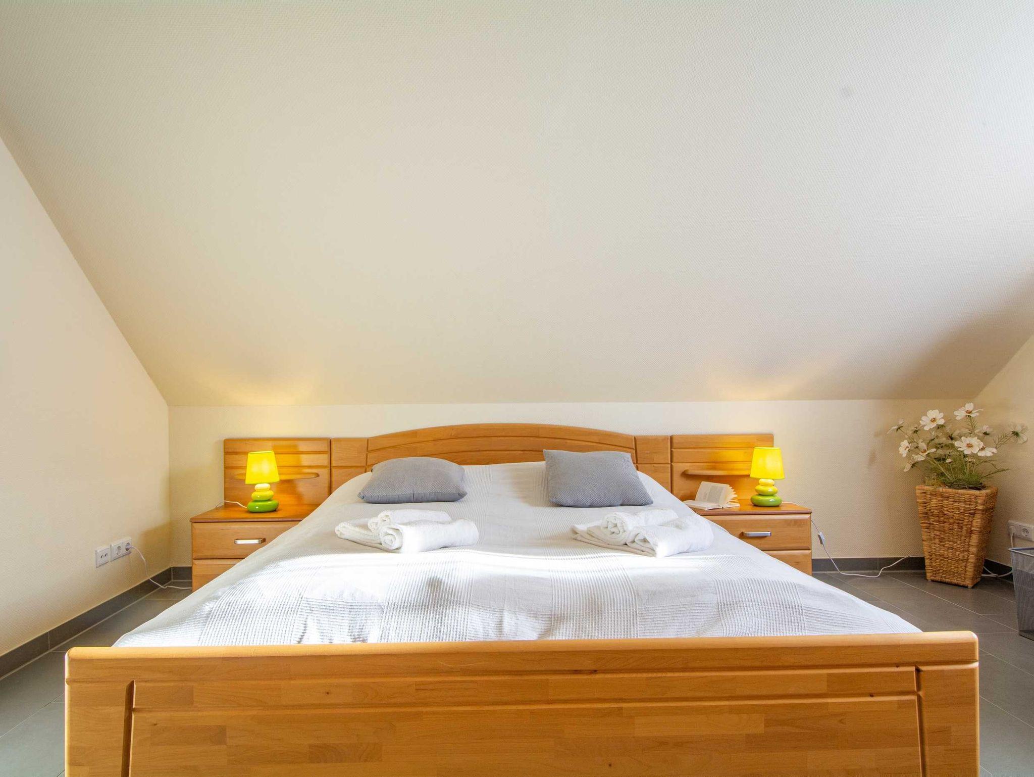 Ebenfalls auf der unteren Etage befinden sich das erste Schlafzimmer und das erste Bad. Im Schlafzimmer lädt Sie ein komfortables Doppelbett (2 x 90 x 200 cm) zur Nachtruhe ein. Der großzügige Kleiderschrank mit Ganzkörperspiegel bietet genügend Platz für Ihre Urlaubsgarderobe. Ein 39-Zoll-Smart-TV befindet sich ebenfalls in dem Schlafzimmer. Als Sichtschutz bzw. zum Verdunkeln sind im Schlafzimmer Außenrollos an den Fenstern angebracht. Im ersten Obergeschoss befinden sich zwei weitere Schlafzimmer. Eines ist ebenfalls mit einem Massivholzbett (2 x 90 x 200 cm), einem Schreibtisch, einem großen Kleiderschrank mit Ganzkörperspiegel sowie Außenrollos eingerichtet, das andere Schlafzimmer verfügt über eine ausziehbare Schlafcouch (80cm x 200 cm, ausgezogen 140cm x 200cm), einen Kleiderschrank sowie ein 27-Zoll-Flachbild-TV.