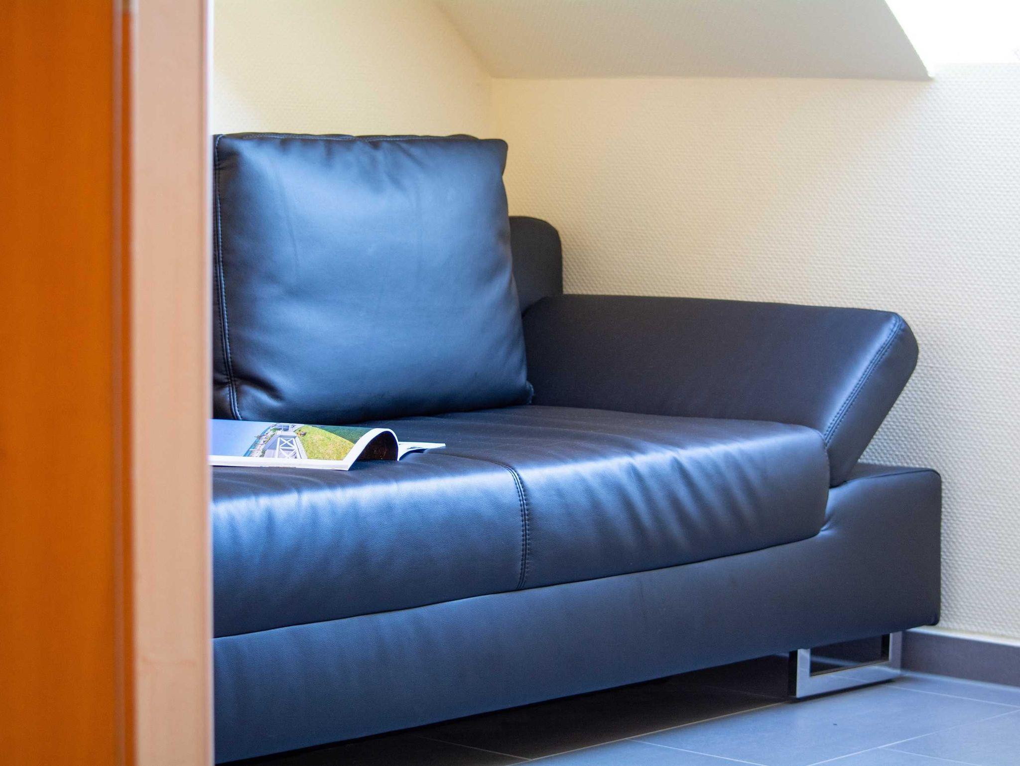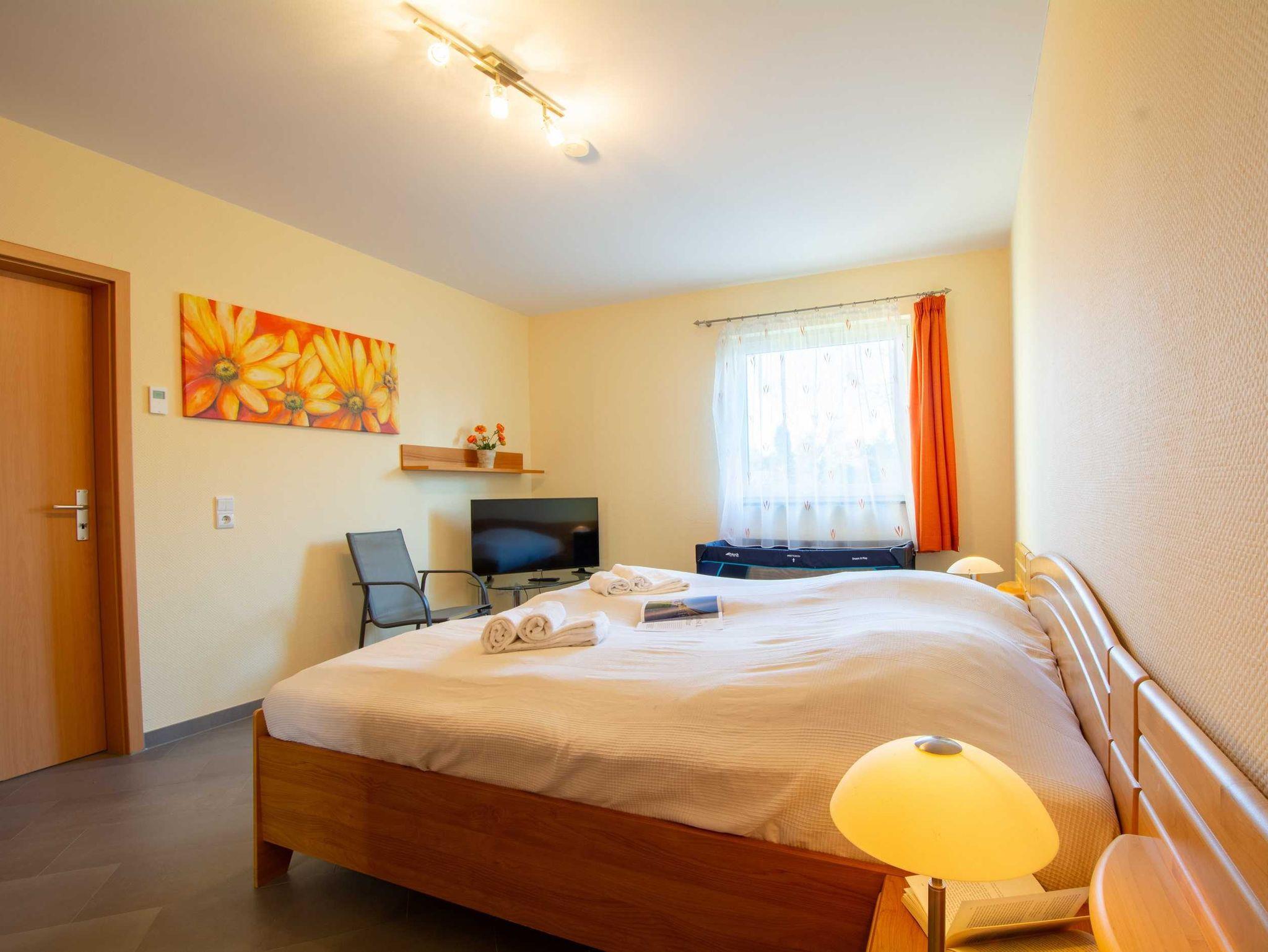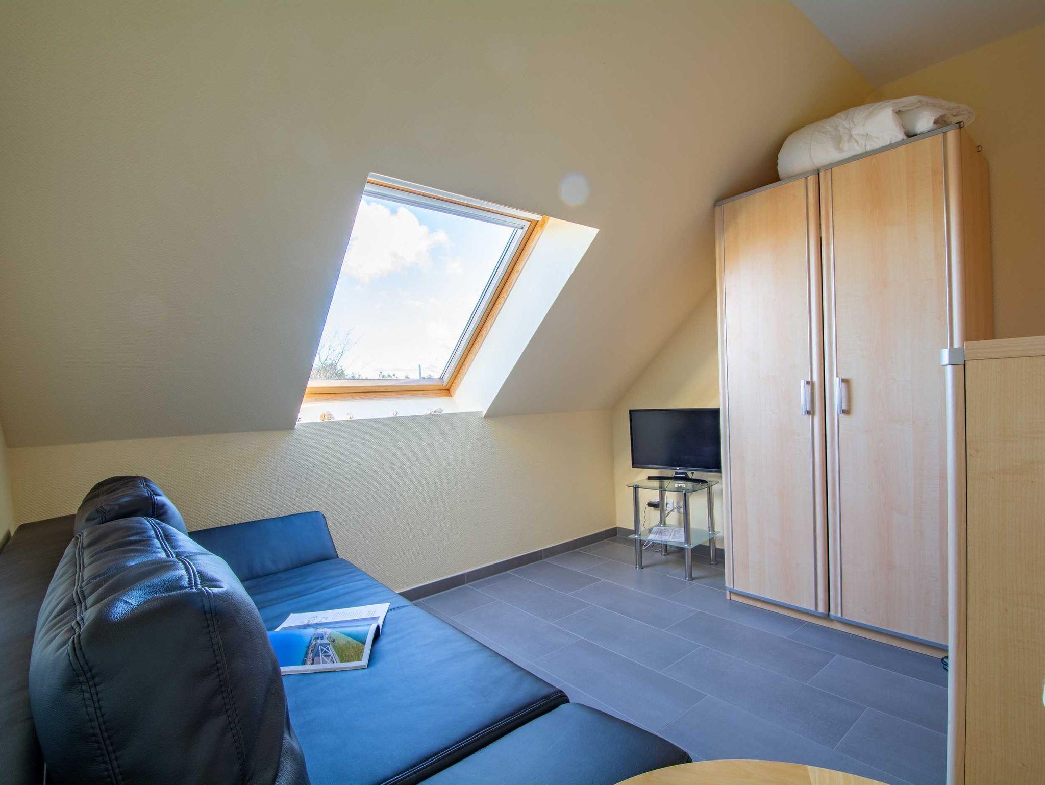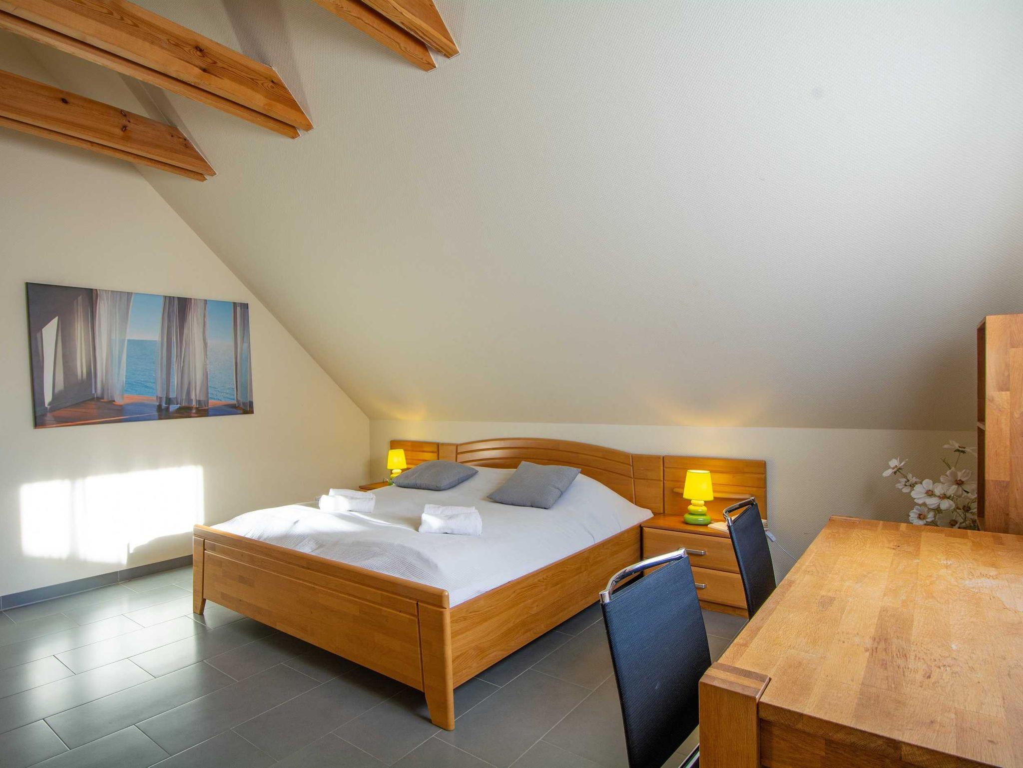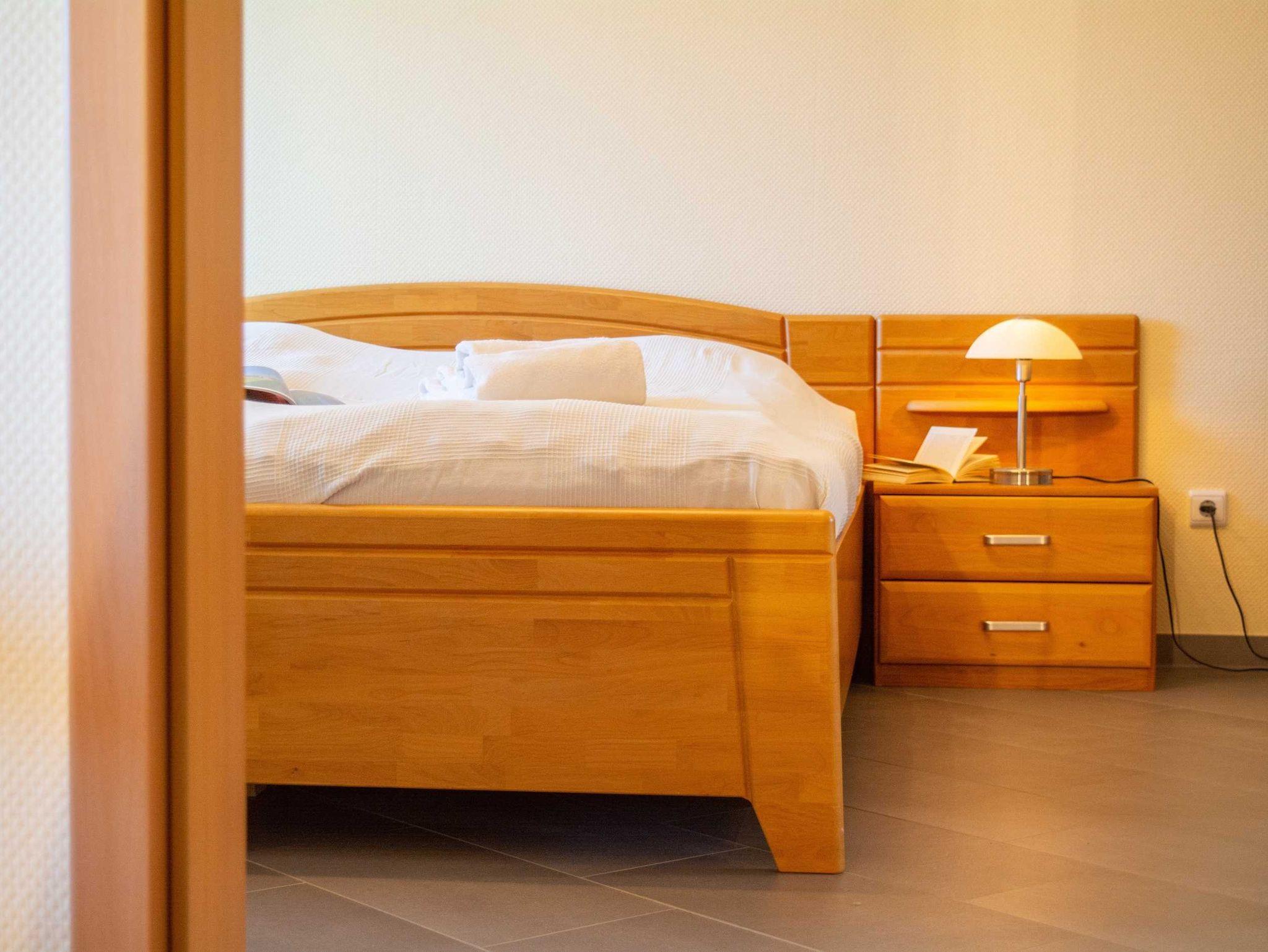 Ebenfalls auf der unteren Etage befinden sich das erste Schlafzimmer und das erste Bad. Im Schlafzimmer lädt Sie ein komfortables Doppelbett (2 x 90 x 200 cm) zur Nachtruhe ein. Der großzügige Kleiderschrank mit Ganzkörperspiegel bietet genügend Platz für Ihre Urlaubsgarderobe. Ein 39-Zoll-Smart-TV befindet sich ebenfalls in dem Schlafzimmer. Als Sichtschutz bzw. zum Verdunkeln sind im Schlafzimmer Außenrollos an den Fenstern angebracht. Im ersten Obergeschoss befinden sich zwei weitere Schlafzimmer. Eines ist ebenfalls mit einem Massivholzbett (2 x 90 x 200 cm), einem Schreibtisch, einem großen Kleiderschrank mit Ganzkörperspiegel sowie Außenrollos eingerichtet, das andere Schlafzimmer verfügt über eine ausziehbare Schlafcouch (80cm x 200 cm, ausgezogen 140cm x 200cm), einen Kleiderschrank sowie ein 27-Zoll-Flachbild-TV.