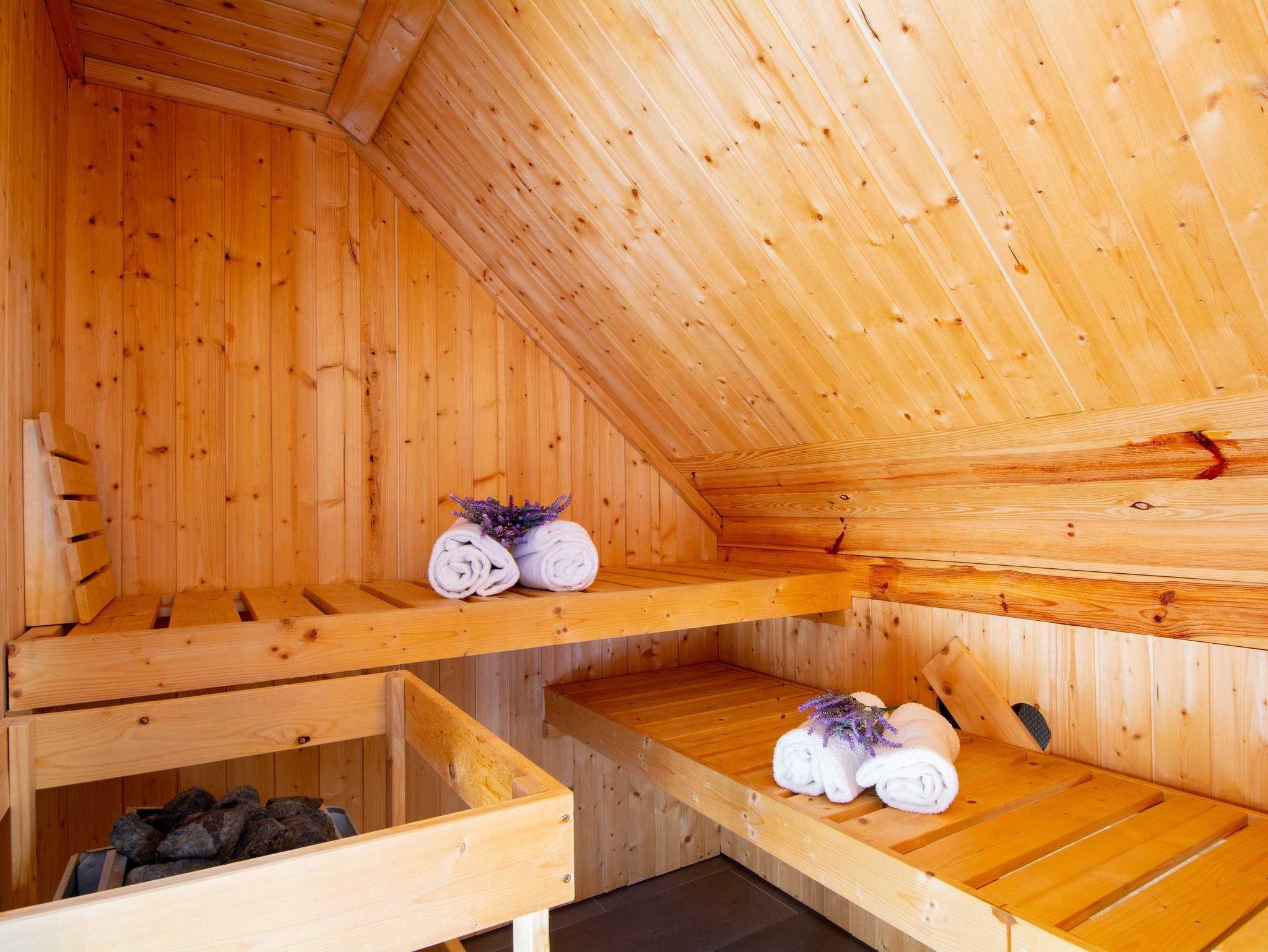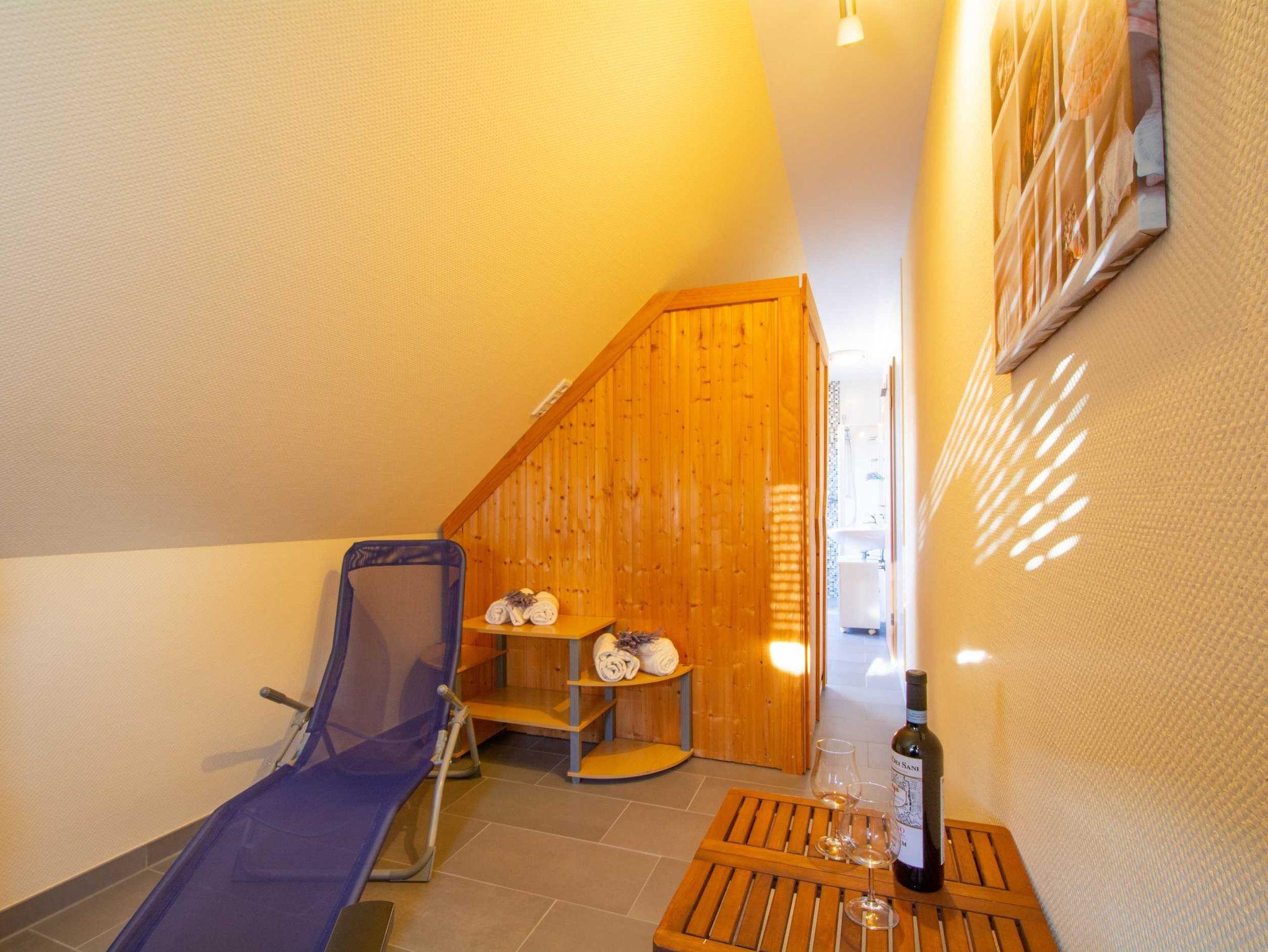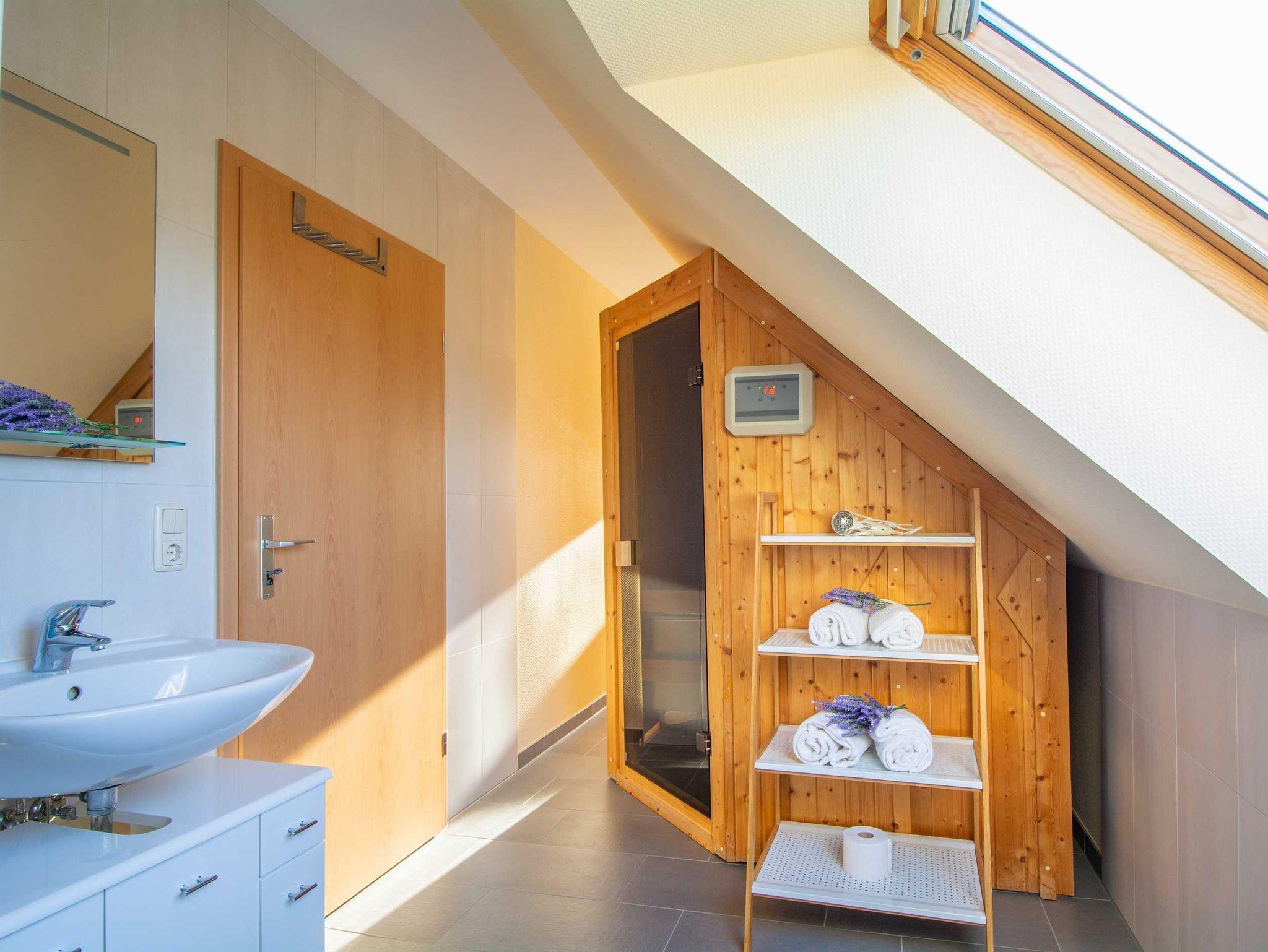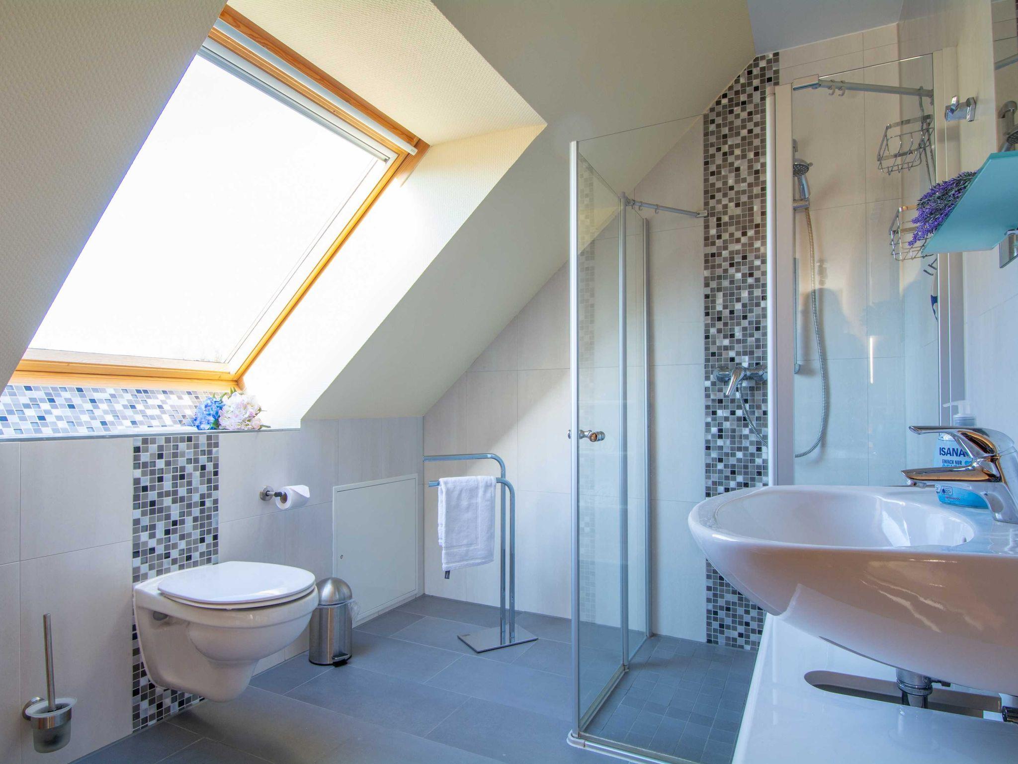Das moderne geflieste Tageslichtbad im Obergeschoss ist ausgestattet mit einer bodengleichen Dusche, Waschbecken und WC sowie reichlich Ablagefläche für Ihre Badutensilien. Hier befindet sich auch der Sauna- und Ruheraum, dessen Nutzung sich inklusive versteht.