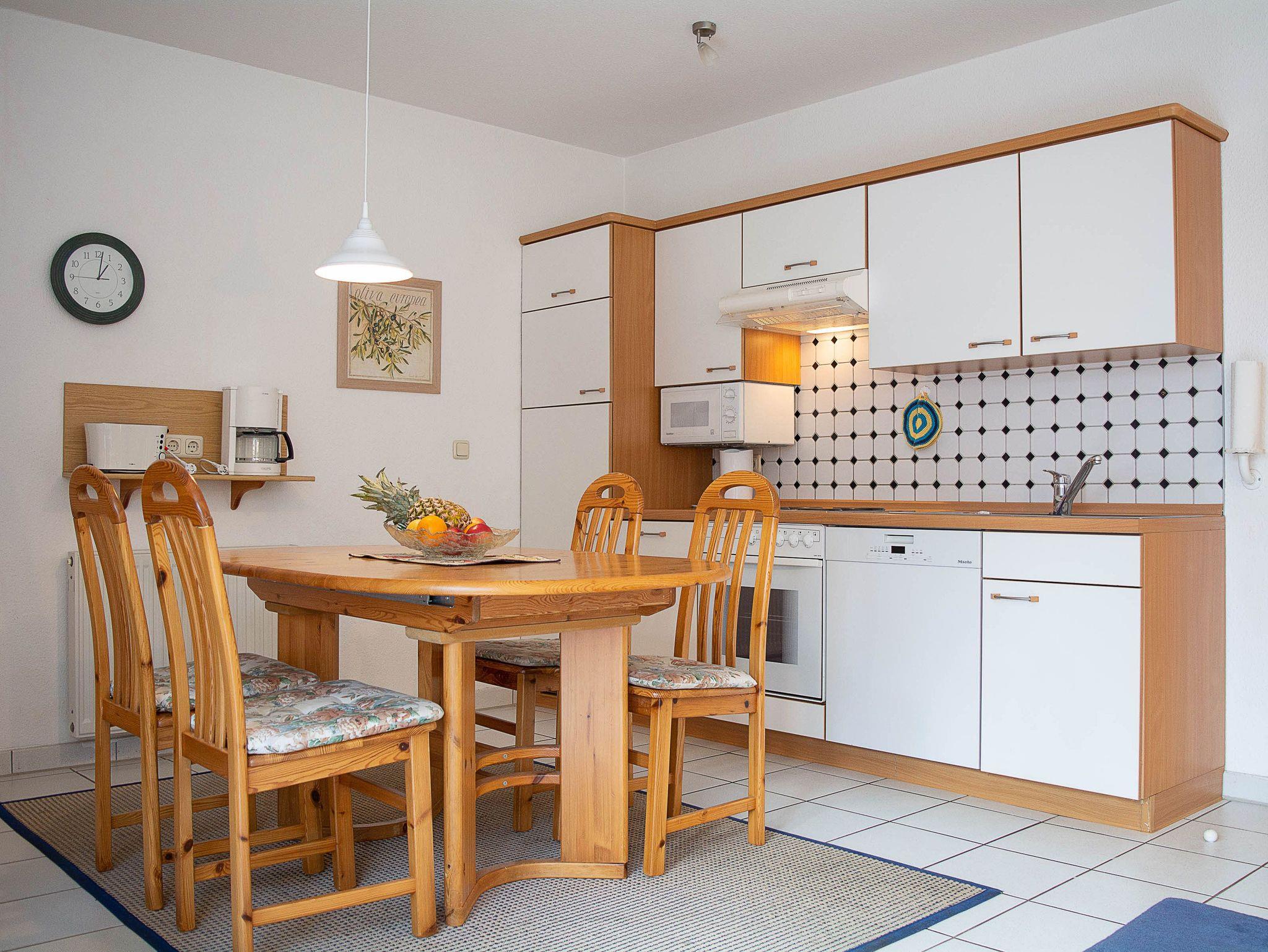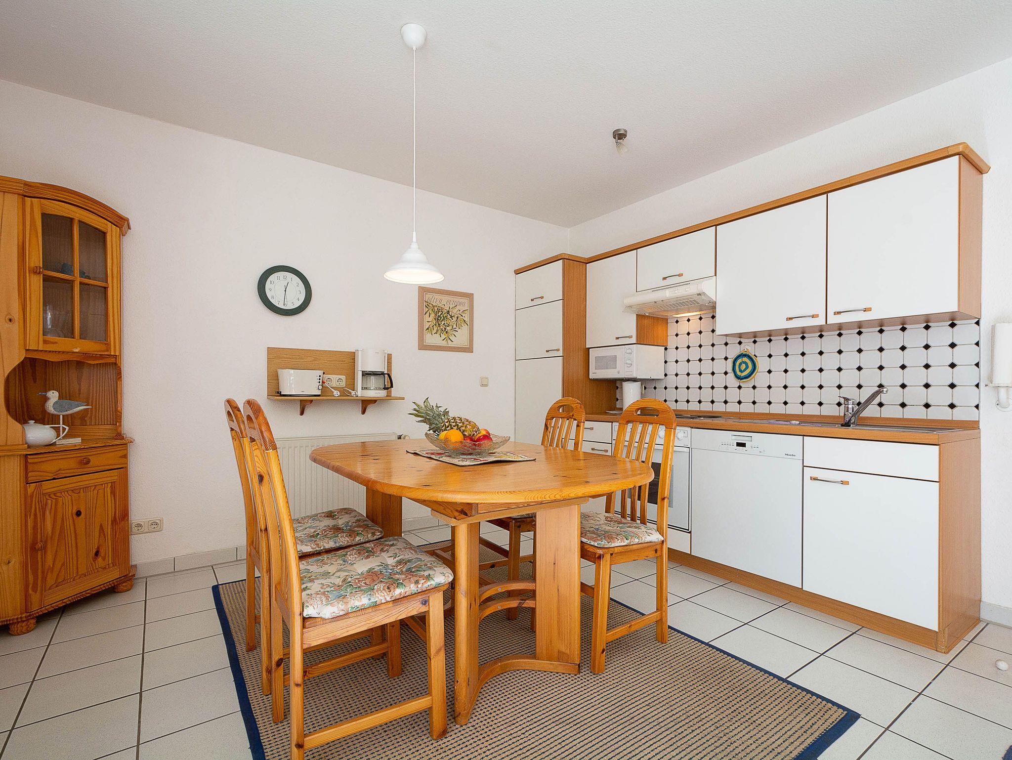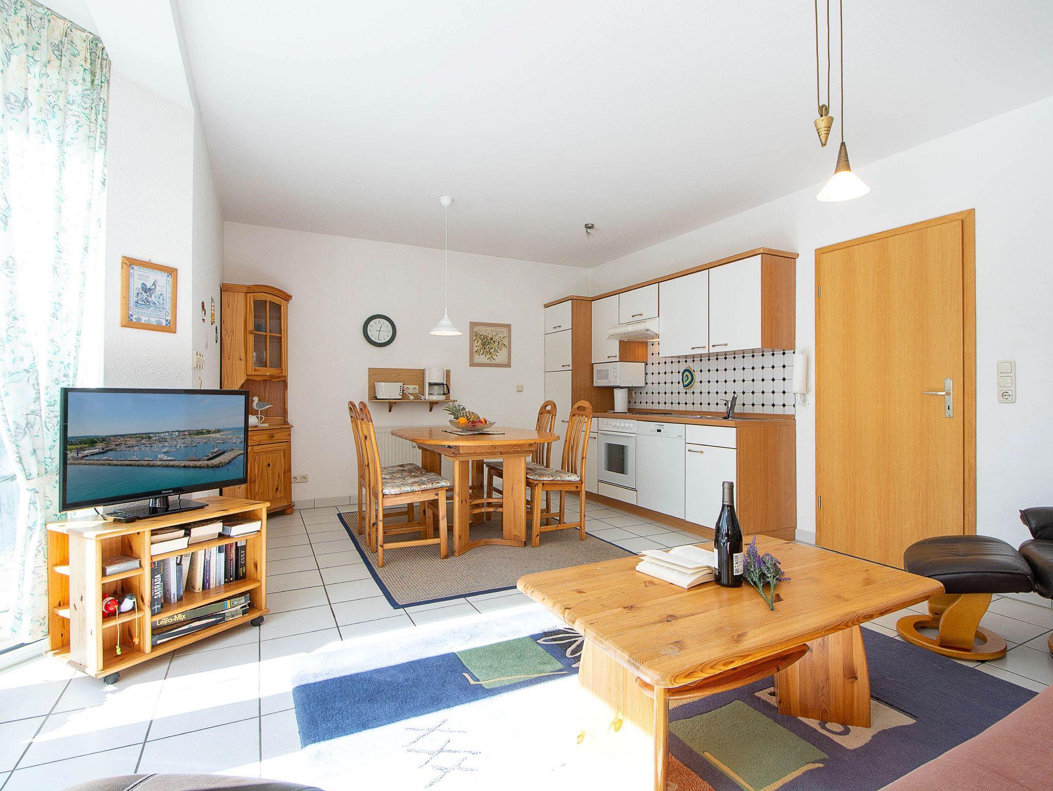 Sie wohnen in einer komfortablen 3-Raum-Ferienwohnung von ca. 65 qm Größe, die sich im Erdgeschoss eines Mehrfamilienhauses befindet. Das helle freundliche Wohnzimmer ist ausgestattet mit einer Sitzgruppe mit Schlafcouch (ausziehbar 150cm Breite), Radio und 43-Zoll-Flachbild-TV sowie einem Esstisch und einer offenen Küchenzeile. Die Küche ist ausgestattet mit allen wichtigen Küchengeräten und -utensilien, die Sie für Ihr „perfektes Dinner“ benötigen: Herd mit Backofen und Dunstabzug, Geschirrspüler, Kühlschrank mit Gefrierfach, Mikrowelle, Wasserkocher, Kaffeemaschine und Toaster sowie ausreichend Kochutensilien, Geschirr und Besteck sind vorhanden. Vom Wohnraum aus betreten Sie die Terrasse, die in Richtung Süden ausgerichtet ist. Hier können nach einem erlebnisreichen Tag am Strand Ihren Abend zu einem Gläschen Wein ausklingen lassen. Ein Schlafzimmer mit Doppelbett (180cm x 200cm) und ein Schlafzimmer mit Einzel- und Rollbett (jeweils 90cm x 200cm) sowie das Bad mit Dusche und WC vervollständigen das Gesamtbild dieser Wohnung.