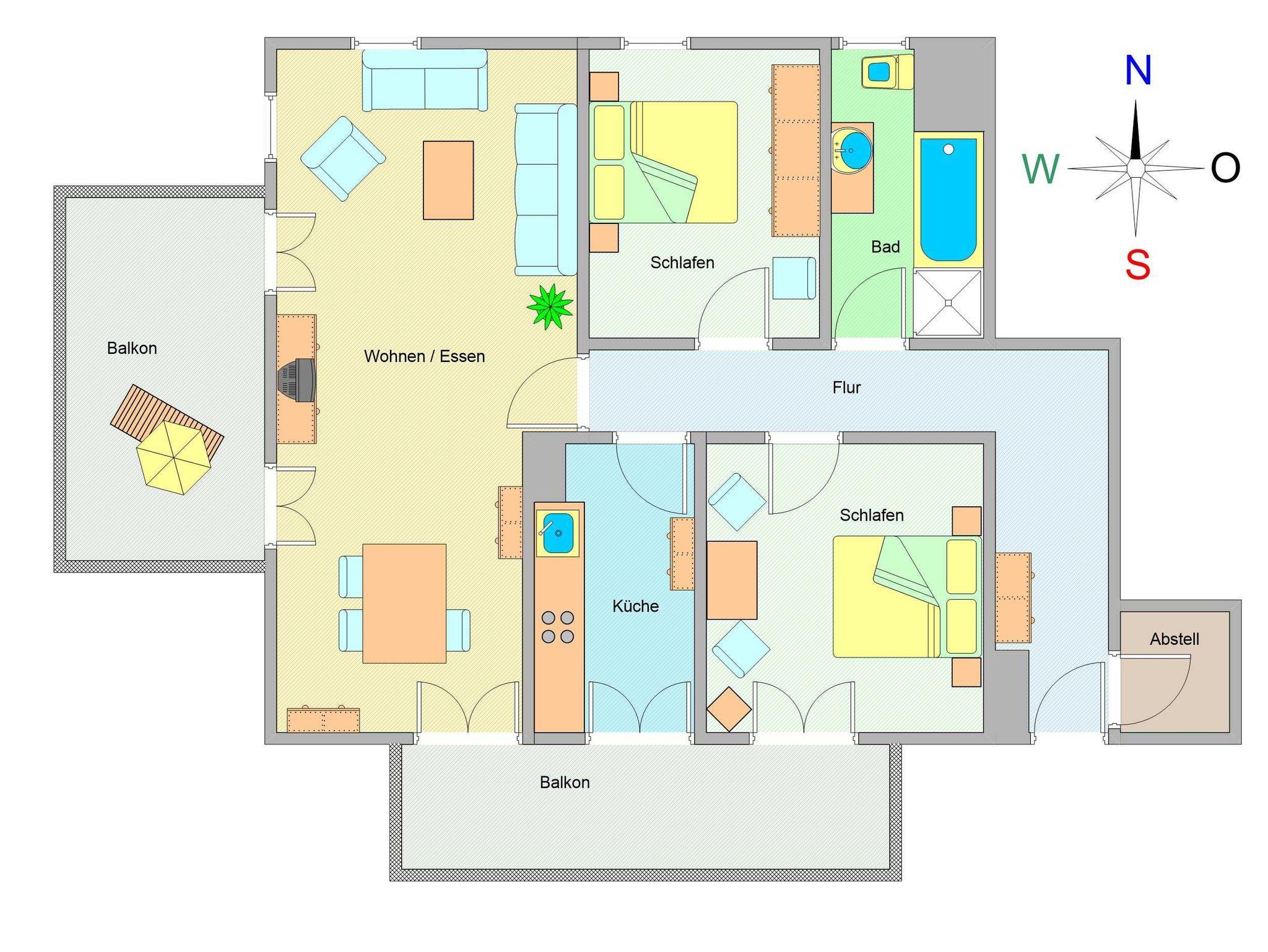 Zwei gemütliche Schlafzimmer, jeweils ausgestattet mit einem Doppelbett (180 cm x 200 cm) und einem Kleiderschrank, bieten ausreichend Platz für erholsame Nächte. Eines der Schlafzimmer ist nach Süden ausgerichtet und hat direkten Zugang zum sonnigen Südbalkon, während das zweite Schlafzimmer mit einem Fenster nach Norden ruhig gelegen ist. Das Tageslichtbad mit Badewanne, separater Dusche und WC vervollständigt das komfortable Gesamtbild dieser Wohnung. Zusätzlich steht ein kleiner Abstellraum zur Verfügung, der praktischen Stauraum bietet.