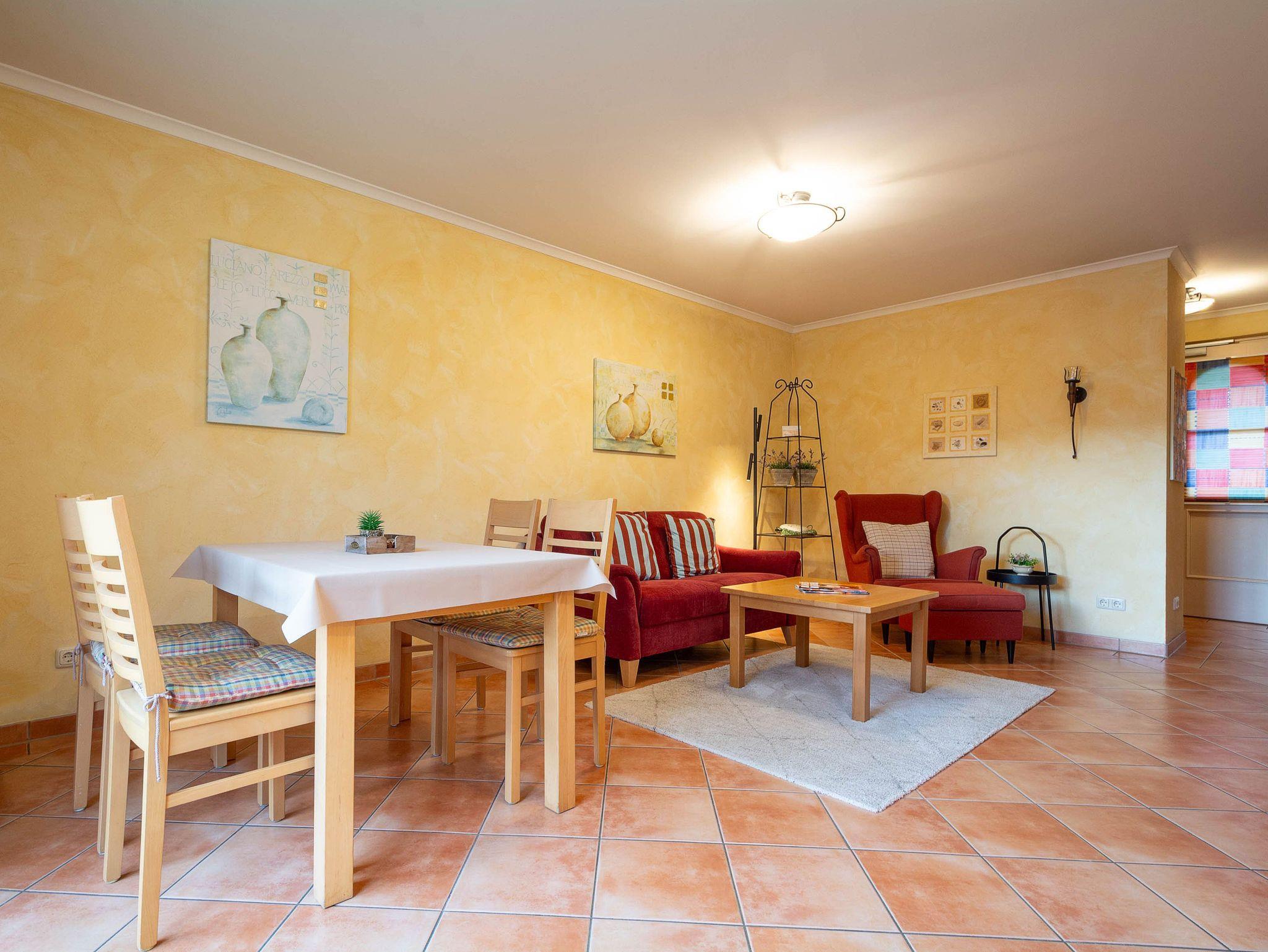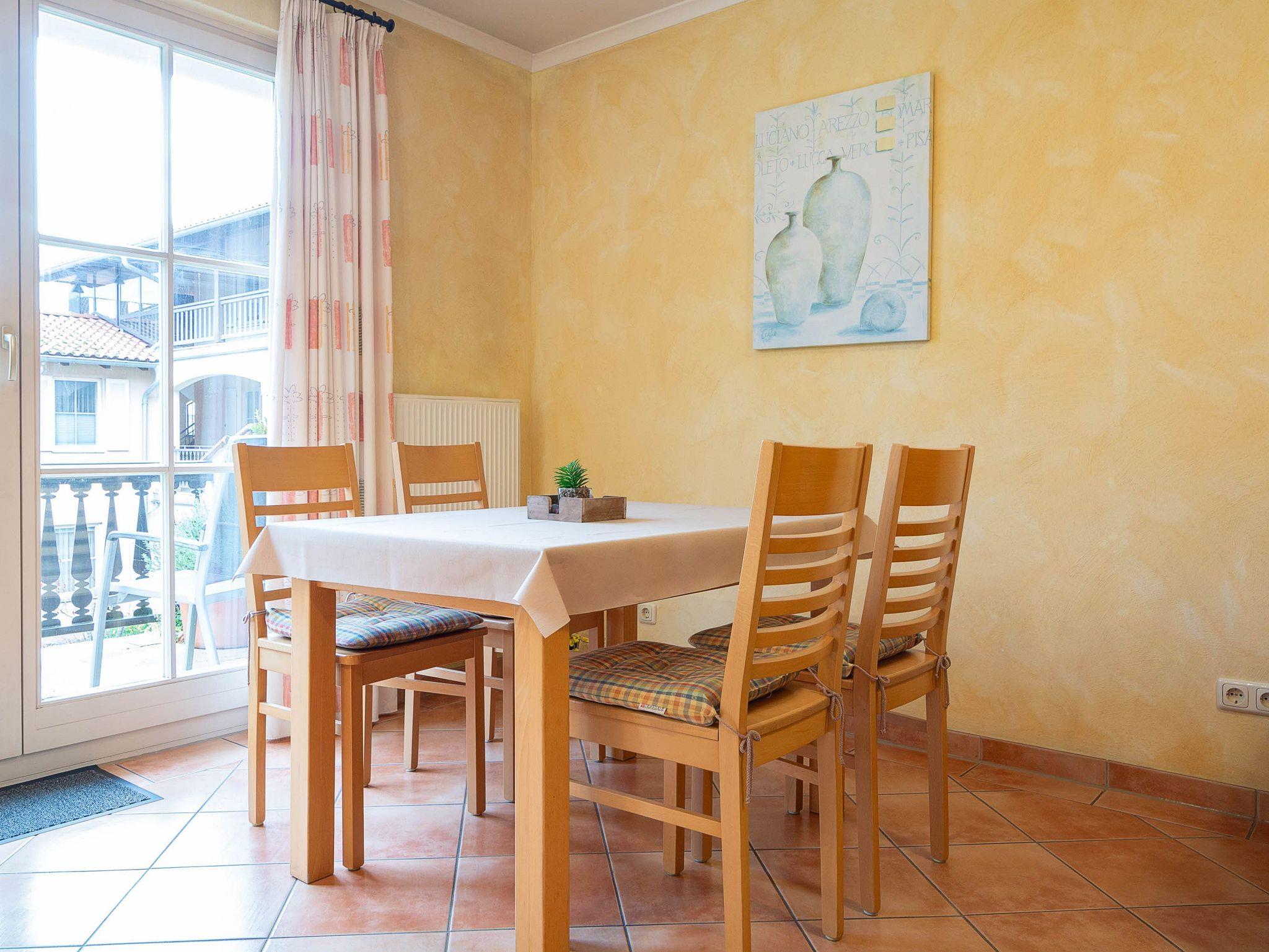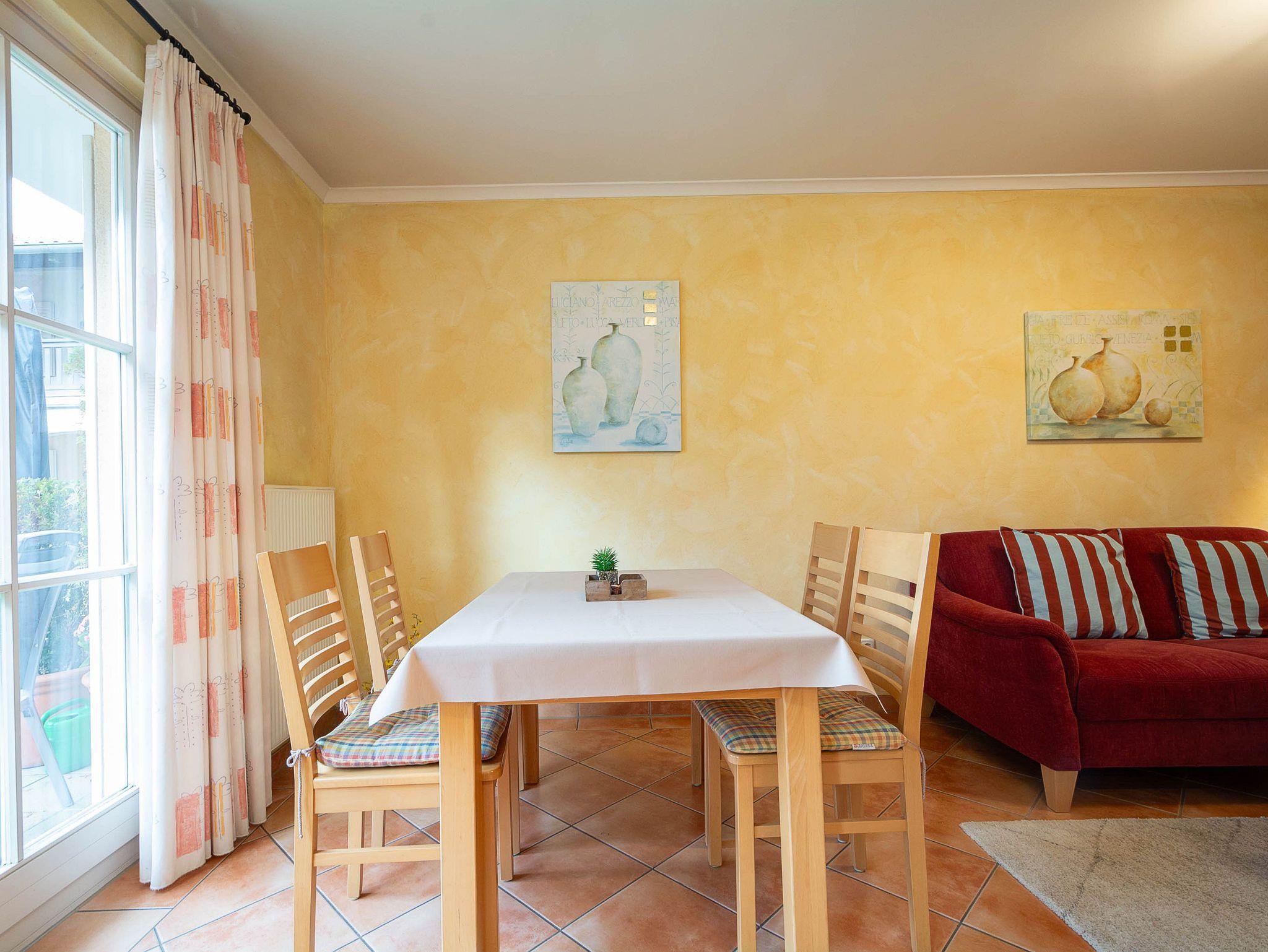 Herzlich willkommen in der wunderschönen hellen und mediterranen Ferienwohnung Nr. 30 in der Residenz Laguna. Die etwa 56 qm große 2-Raum-Ferienwohnung ist für 2 Personen optimal geeignet und befindet sich im Hinterhaus der Appartementanlage im 1. Obergeschoss. Es empfängt Sie ein heller offener mediterran gefliester Wohnraum mit Zugang zum großzügig gestalteten Südbalkon. Der möblierte Balkon mit Blick auf die mediterrane Wasserlandschaft im Innenhof des Hauses lädt zum Relaxen, Sonnenbaden und Verweilen ein. Hier können Sie Ihren Abend nach einem langen Tag an der Ostsee zu einem Gläschen Wein ausklingen lassen. Der Wohnraum bietet Ihnen eine bequeme Couchgarnitur, einen Esstisch, ein Flachbild-TV sowie eine Stereoanlage und grenzt an die offene Küchenzeile. Die Küche ist ausgestattet mit allen wichtigen Küchengeräten und -utensilien, die Sie für Ihr „perfektes Dinner“ benötigen: 4-Platten-Cerankochfeld mit Backofen und Dunstabzug, Geschirrspülmaschine, Kaffeemaschine, Wasserkocher und Toaster sowie ausreichend Geschirr, Besteck, Töpfe etc. sind vorhanden. Der großzügige helle Schlafraum mit Blick auf den wunderschönen Innenhof bietet Ihnen ein Doppelbett, einen großzügigen Kleiderschrank für Ihre Urlaubsgarderobe, eine Kommode zur Ablage wichtiger Urlaubsutensilien, einen Spiegel sowie 2 Stühle zum Ablegen Ihrer Kleidung oder Ihrer Taschen. Im gefliesten Tageslichtbad mit Dusche und WC können Sie Ihre Handtücher auf dem Handtuchheizkörper kuschlig warm vorwärmen.
