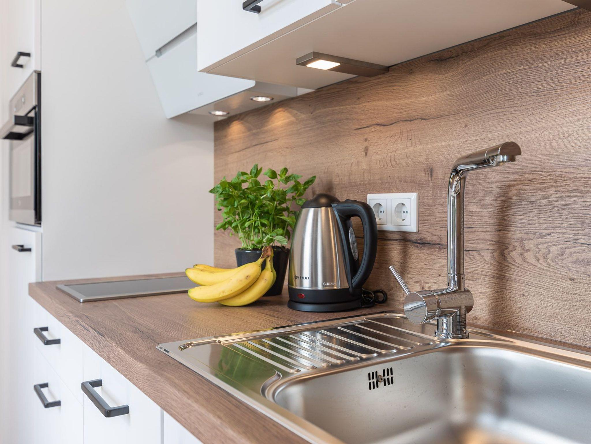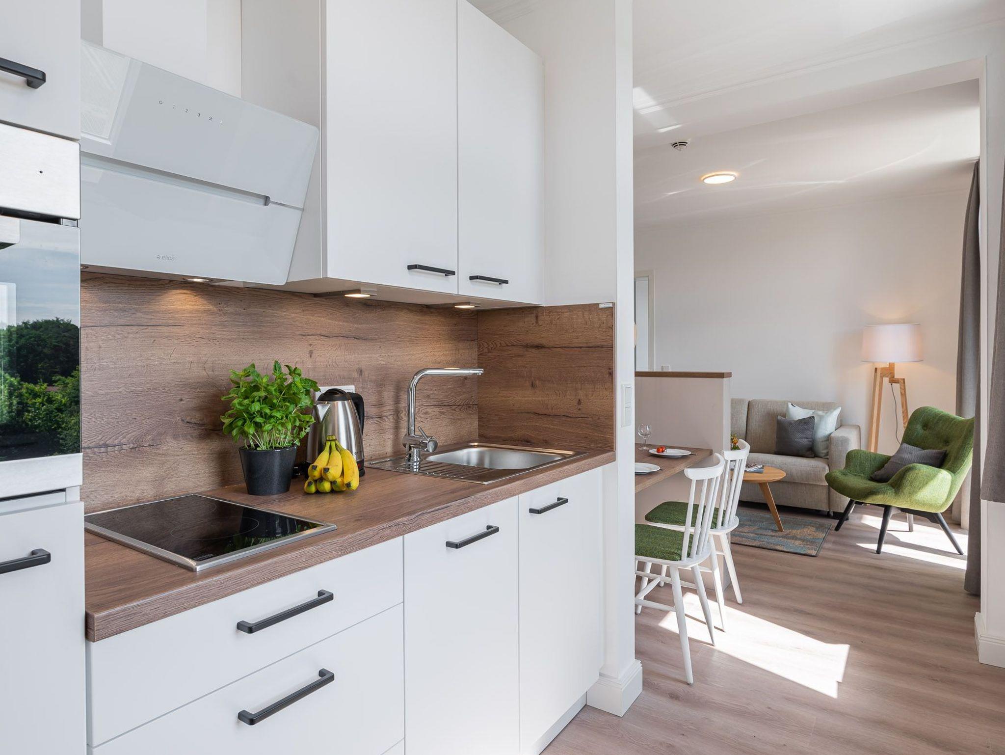 Das Bad verfügt über eine Dusche, einem Haartrockner und einem Handtuchtrockner. Zu Ihrem Apartment gehört ebenfalls ein großer und lichtdurchfluteter Wohn- und Essbereich mit offener Küche.