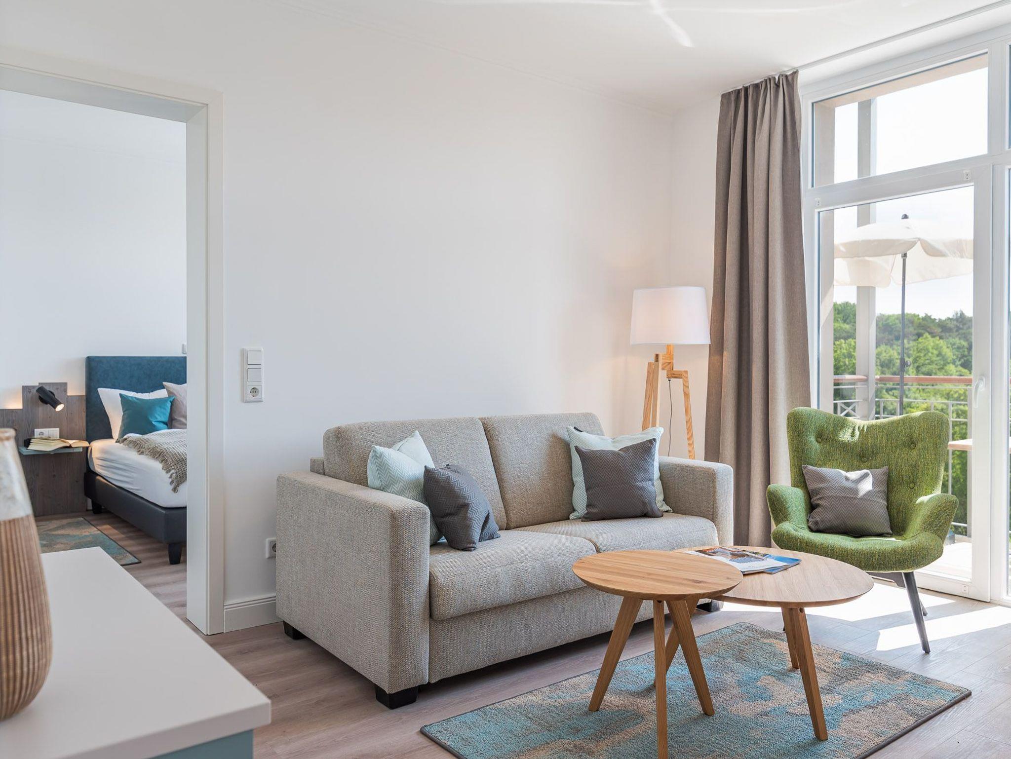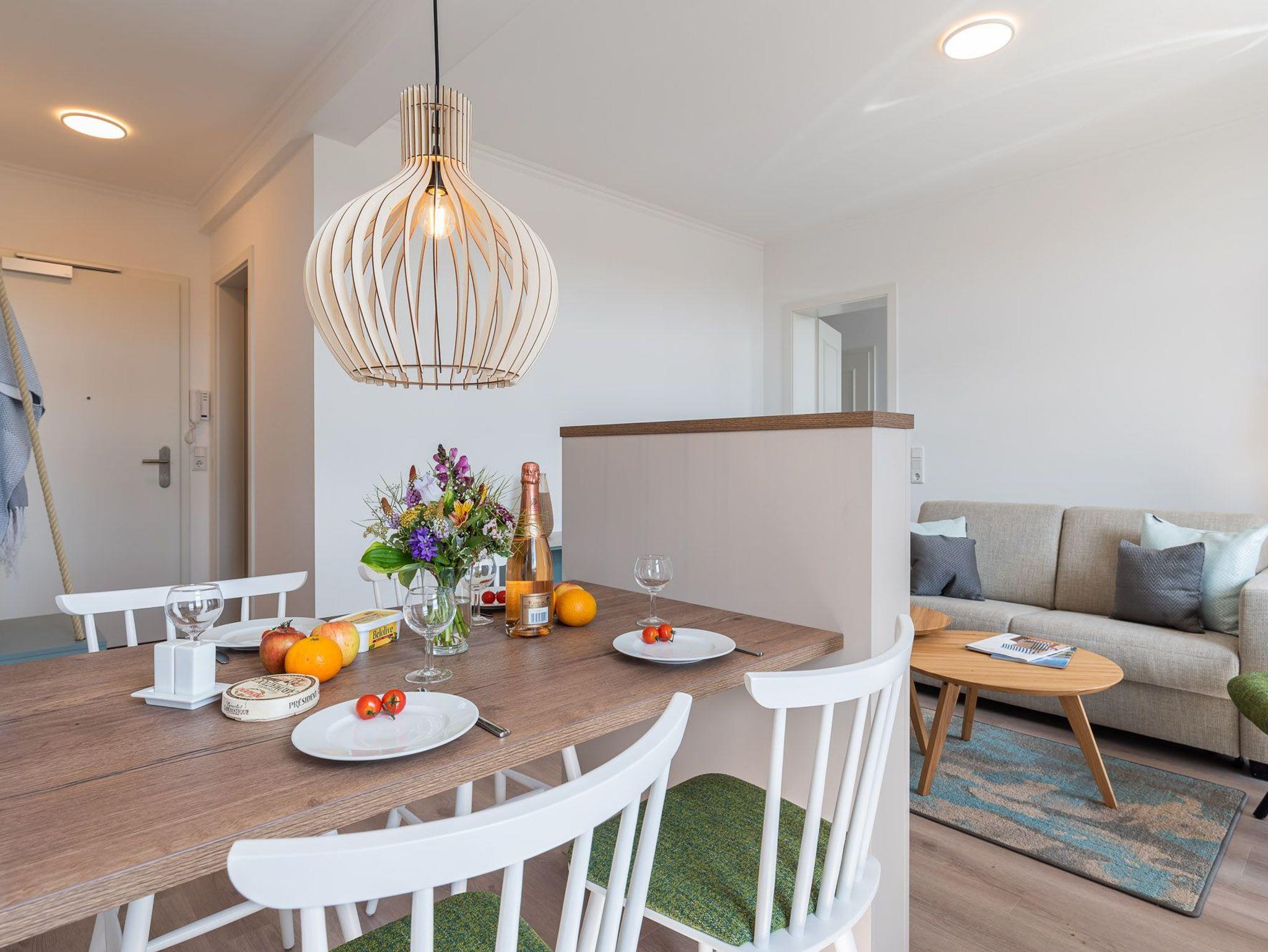 Das Apartment bietet mit seinen zwei Zimmern genügend Platz für 4 Personen. Außerdem verfügt es neben seiner Wohnfläche von ca. 43 qm auch über einen Balkon. Dieser ist mit Balkonmöbeln und einem Sonnenschirm ausgestattet.