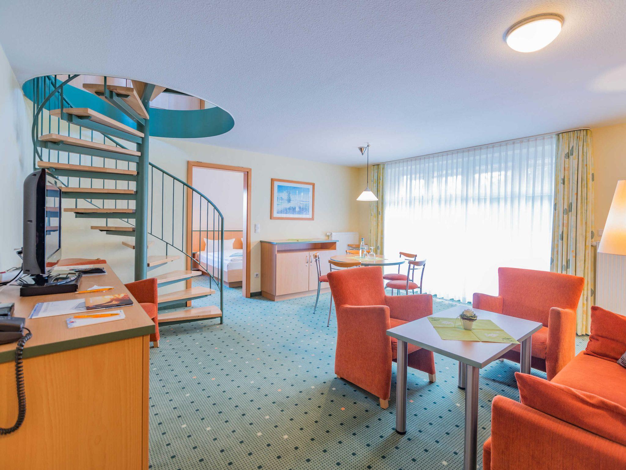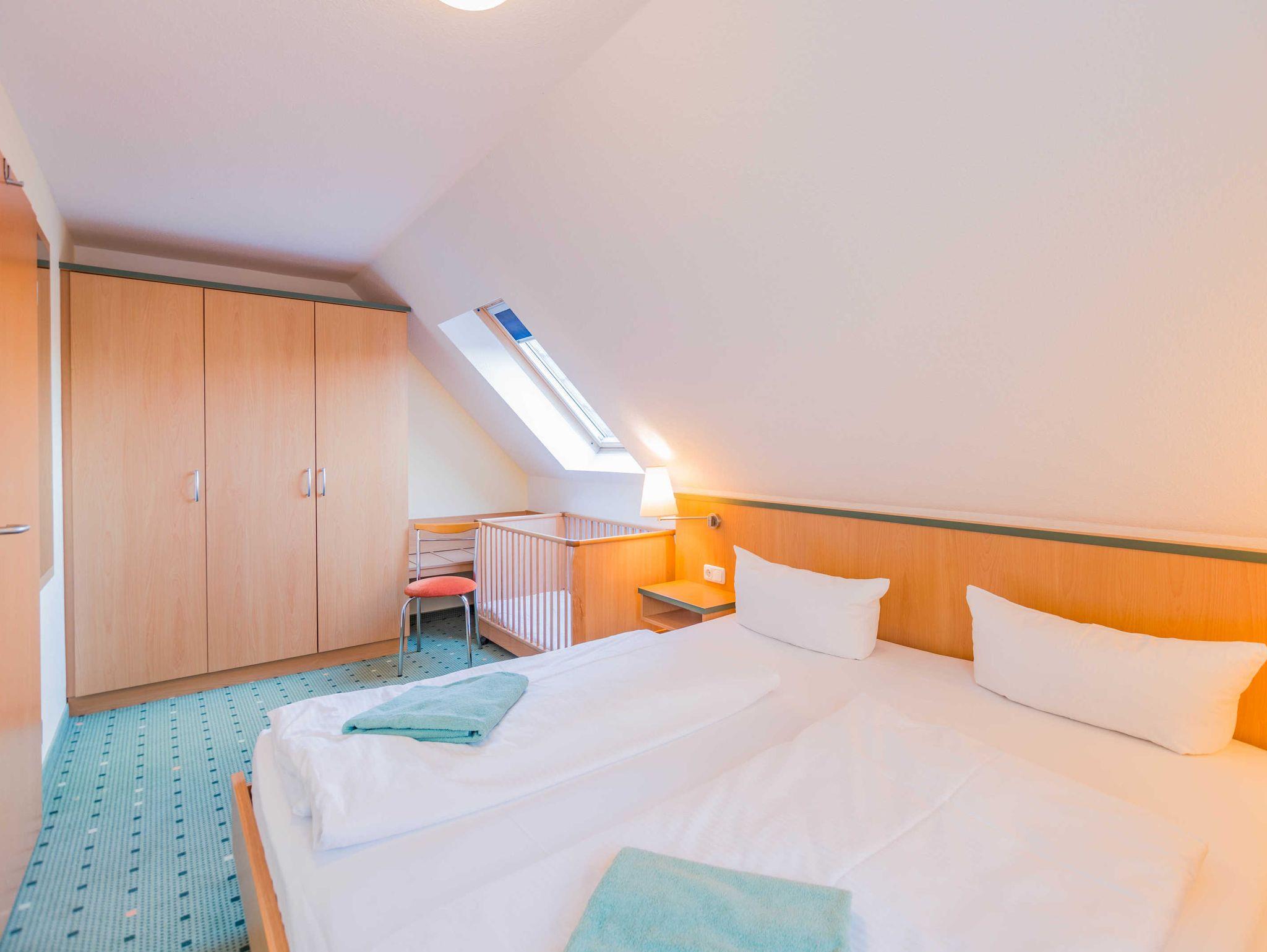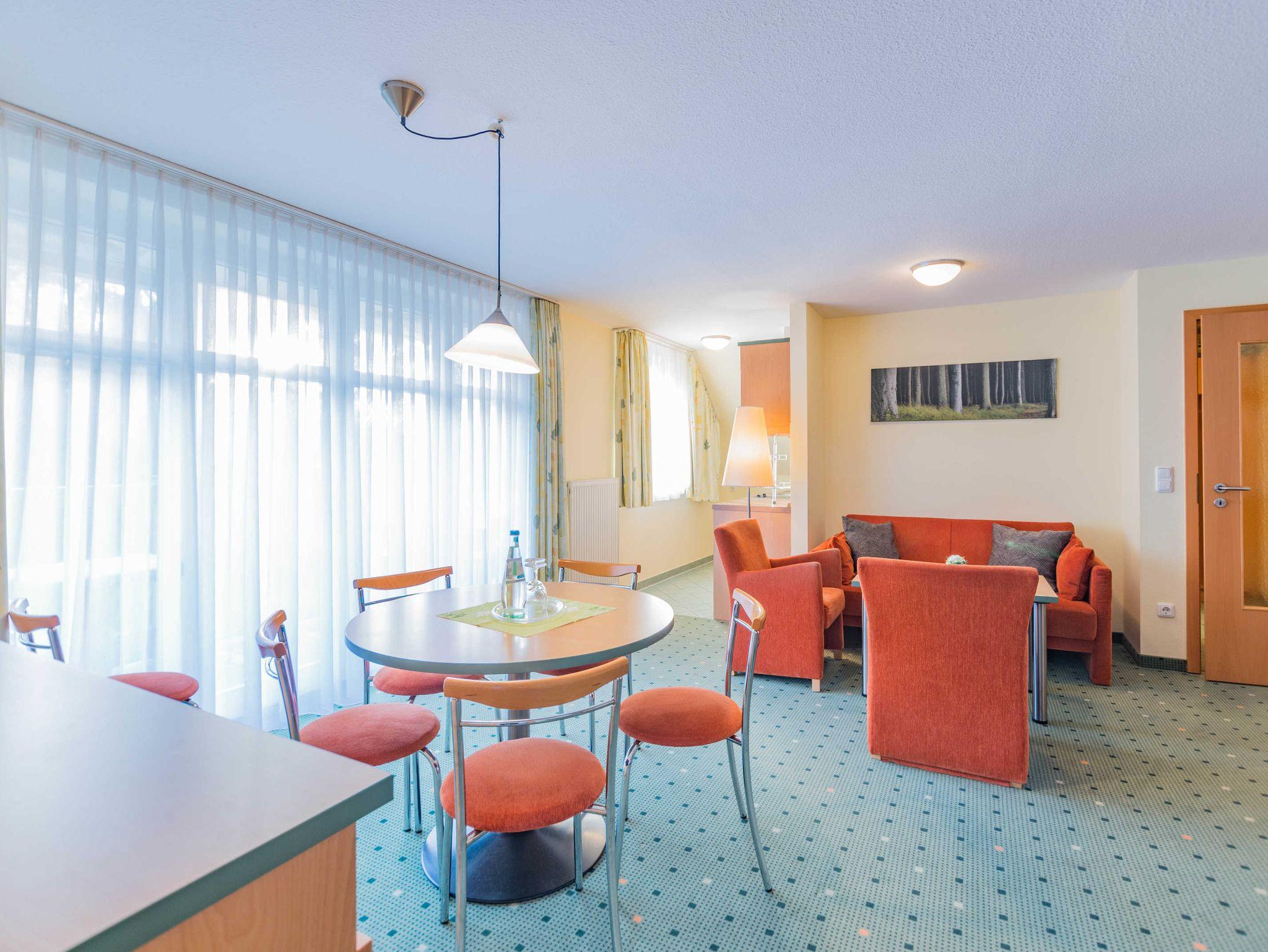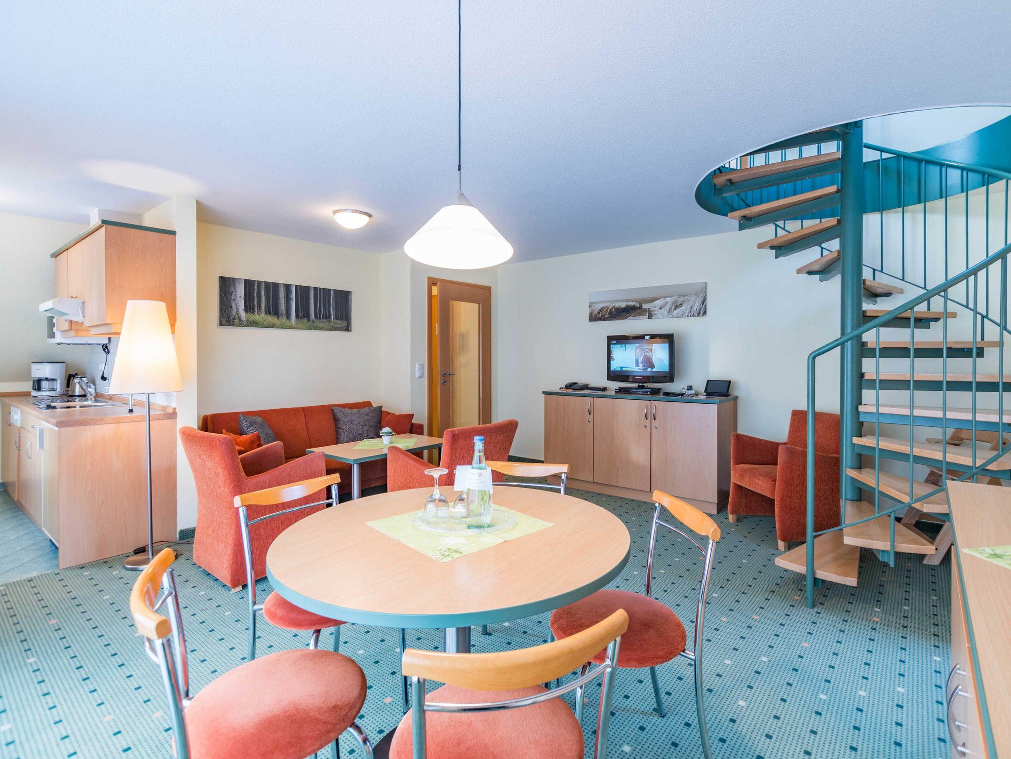 Das 4-Zimmer-Maisonette-Apartment mit Teppichboden befindet sich im 3. Obergeschoss des Apartmenthauses Waldeck. Mit rund 80 m² Wohnfläche und einem Balkon zur Südseite mit Blick zum Stadtwald (sehr ruhige Lage), besteht das geräumige Apartment aus einem Wohnzimmer mit Schlafcouch, einem Esstisch und einer voll ausgestatteten Küchenzeile mit Geschirrspülmaschine, Kühlschrank, Mikrowelle, Zwei-Platten-Cerankochfeld, Kaffeemaschine, Wasserkocher und einem Toaster. Ein Schlafzimmer mit Doppelbett befindet sich in der unteren Etage. Zwei weitere Schlafräume mit zwei Einzelbetten und einem Doppelbett, befinden sich durch eine Wendeltreppe zugänglich, in der oberen Etage des Apartments. Sowohl im Wohnzimmer als auch in einem der beiden oberen Schlafzimmer, befindet sich ein Flachbildschirm. Das Apartment verfügt über zwei Bäder. Das untere Bad ist mit WC und Badewanne, das obere Bad mit WC und Dusche ausgestattet. Für bis zu sechs Personen ist dieses Apartment geeignet.