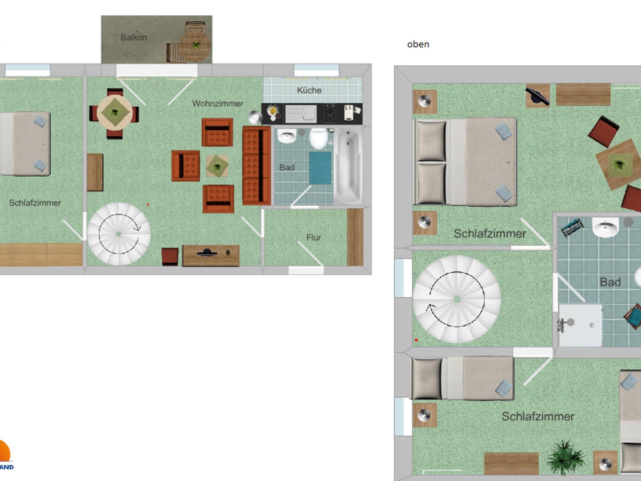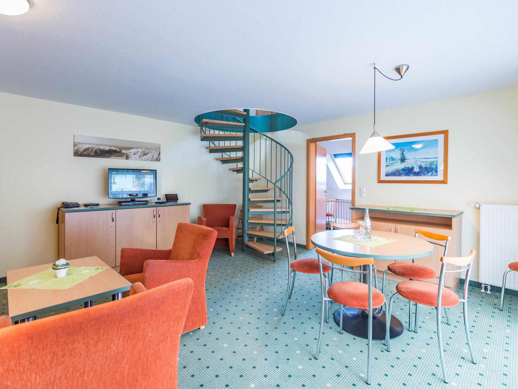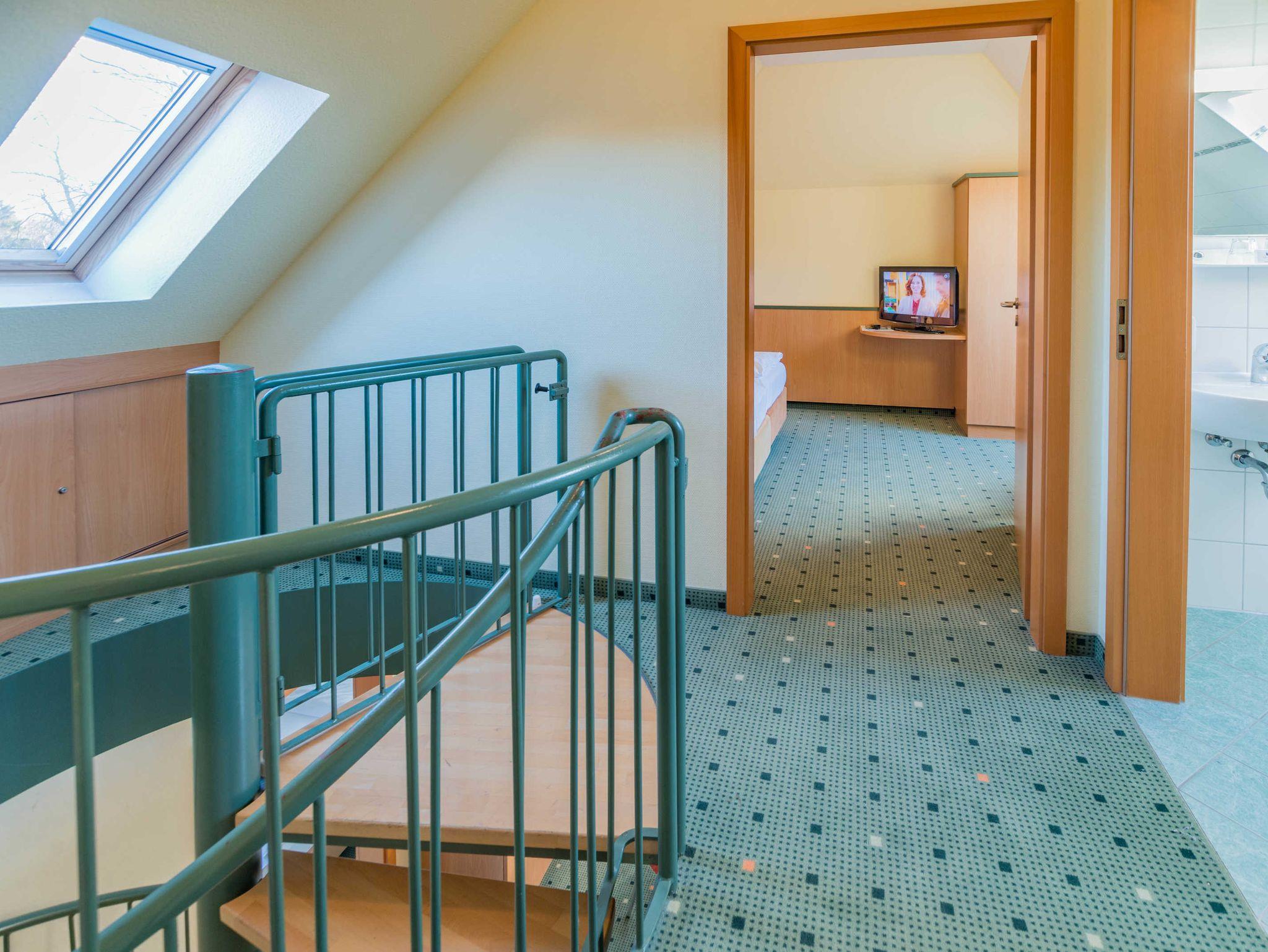 Das 4-Zimmer-Maisonette-Apartment mit Teppichboden befindet sich im 3. Obergeschoss des Apartmenthauses Waldeck. Mit rund 80 m² Wohnfläche und einem Balkon zur Südseite mit Blick zum Stadtwald (sehr ruhige Lage), besteht das geräumige Apartment aus einem Wohnzimmer mit Schlafcouch, einem Esstisch und einer voll ausgestatteten Küchenzeile mit Geschirrspülmaschine, Kühlschrank, Mikrowelle, Zwei-Platten-Cerankochfeld, Kaffeemaschine, Wasserkocher und einem Toaster. Ein Schlafzimmer mit Doppelbett befindet sich in der unteren Etage. Zwei weitere Schlafräume mit zwei Einzelbetten und einem Doppelbett, befinden sich durch eine Wendeltreppe zugänglich, in der oberen Etage des Apartments. Sowohl im Wohnzimmer als auch in einem der beiden oberen Schlafzimmer, befindet sich ein Flachbildschirm. Das Apartment verfügt über zwei Bäder. Das untere Bad ist mit WC und Badewanne, das obere Bad mit WC und Dusche ausgestattet. Für bis zu sechs Personen ist dieses Apartment geeignet.