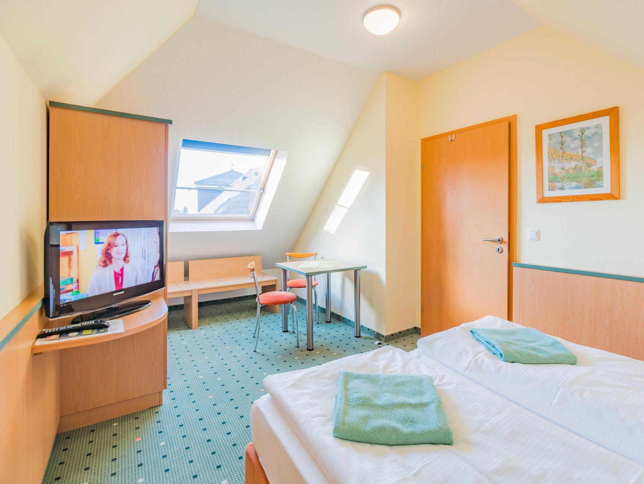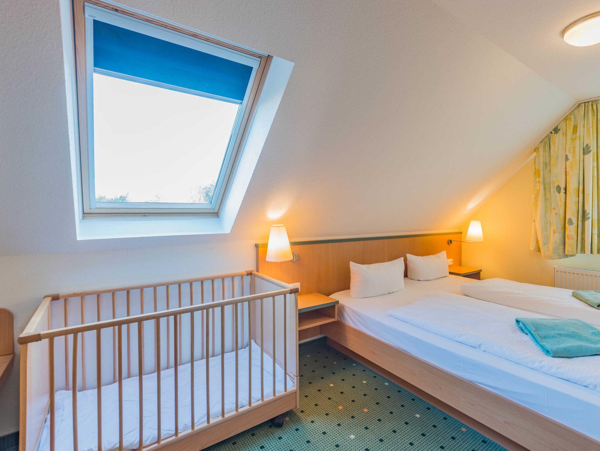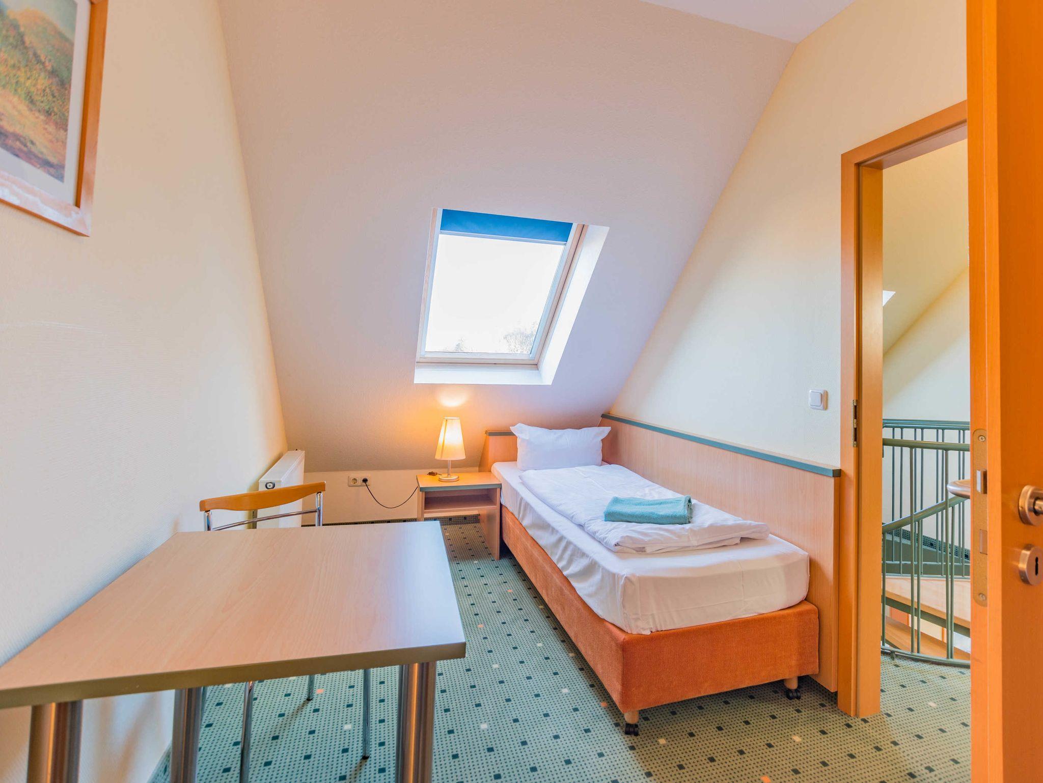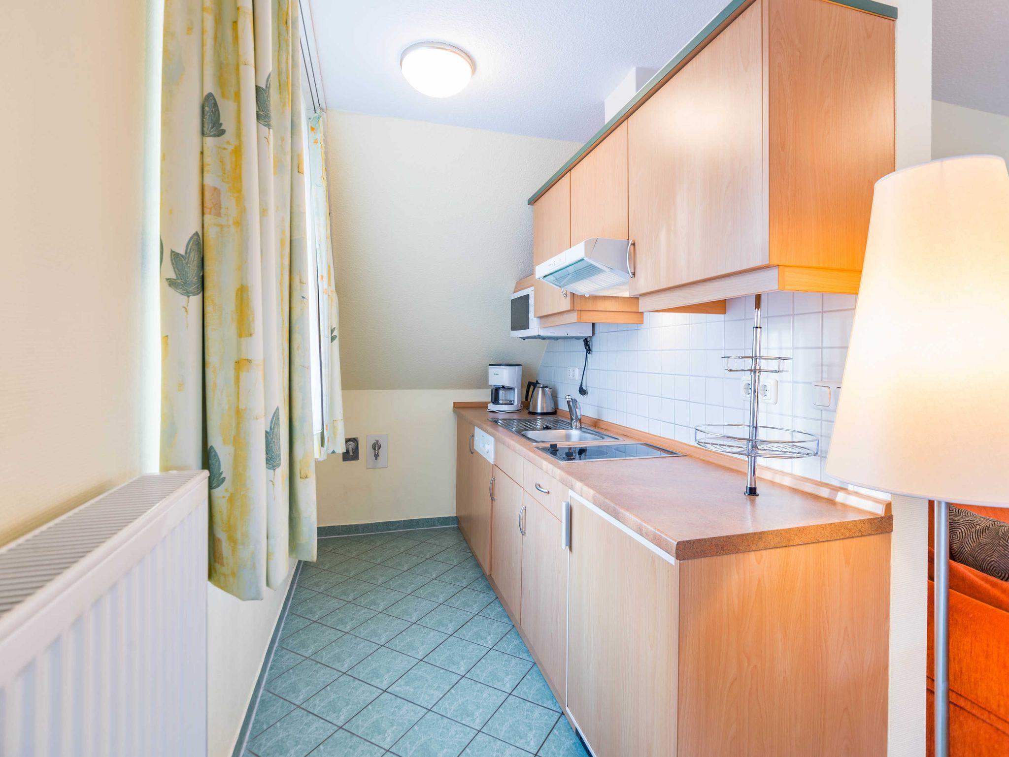 Das 4-Zimmer-Maisonette-Apartment mit Teppichboden befindet sich im 3. Obergeschoss des Apartmenthauses Waldeck. Mit rund 80 m² Wohnfläche und einem Balkon zur Südseite mit Blick zum Stadtwald (sehr ruhige Lage), besteht das geräumige Apartment aus einem Wohnzimmer mit Schlafcouch, einem Esstisch und einer voll ausgestatteten Küchenzeile mit Geschirrspülmaschine, Kühlschrank, Mikrowelle, Zwei-Platten-Cerankochfeld, Kaffeemaschine, Wasserkocher und einem Toaster. Ein Schlafzimmer mit Doppelbett befindet sich in der unteren Etage. Zwei weitere Schlafräume mit zwei Einzelbetten und einem Doppelbett, befinden sich durch eine Wendeltreppe zugänglich, in der oberen Etage des Apartments. Sowohl im Wohnzimmer als auch in einem der beiden oberen Schlafzimmer, befindet sich ein Flachbildschirm. Das Apartment verfügt über zwei Bäder. Das untere Bad ist mit WC und Badewanne, das obere Bad mit WC und Dusche ausgestattet. Für bis zu sechs Personen ist dieses Apartment geeignet.