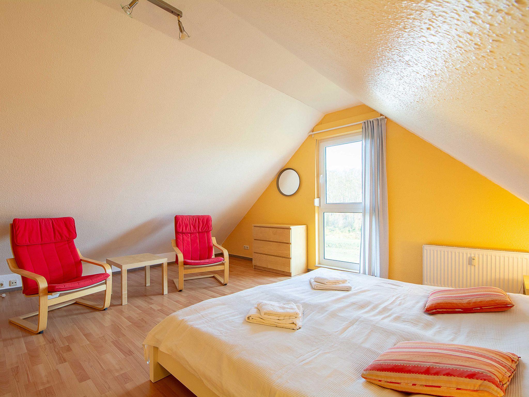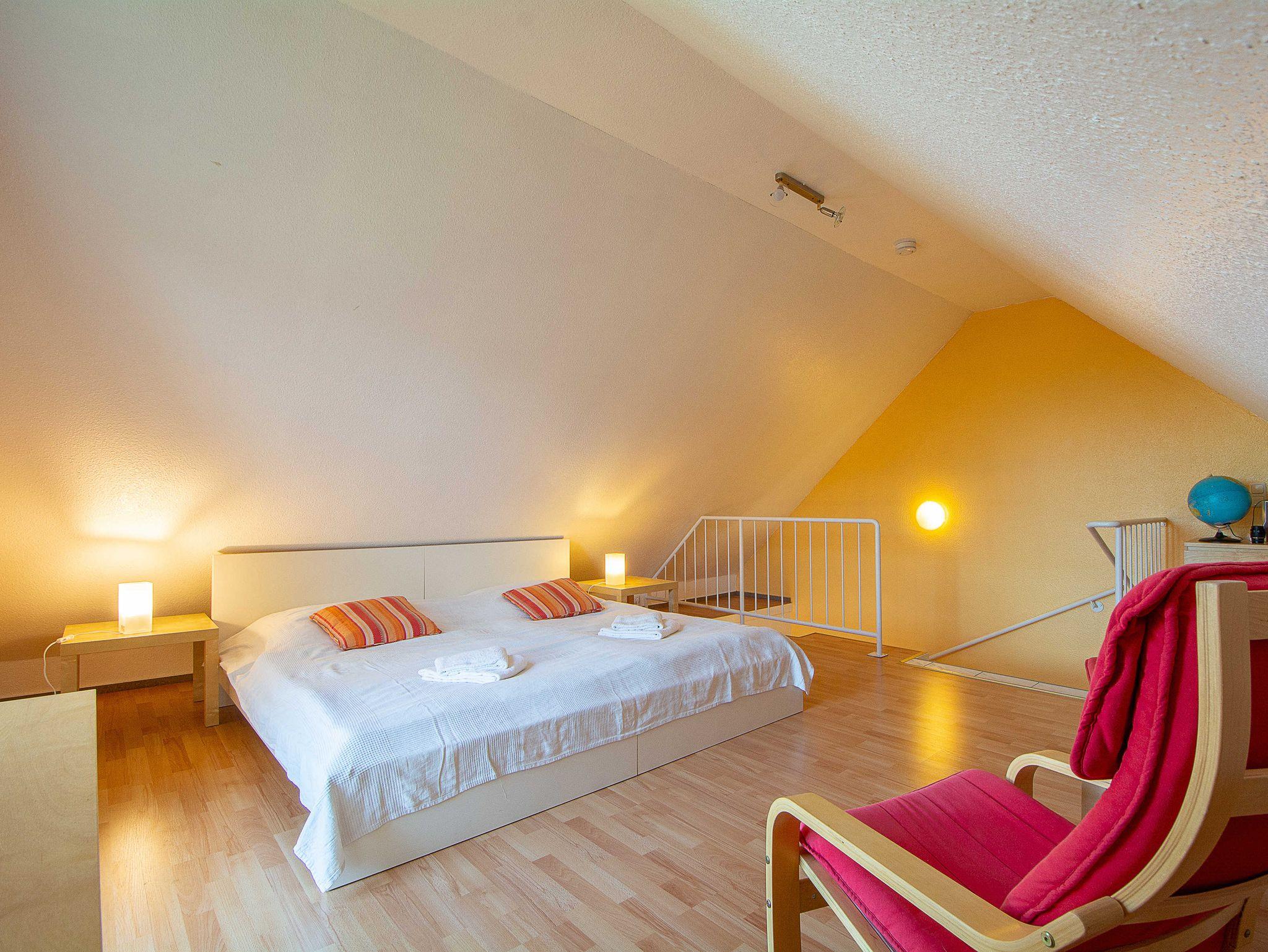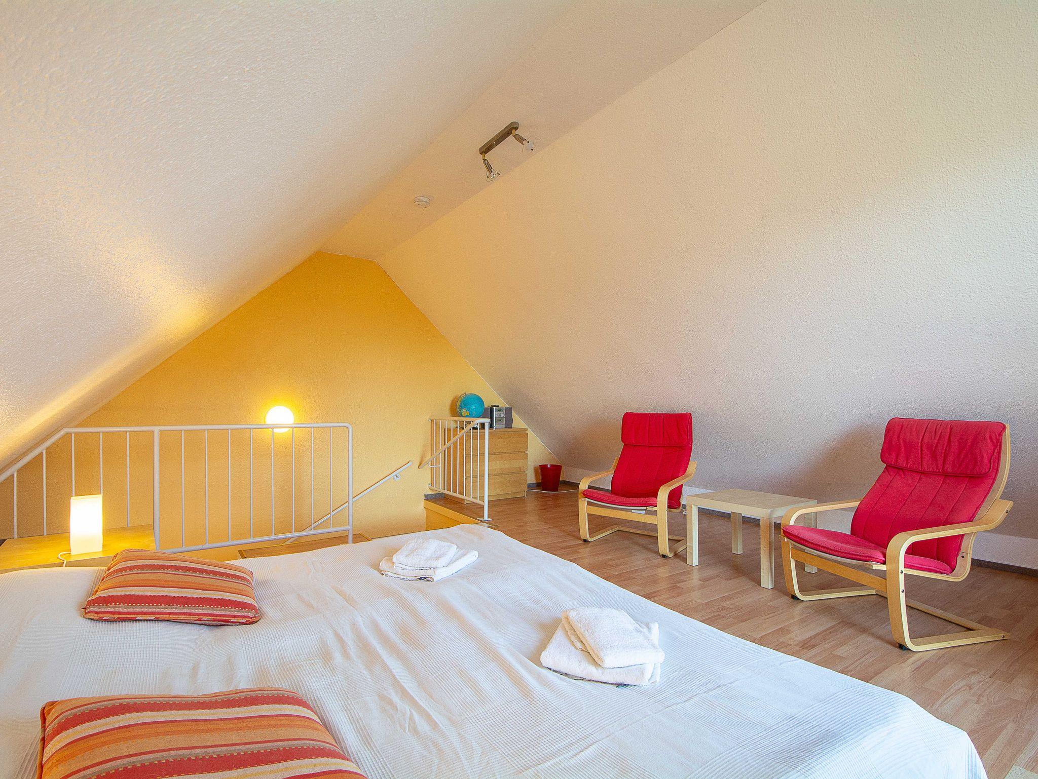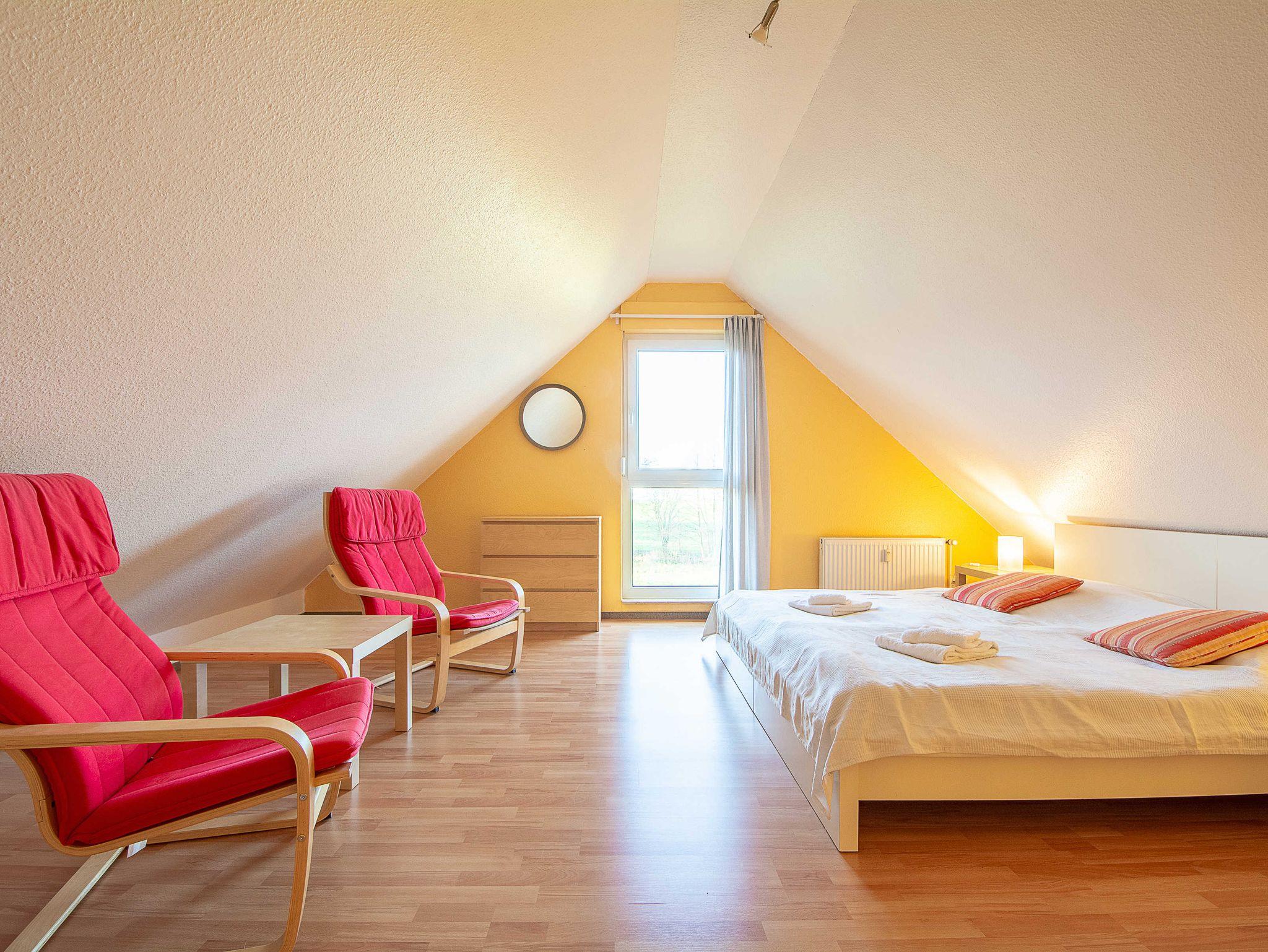 Sie wohnen in einer geräumigen und sonnigen 3-Raum-Ferienwohnung von etwa 65 qm Größe, die sich im ersten Obergeschoss eines kleinen Appartementhauses mit nur 4 Wohneinheiten befindet. Die freundliche Wohnung erstreckt sich über 2 Etagen und ist für 2-5 Personen geeignet. Der helle offene Wohnraum begrüßt Sie mit einem offenen Essbereich, einer gemütlichen Couchgarnitur, die Sie auch als Schlafsofa umfunktionieren können (190x120cm, für die 5. Person), einem Flachbild-Fernseher, DVD-Player und einer Hifi-Anlage. Die offene Küchenzeile ist voll ausgestattet mit allen wichtigen Küchengeräten, die Sie für einen perfekten Urlaub benötigen (Herd mit Cerankochfeld und Backofen, Dunstabzugshaube, Geschirrspüler, Mikrowelle, Kühlschrank, Kaffeemaschine, Wasserkocher, Toaster etc.). Vom Wohnraum betreten Sie den nach Süden ausgerichteten Balkon mit Blick auf den angrenzenden Garten sowie über Wiesen und Felder. Ein großzügiges Schlafzimmer mit Doppelbett und geräumigen Kleiderschrank, das Tageslichbad mit Duschwanne und WC sowie ein separates Gäste-WC befinden sich ebenfalls auf dieser Etage. Im gemütlichen Dachgeschoss befindet sich ein großes Schlafzimmer, das offen gestaltet und mit einem Doppelbett und einer gemütlichen Sitzecke ausgestattet ist. Ein Kinderhochstuhl gehört zur Ausstattung der Wohnung.