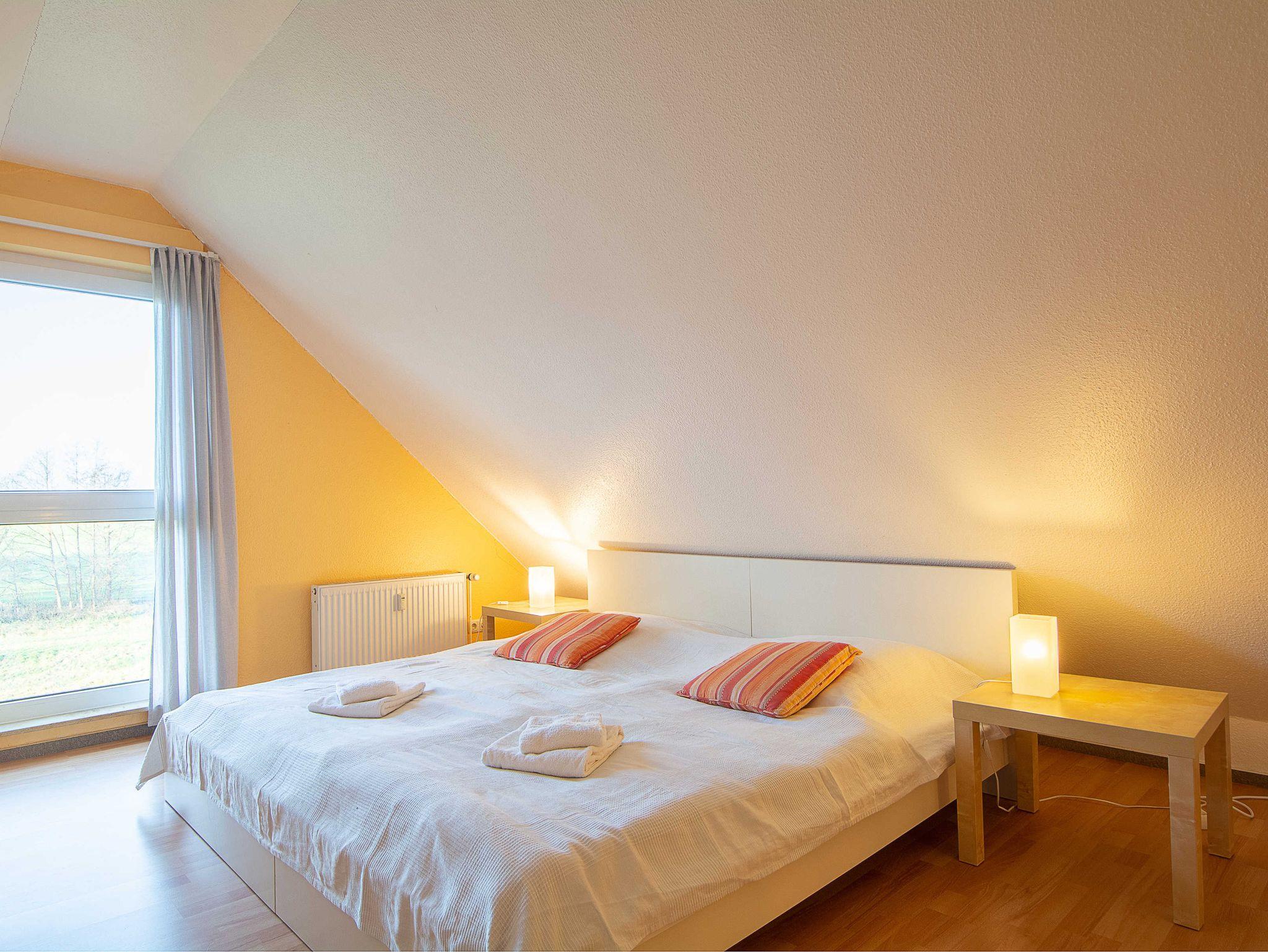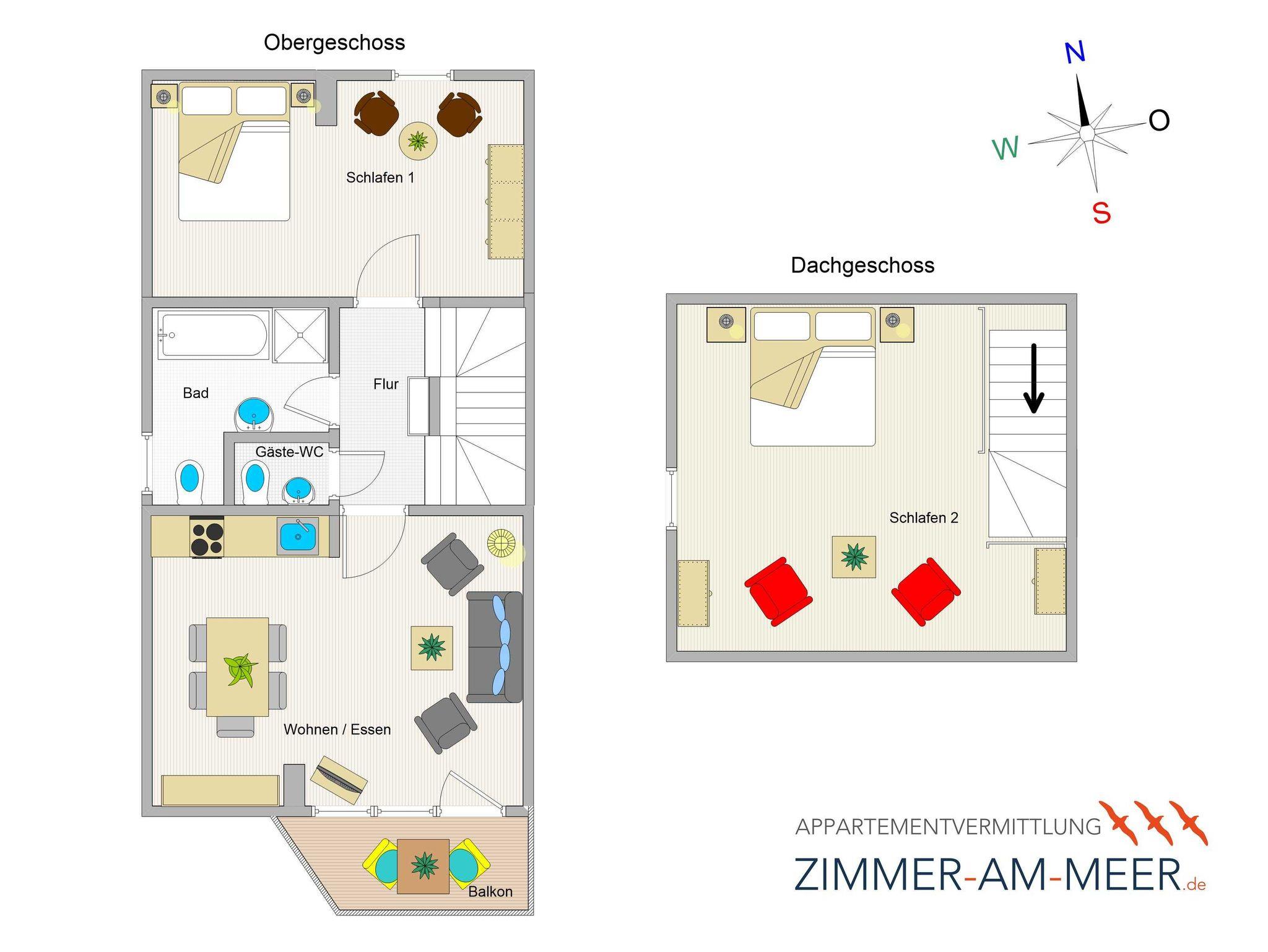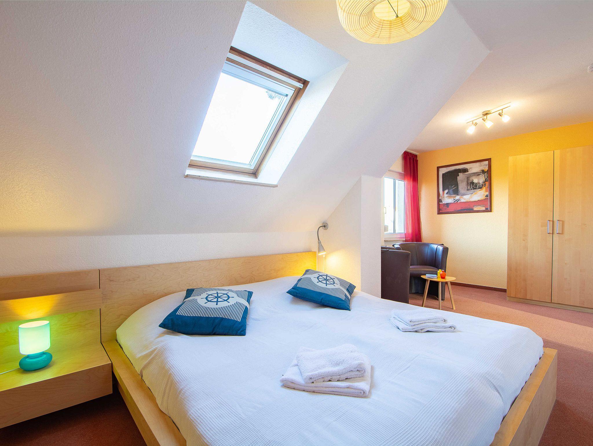 Sie wohnen in einer geräumigen und sonnigen 3-Raum-Ferienwohnung von etwa 65 qm Größe, die sich im ersten Obergeschoss eines kleinen Appartementhauses mit nur 4 Wohneinheiten befindet. Die freundliche Wohnung erstreckt sich über 2 Etagen und ist für 2-5 Personen geeignet. Der helle offene Wohnraum begrüßt Sie mit einem offenen Essbereich, einer gemütlichen Couchgarnitur, die Sie auch als Schlafsofa umfunktionieren können (190x120cm, für die 5. Person), einem Flachbild-Fernseher, DVD-Player und einer Hifi-Anlage. Die offene Küchenzeile ist voll ausgestattet mit allen wichtigen Küchengeräten, die Sie für einen perfekten Urlaub benötigen (Herd mit Cerankochfeld und Backofen, Dunstabzugshaube, Geschirrspüler, Mikrowelle, Kühlschrank, Kaffeemaschine, Wasserkocher, Toaster etc.). Vom Wohnraum betreten Sie den nach Süden ausgerichteten Balkon mit Blick auf den angrenzenden Garten sowie über Wiesen und Felder. Ein großzügiges Schlafzimmer mit Doppelbett und geräumigen Kleiderschrank, das Tageslichbad mit Duschwanne und WC sowie ein separates Gäste-WC befinden sich ebenfalls auf dieser Etage. Im gemütlichen Dachgeschoss befindet sich ein großes Schlafzimmer, das offen gestaltet und mit einem Doppelbett und einer gemütlichen Sitzecke ausgestattet ist. Ein Kinderhochstuhl gehört zur Ausstattung der Wohnung.