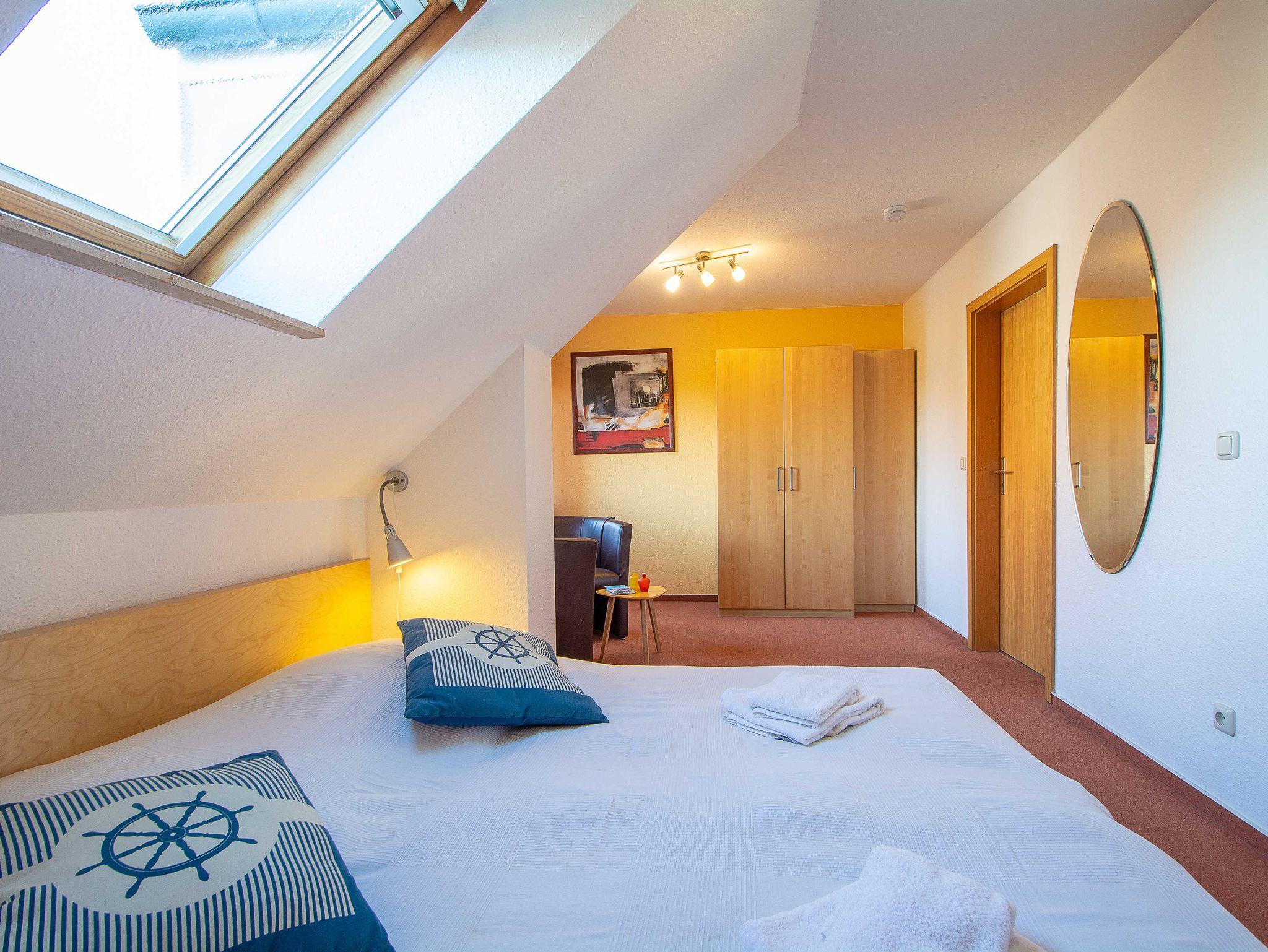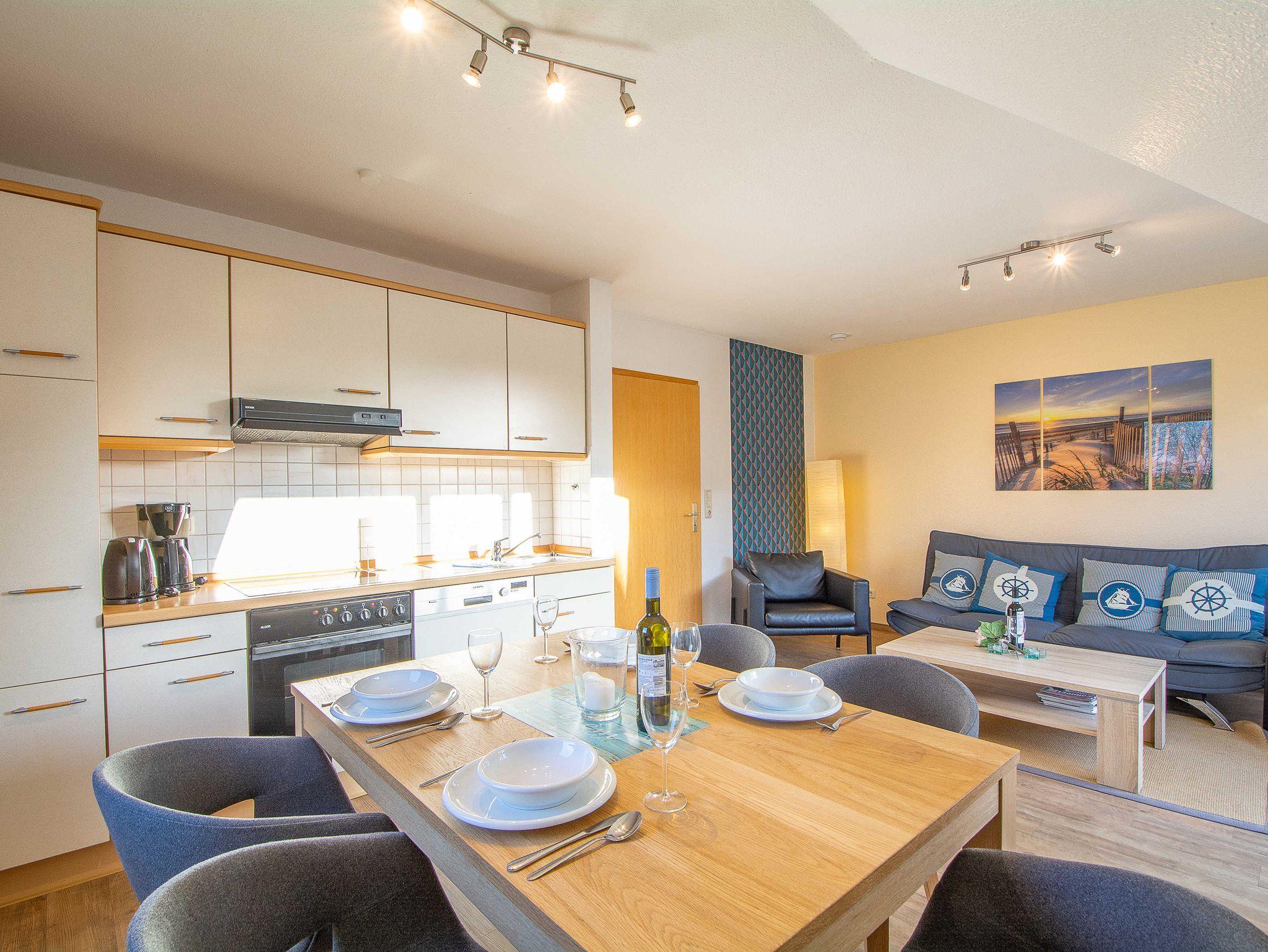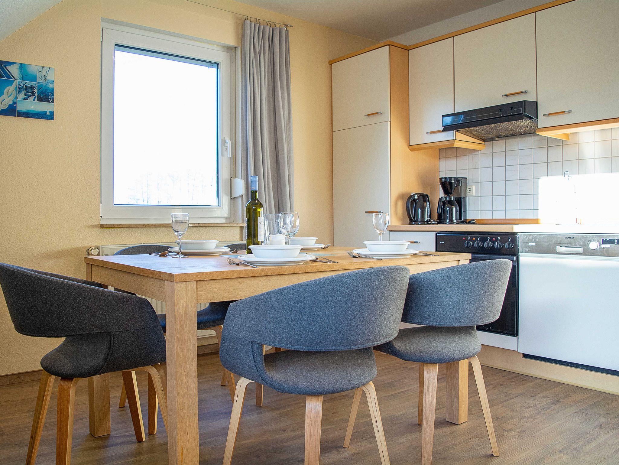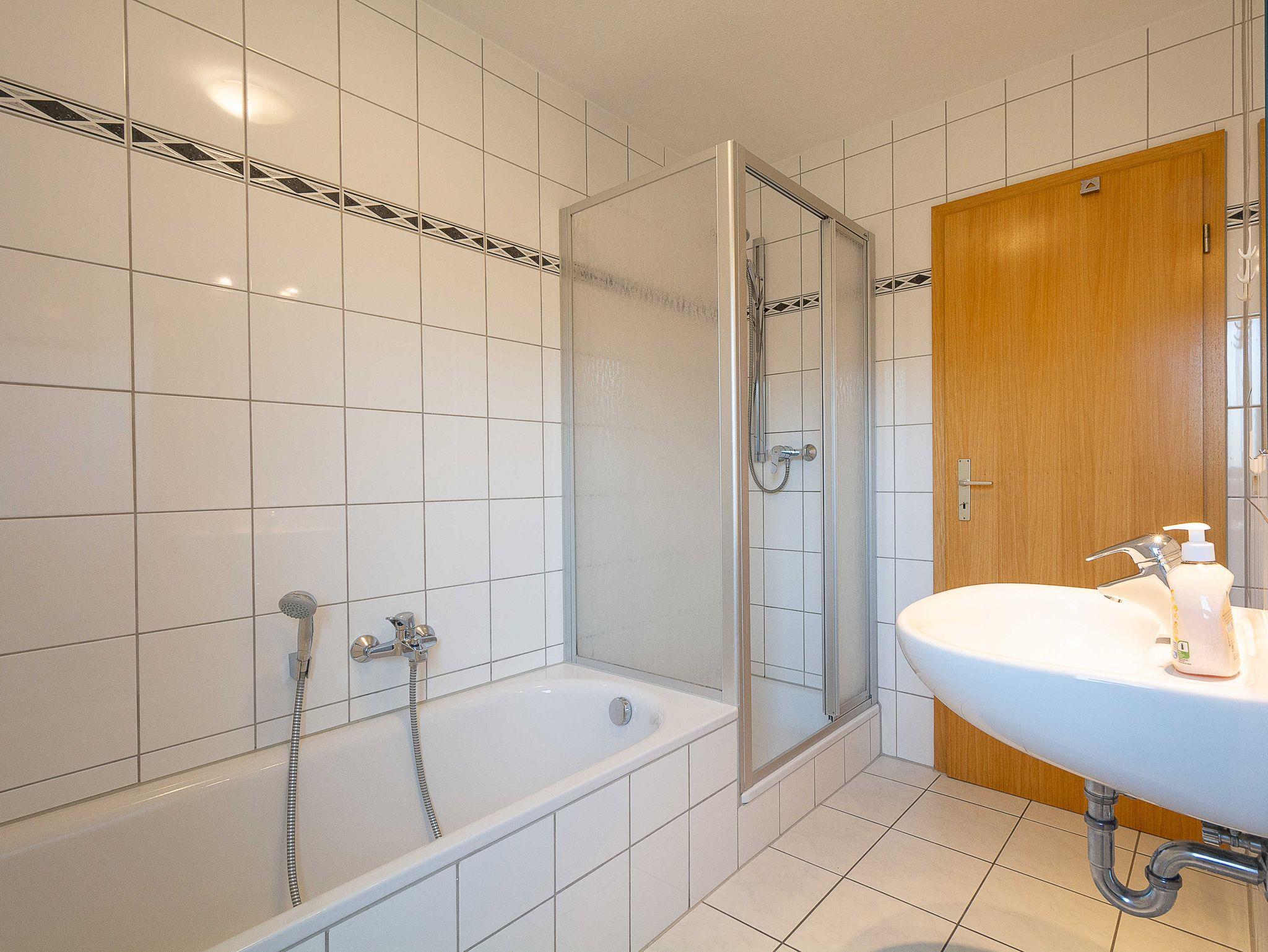 Sie wohnen in einer geräumigen und sonnigen 3-Raum-Ferienwohnung von etwa 65 qm Größe, die sich im ersten Obergeschoss eines kleinen Appartementhauses mit nur 4 Wohneinheiten befindet. Die freundliche Wohnung erstreckt sich über 2 Etagen und ist für 2-5 Personen geeignet. Der helle offene Wohnraum begrüßt Sie mit einem offenen Essbereich, einer gemütlichen Couchgarnitur, die Sie auch als Schlafsofa umfunktionieren können (190x120cm, für die 5. Person), einem Flachbild-Fernseher, DVD-Player und einer Hifi-Anlage. Die offene Küchenzeile ist voll ausgestattet mit allen wichtigen Küchengeräten, die Sie für einen perfekten Urlaub benötigen (Herd mit Cerankochfeld und Backofen, Dunstabzugshaube, Geschirrspüler, Mikrowelle, Kühlschrank, Kaffeemaschine, Wasserkocher, Toaster etc.). Vom Wohnraum betreten Sie den nach Süden ausgerichteten Balkon mit Blick auf den angrenzenden Garten sowie über Wiesen und Felder. Ein großzügiges Schlafzimmer mit Doppelbett und geräumigen Kleiderschrank, das Tageslichbad mit Duschwanne und WC sowie ein separates Gäste-WC befinden sich ebenfalls auf dieser Etage. Im gemütlichen Dachgeschoss befindet sich ein großes Schlafzimmer, das offen gestaltet und mit einem Doppelbett und einer gemütlichen Sitzecke ausgestattet ist. Ein Kinderhochstuhl gehört zur Ausstattung der Wohnung.