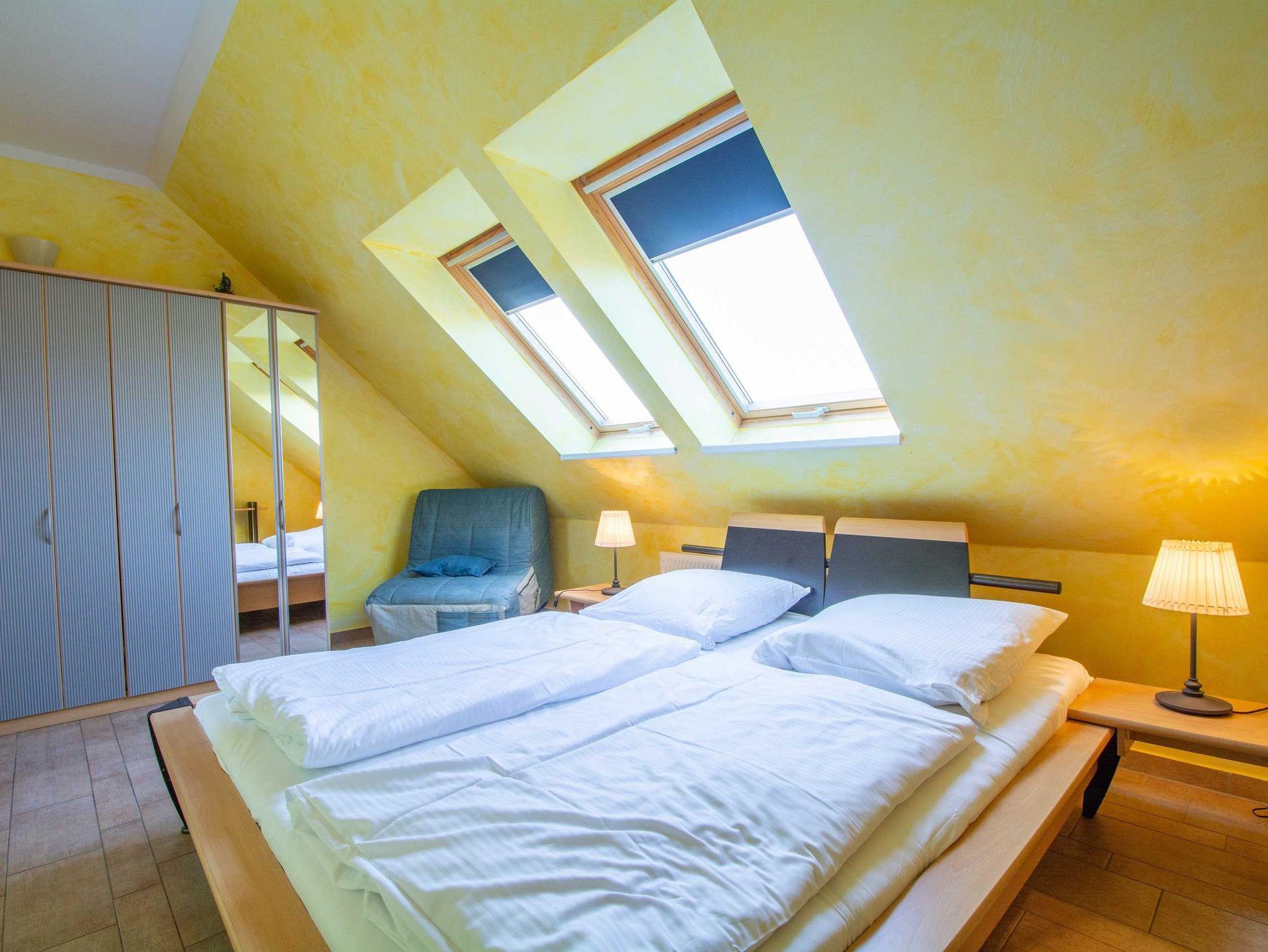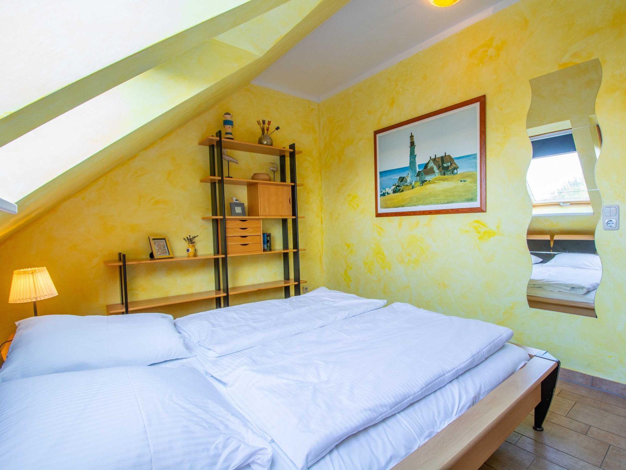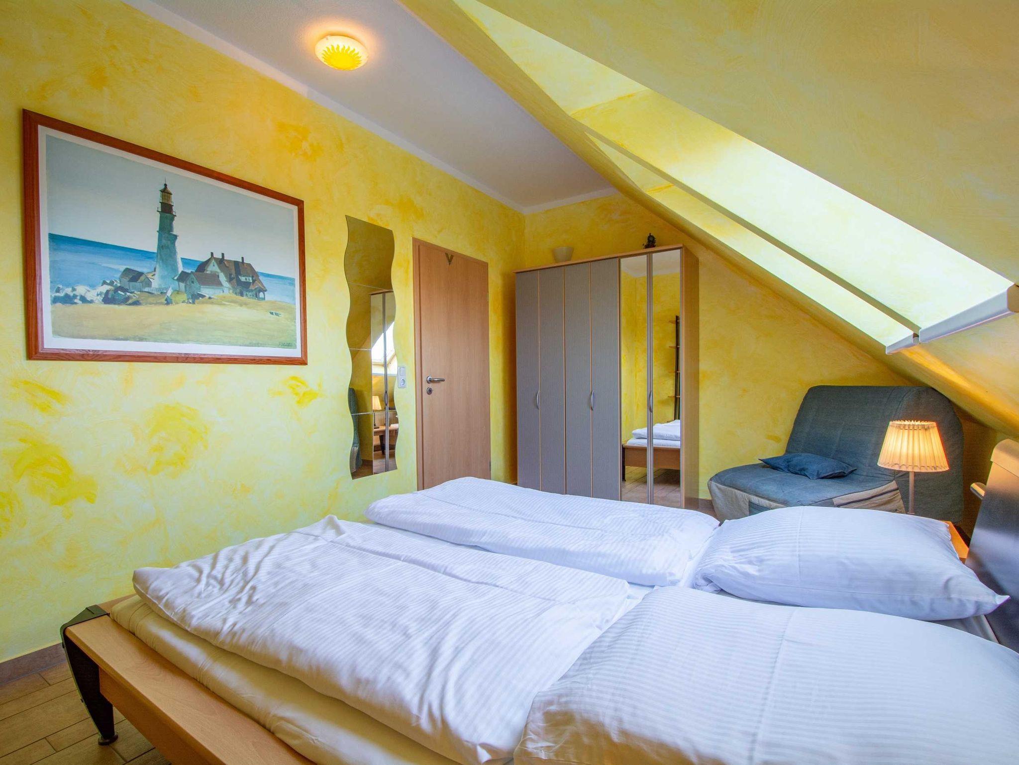 Im Schlafzimmer lädt Sie ein komfortables Doppelbett (2 x 90cm x 200 cm) zur Nachtruhe ein. Der geräumige Kleiderschrank mit Ganzkörperspiegel bietet genügend Platz für Ihre Urlaubsgarderobe. Zum Verdunkeln sind im Schlafzimmer verdunkelnde Jalousien angebracht, im Wohnzimmer Gardinen zum Sichtschutz.