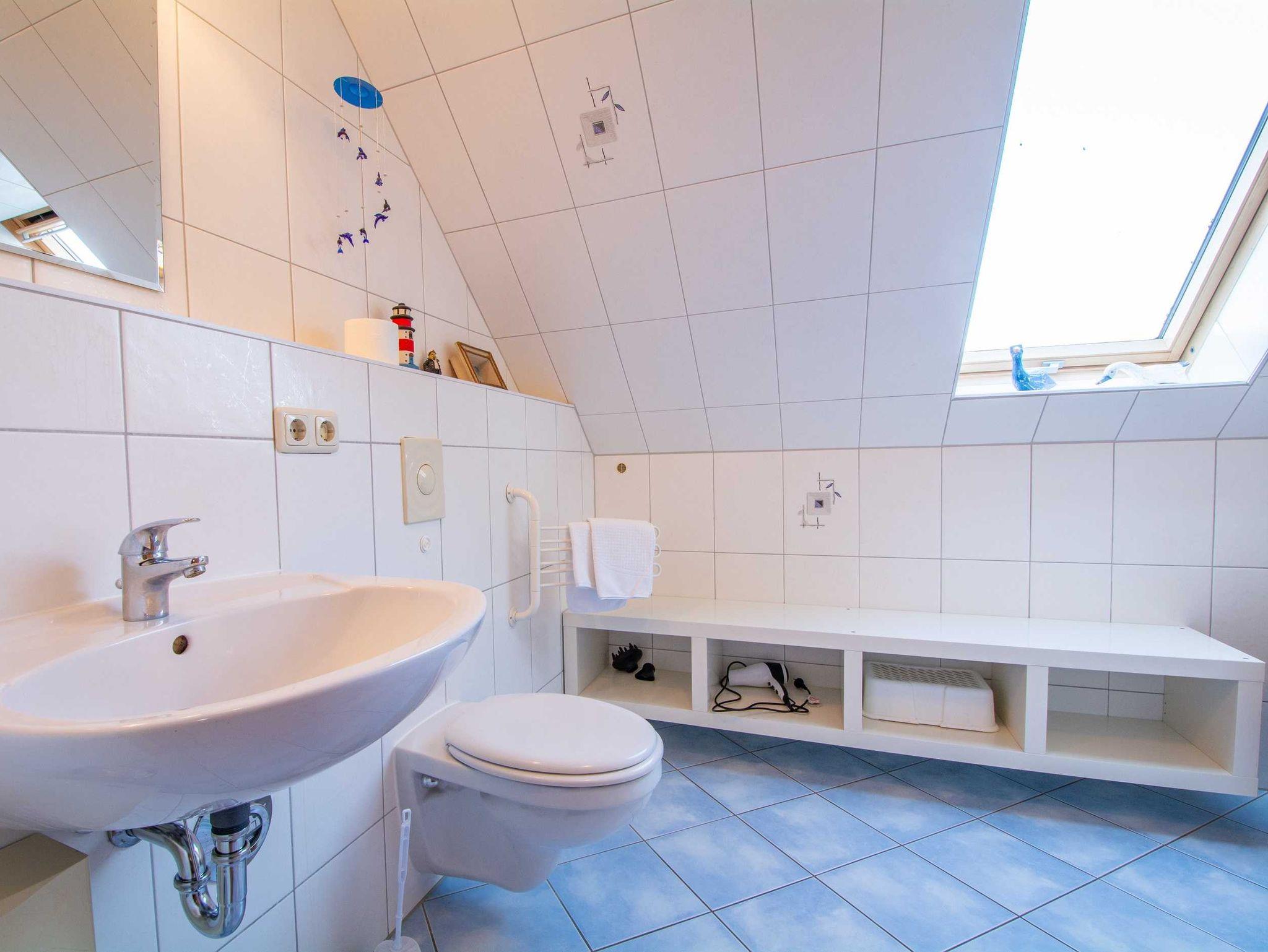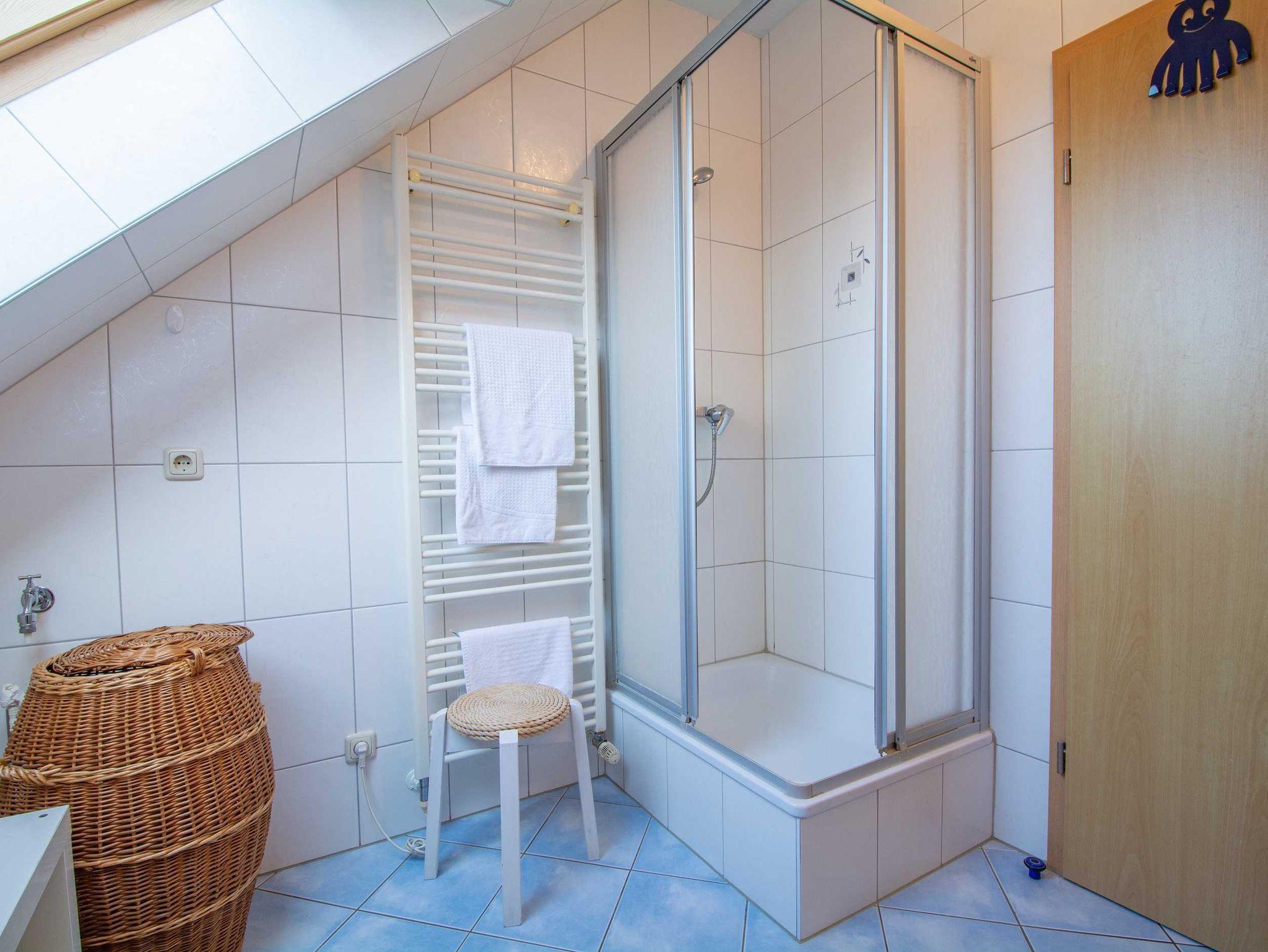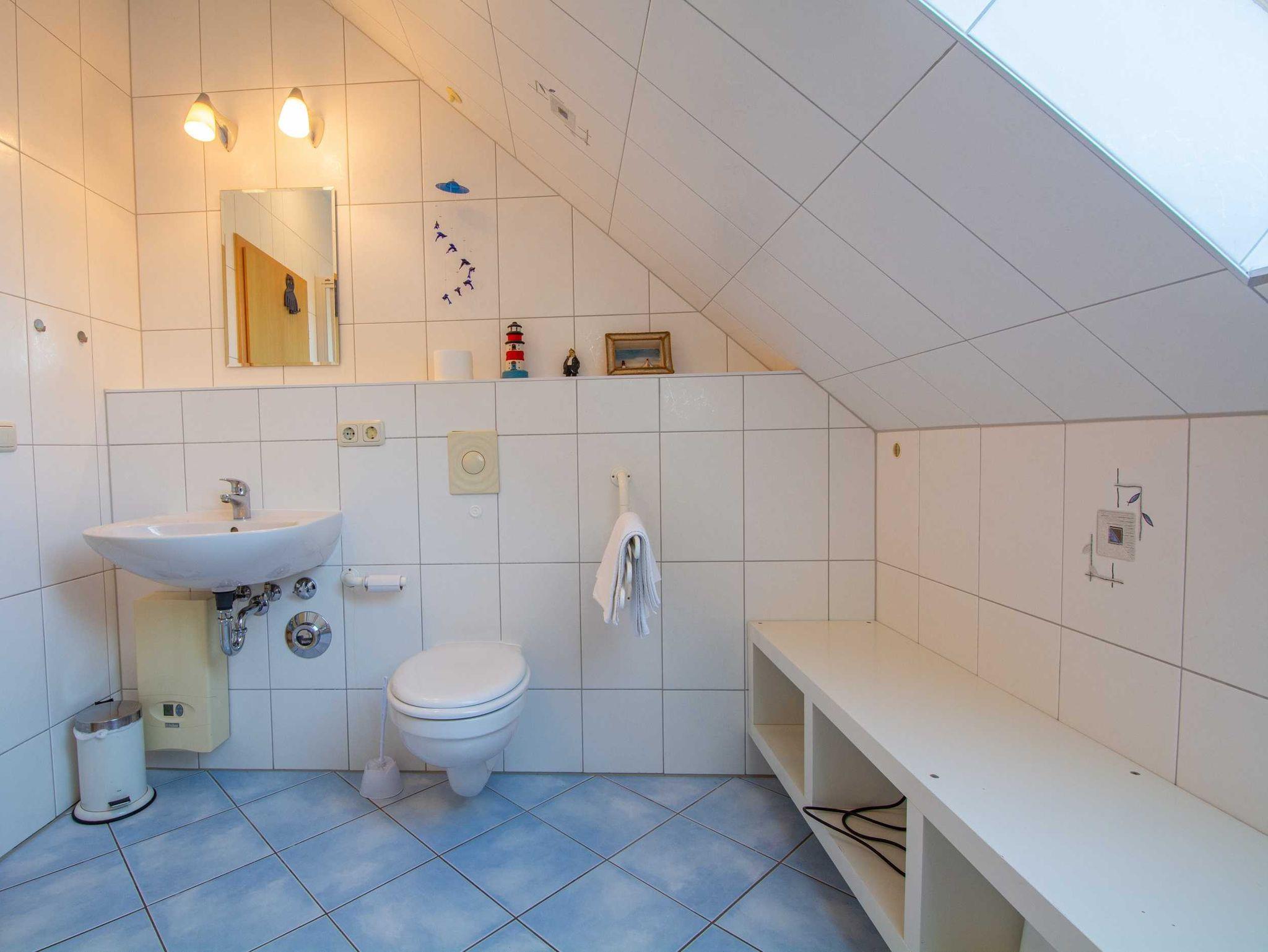 Das geflieste Tageslichtbad ist ausgestattet mit einer Dusche, Waschbecken und WC sowie genügend Ablagemöglichkeiten für Ihre Badutensilien. Ein Handtuchheizkörper sorgt für kuschelig warme Handtücher und vervollständigt die Badausstattung.