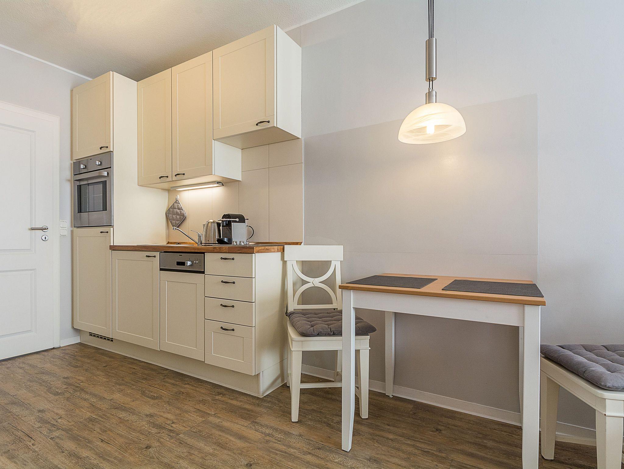 Der integrierte Essbereich bietet Ihnen reichlich Platz für gemeinsame Mahlzeiten und grenzt an die offene Küchenzeile. Die im modernen Landhausstil eingerichtete Küchenzeile hält für Sie alle wichtigen Küchengeräte und -utensilien bereit, die Sie für Ihr perfektes Dinner benötigen: Ein 2-Zonen-Cerankochfeld, ein Backofen in bequemer Stehhöhe, ein Geschirrspüler, ein Kühlschrank mit Gefrierfach sowie eine WMF Kaffeemaschine befinden sich in der Küche. Eine Original Nespresso-Kapselmaschine, ein Wasserkocher und ein Toaster sowie genügend Koch- und Essgeschirr vervollständigen die Kücheneinrichtung.