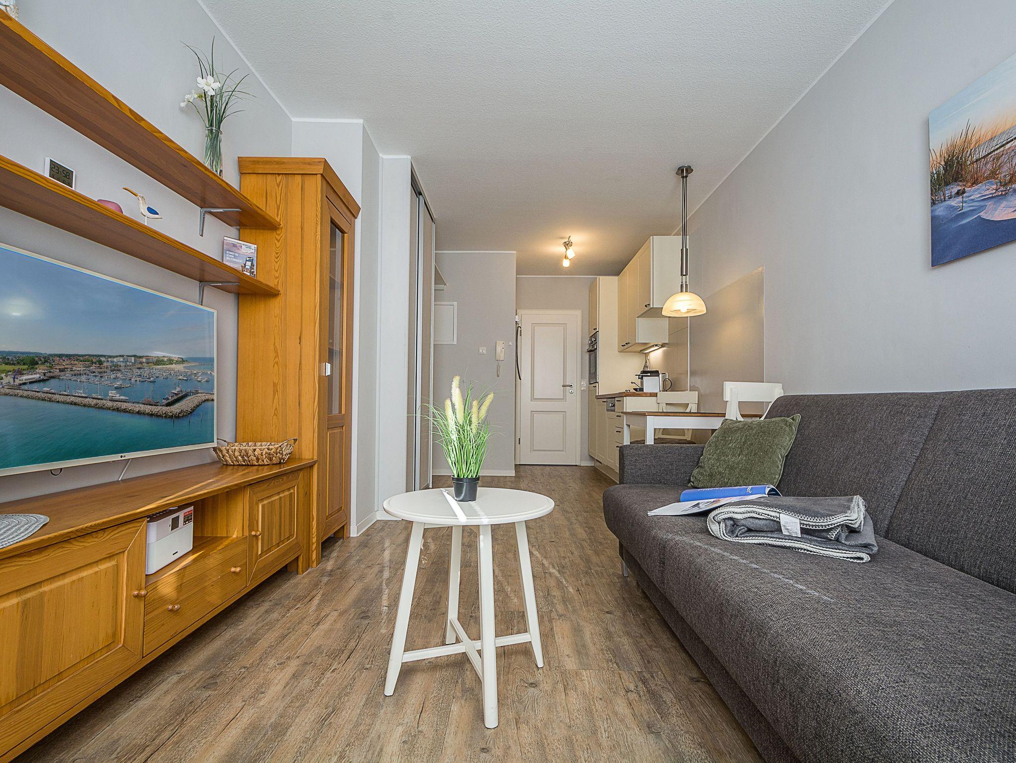 Der gemütliche Wohnbereich der Ferienwohnung ist für Sie mit einer hochwertigen Schlafcouch des deutschen Spezialisten für Schlafmöbel Bali Polstermöbel ausgestattet. Die Couch lässt sich mit wenigen, einfachen Handgriffen in einen komfortablen Schlafplatz (Liegefläche 160 cm x 200 cm) verwandeln. Die erstklassige Ausstattung dieser Ferienwohnung wird mit einem 43-Zoll 4 K Ultra-HD- Smart TV und einem Bluetooth Internetradio abgerundet. Als Sichtschutz bzw. zum Verdunkeln sind im Wohnbereich Plissees an den Fenstern angebracht. Ein Kleiderschrank bietet Ihnen Stauraum für Ihr Urlaubsgepäck.