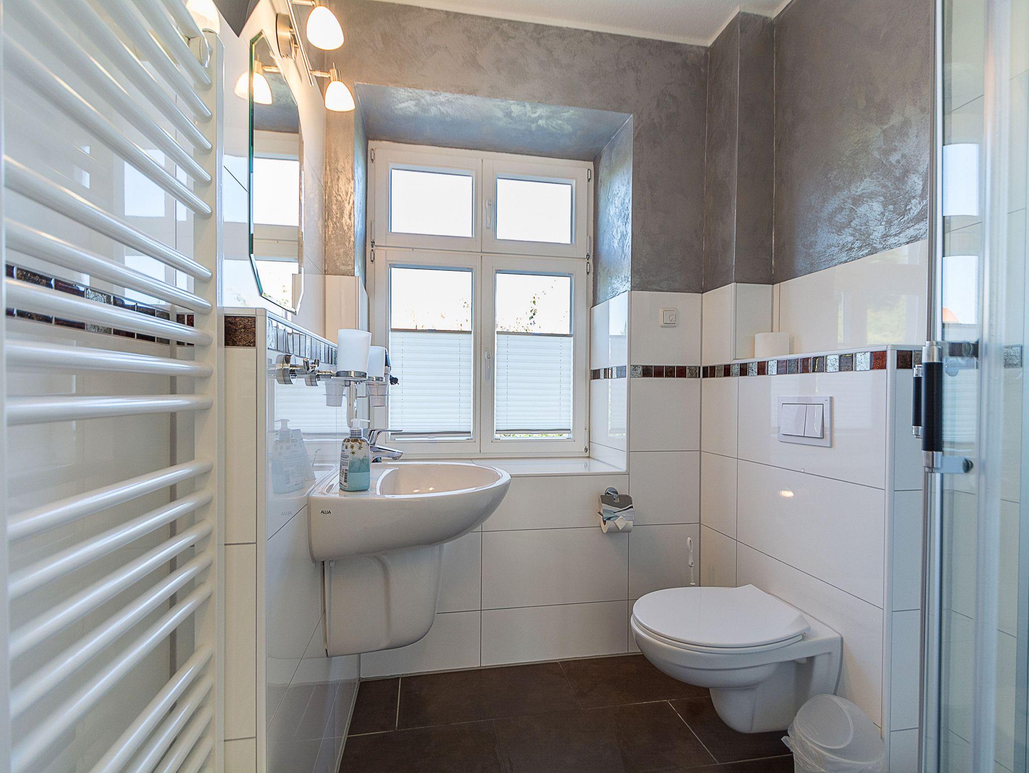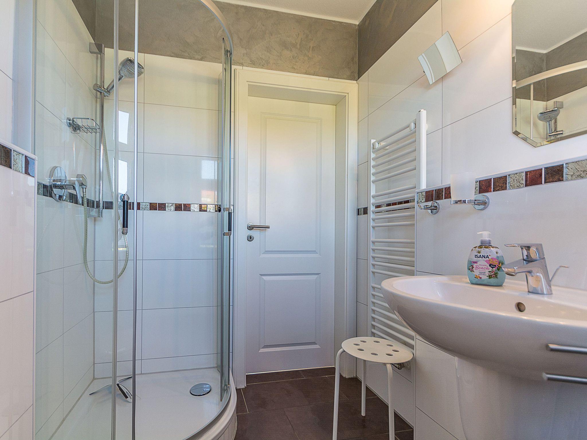 Das modern geflieste Tageslichtbad ist ausgestattet mit einer bodengleichen Duschkabine, Waschbecken und WC. Ein Handtuchheizkörper sorgt für kuschelig warme Handtücher. Ein Föhn und ein Kosmetikspiegel sowie Plissees zum Sichtschutz komplettieren die Badeinrichtung.