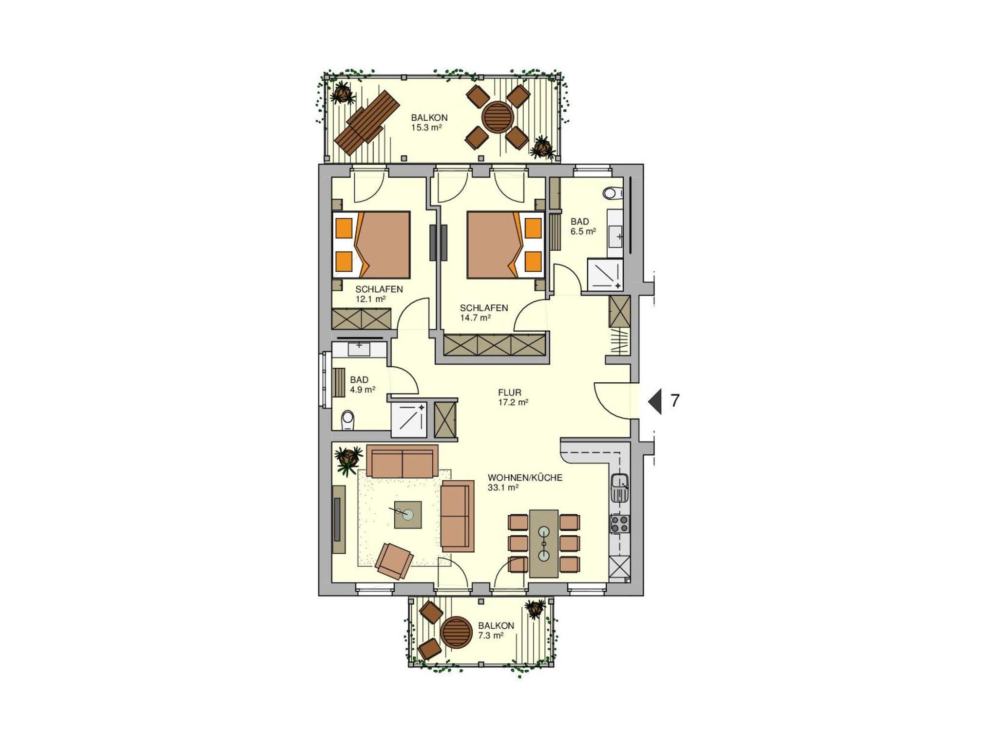 Bei der Ferienwohnung 07 handelt es sich um eine 3-Raum-Ferienwohnung, bestehend aus einem großzügigen Wohn-/Essbereich mit offen gestalteter Küche, zwei Schlafzimmern mit Doppelbett und je einem Duschbad.