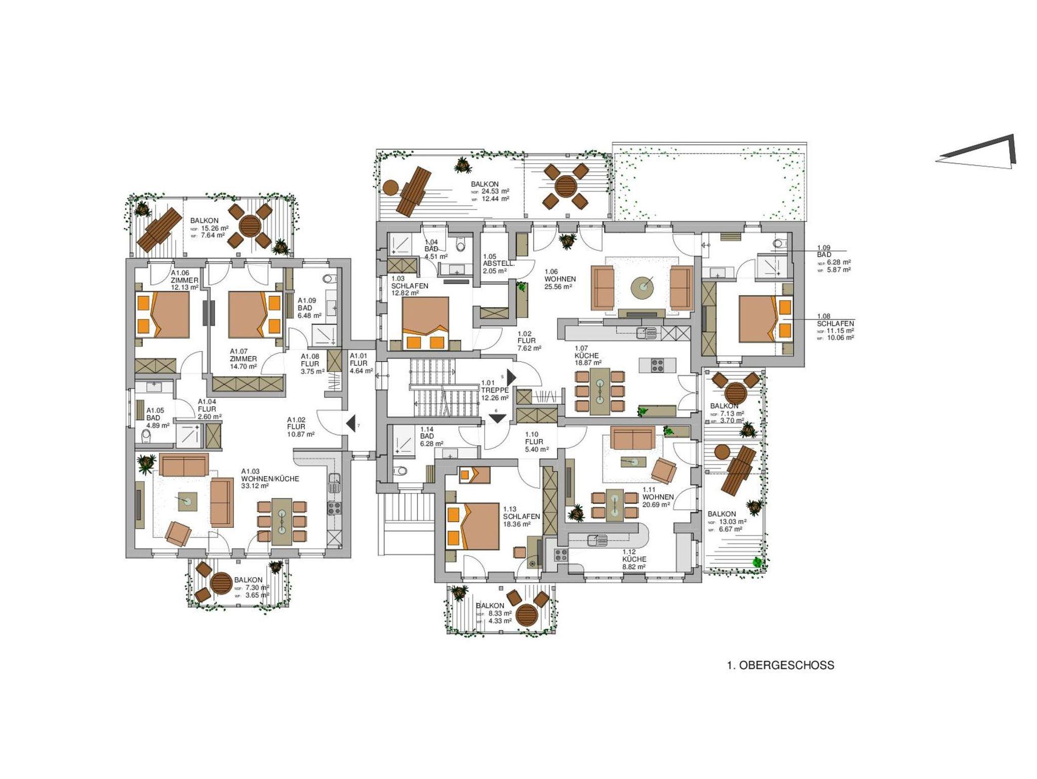 4 Wohnungen mit zwei Schlafzimmern und jeweils zwei Badezimmern.