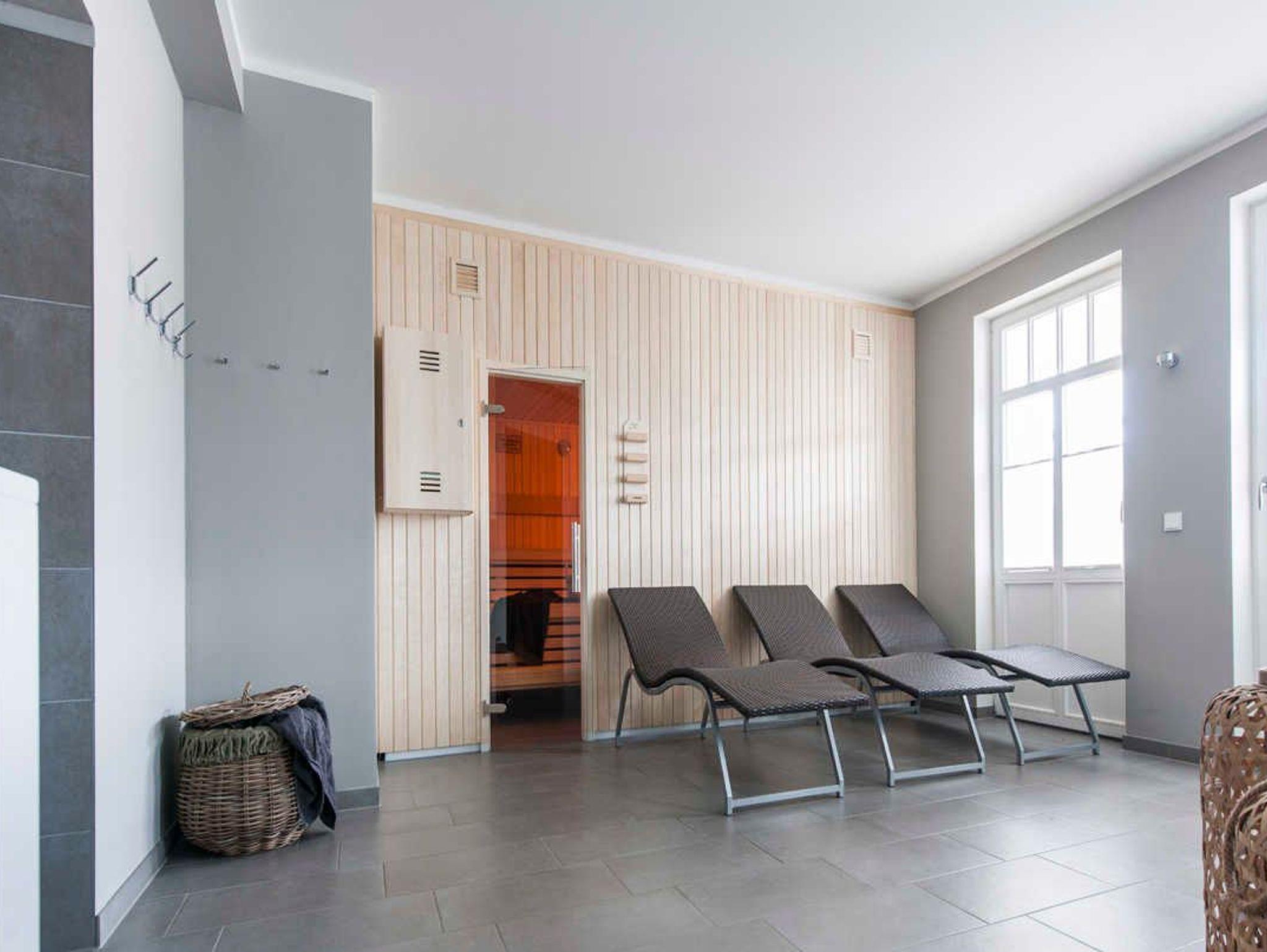 Zum Relaxen lädt der hochwertige Sauna- und Wellnessbereich ein, der sich im neuen Anbau der Villa befindet. Nach dem Saunagang können Sie sich im großzügigen Ruheraum erholen.
