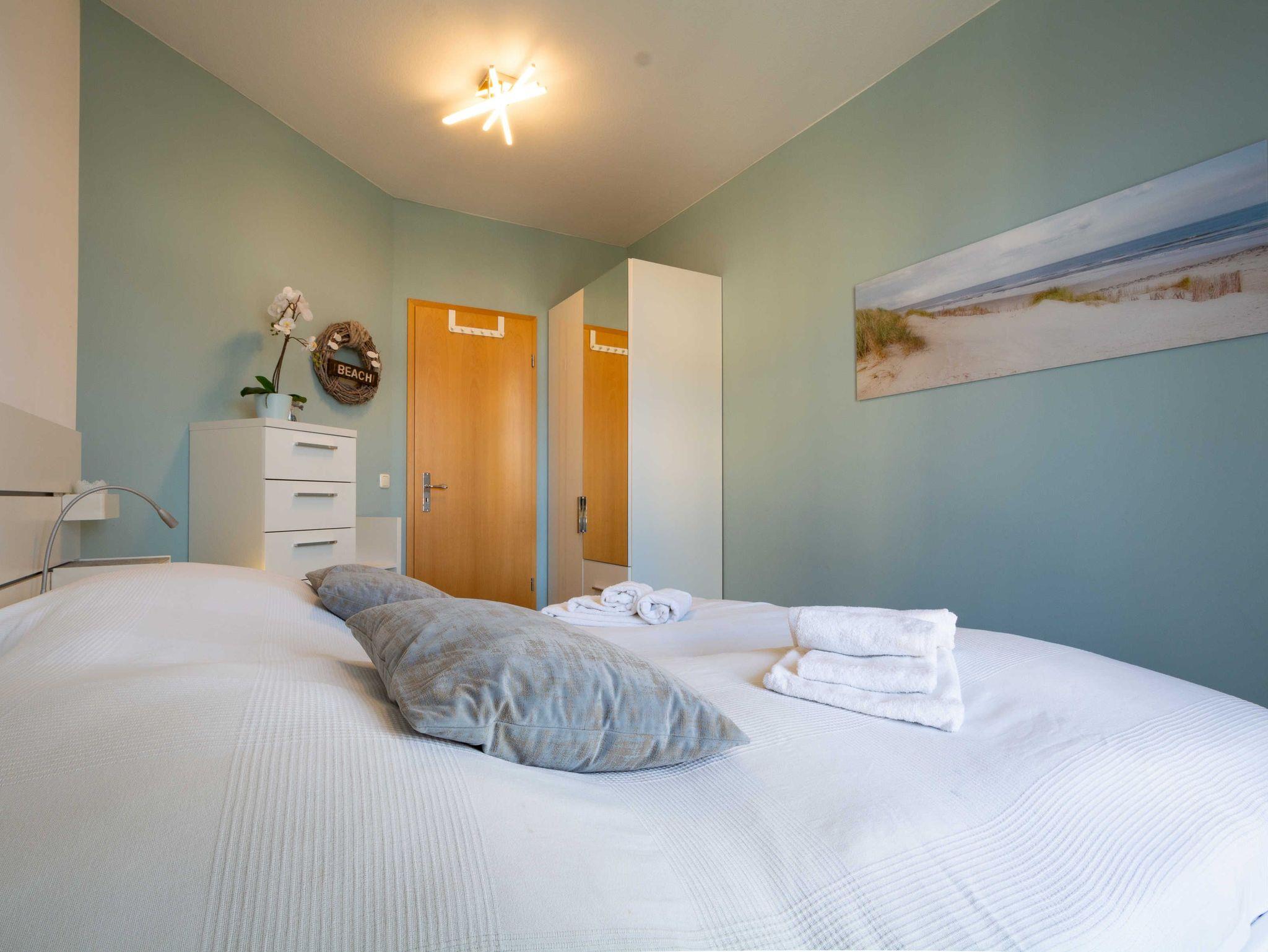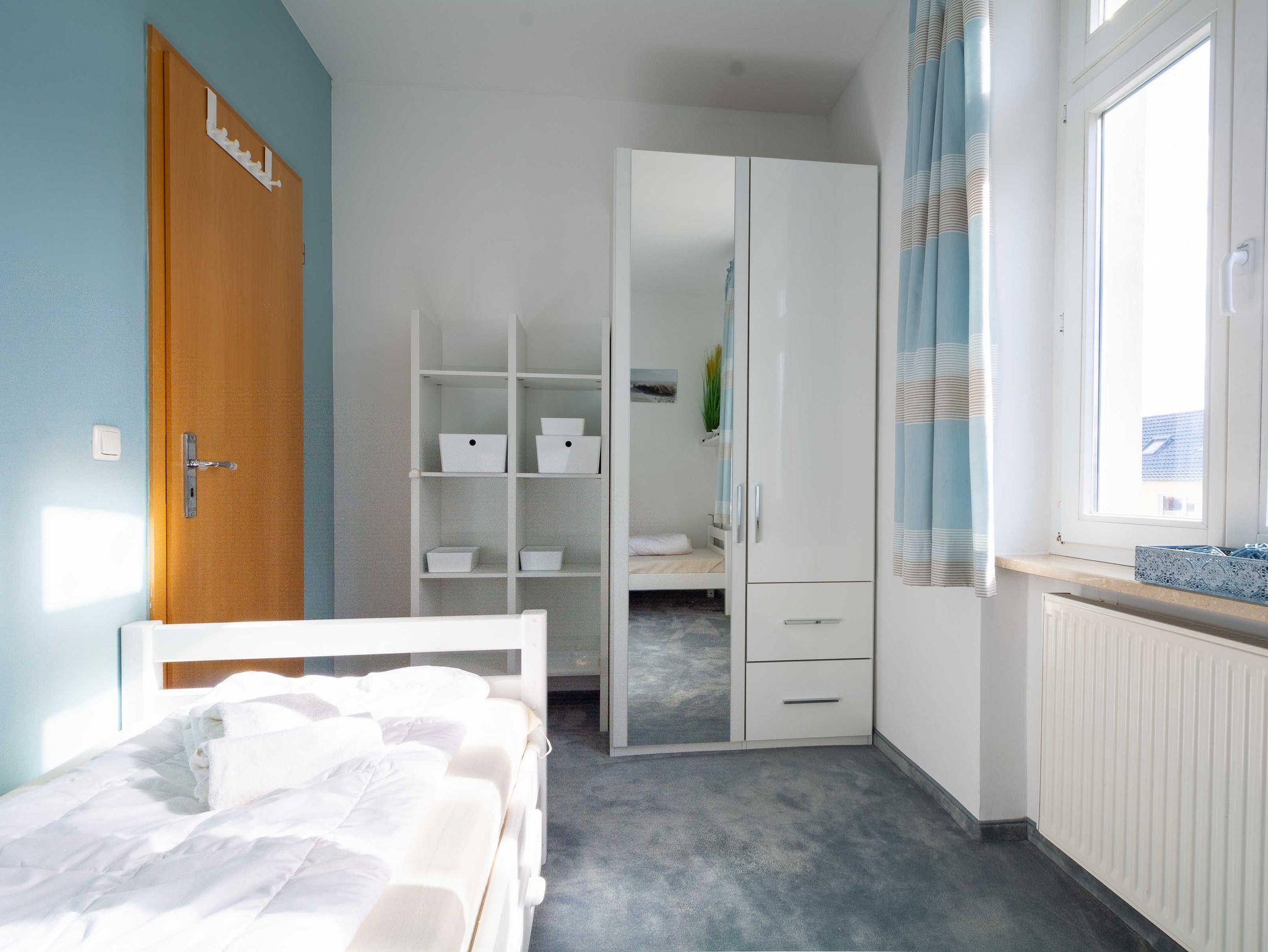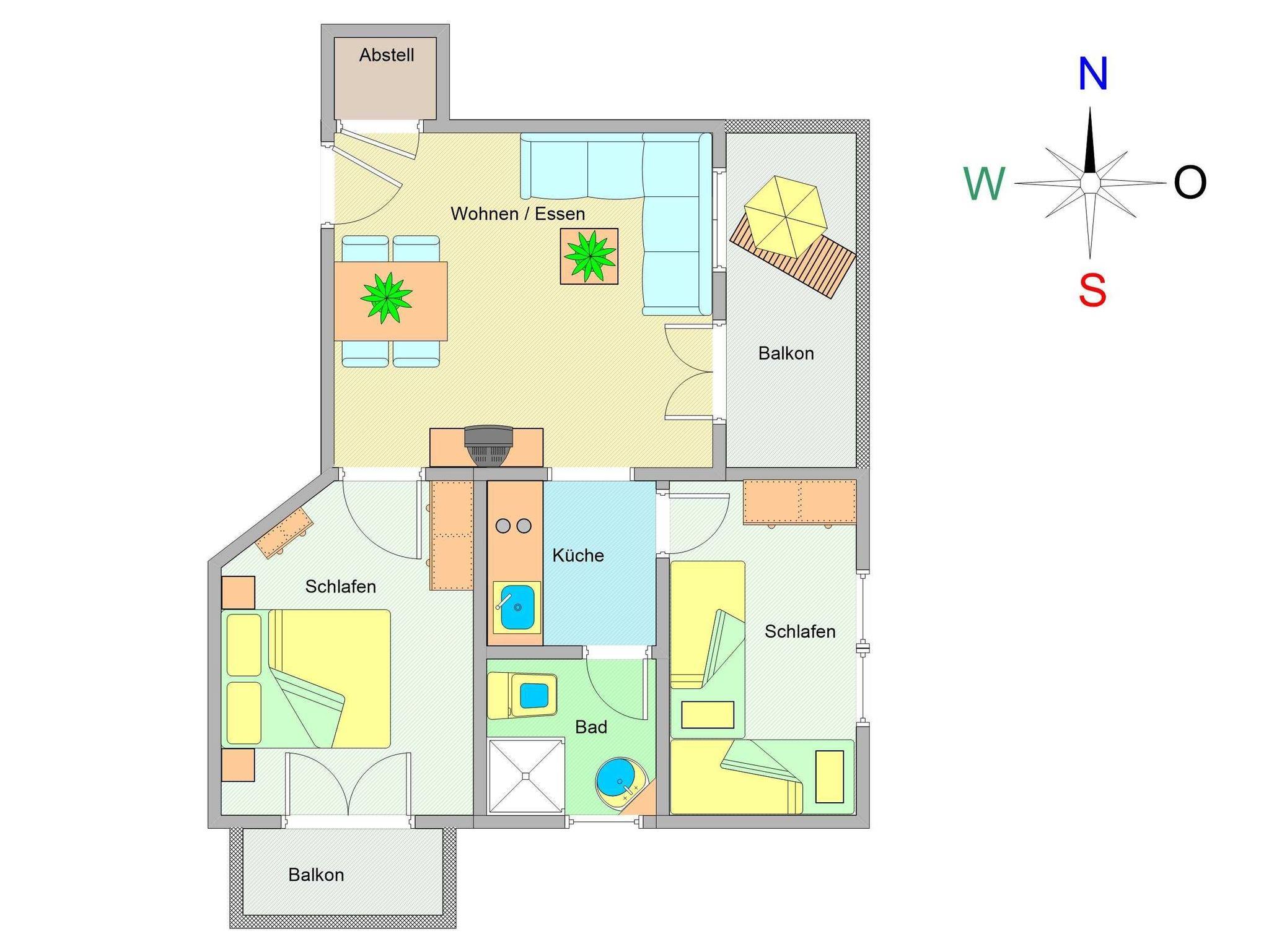 Das erste Schlafzimmer bietet Ihnen ein gemütliches Doppelbett (2 x 90cm x 200cm), einen Kleiderschrank mit Ganzkörperspiegel sowie einen Zugang zum Süd-Balkon, auf dem Sie bei Abendsonne den Tag ausklingen lassen können. Das zweite Schlafzimmer ist ebenfalls mit einem Kleiderschrank mit Ganzkörperspiegel ausgestattet und bietet mit 2 Einzelbetten (je 90cm Matratzenbreite) Platz für 2 weitere Personen. Das geflieste Tageslichtbad mit Dusche und WC vervollständigt das Gesamtbild dieser liebevoll eingerichteten Ferienwohnung.