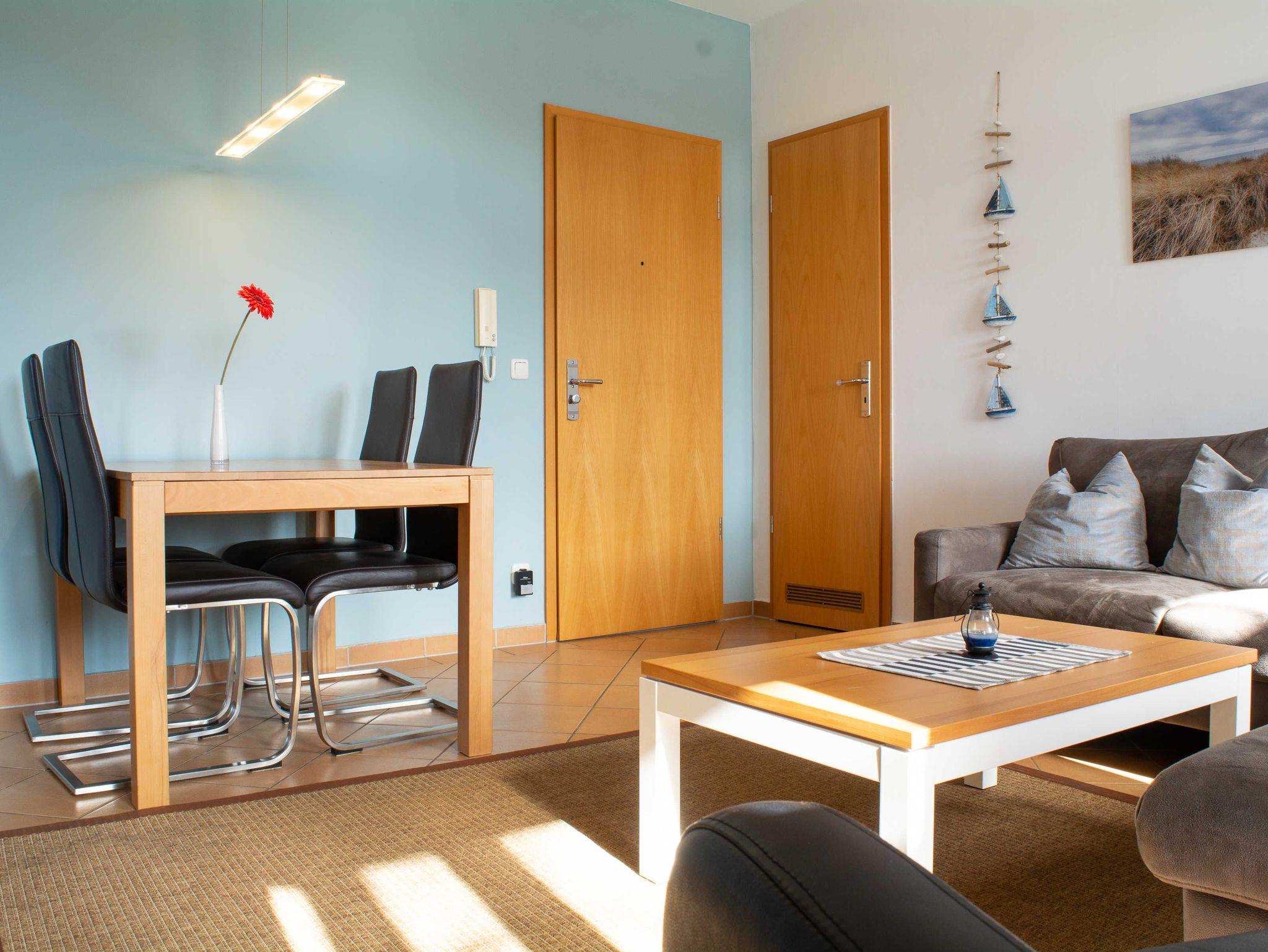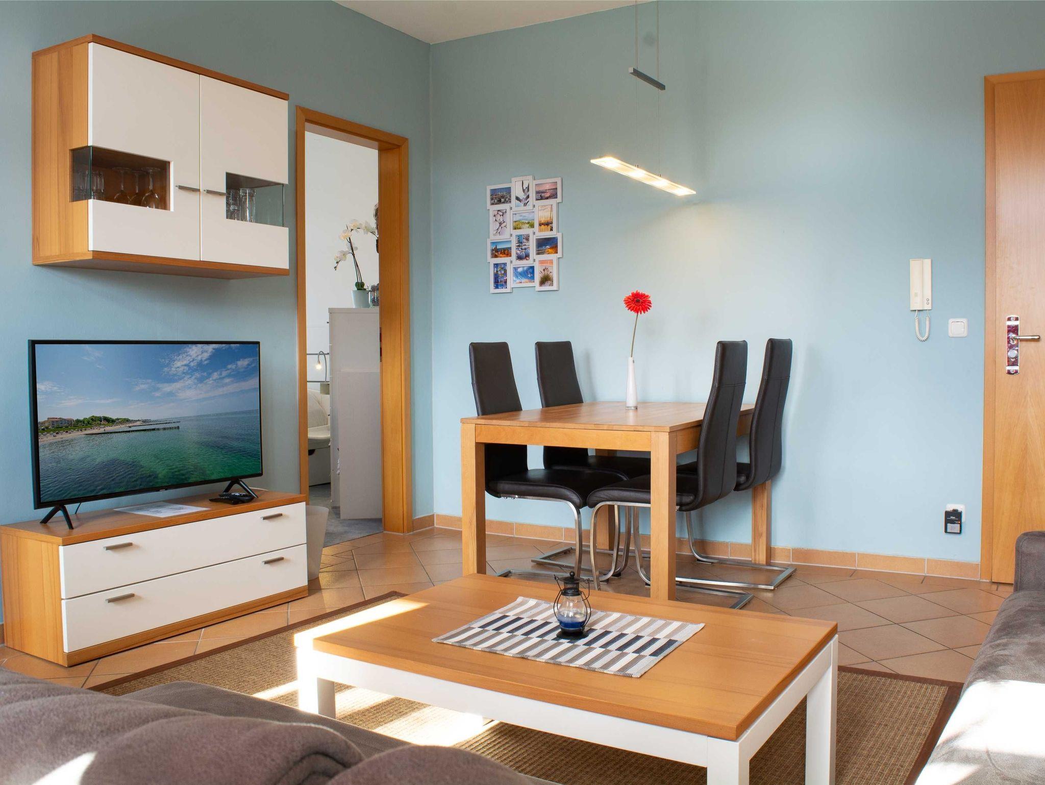 Herzlich willkommen in der Wohnung Nr. 10 im Waldhaus! Sie wohnen in einer 53 m² großen 3-Raum-Ferienwohnung, die sich im 1. Obergeschoss befindet. Im hellen freundlichen Wohnraum befinden sich eine gemütliche Eckcouch, 43-Zoll-HD-TV mit Radio sowie der Essplatz. Von hier aus gelangen Sie auf einen möblierten Balkon, der nach Osten ausgerichtet ist.
