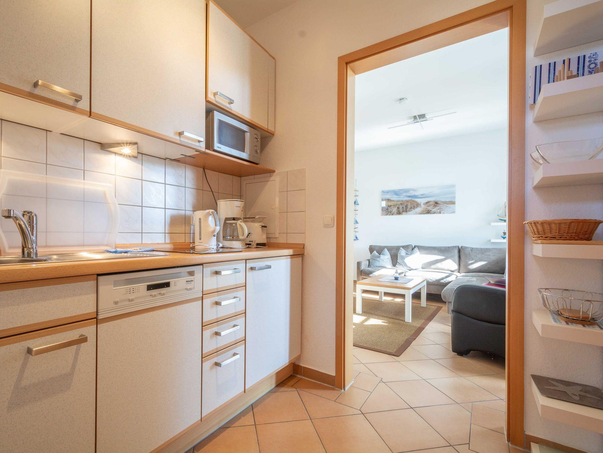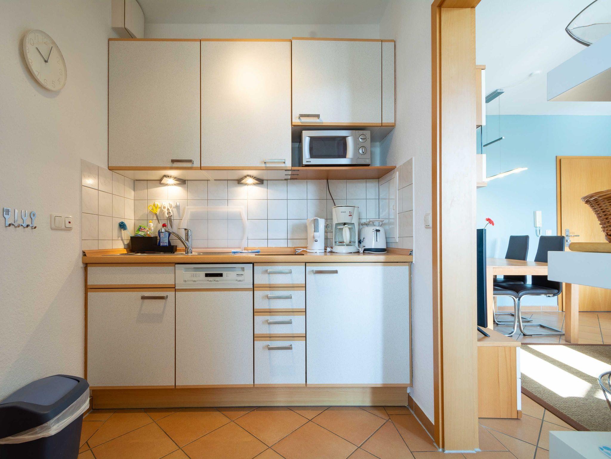 Die anschließende Küchenzeile hält für Sie alle wichtigen Küchengeräte und -utensilien bereit, die Sie für Ihr perfektes Dinner benötigen: Ein 2-Zonen-Ceranfeld, eine Mikrowelle, ein Kühlschrank mit Gefrierfach sowie ein Geschirrspüler befinden sich in der Küche. Eine Kaffeemaschine, ein Wasserkocher und ein Toaster sowie genügend Koch- und Essgeschirr vervollständigen die Kücheneinrichtung.