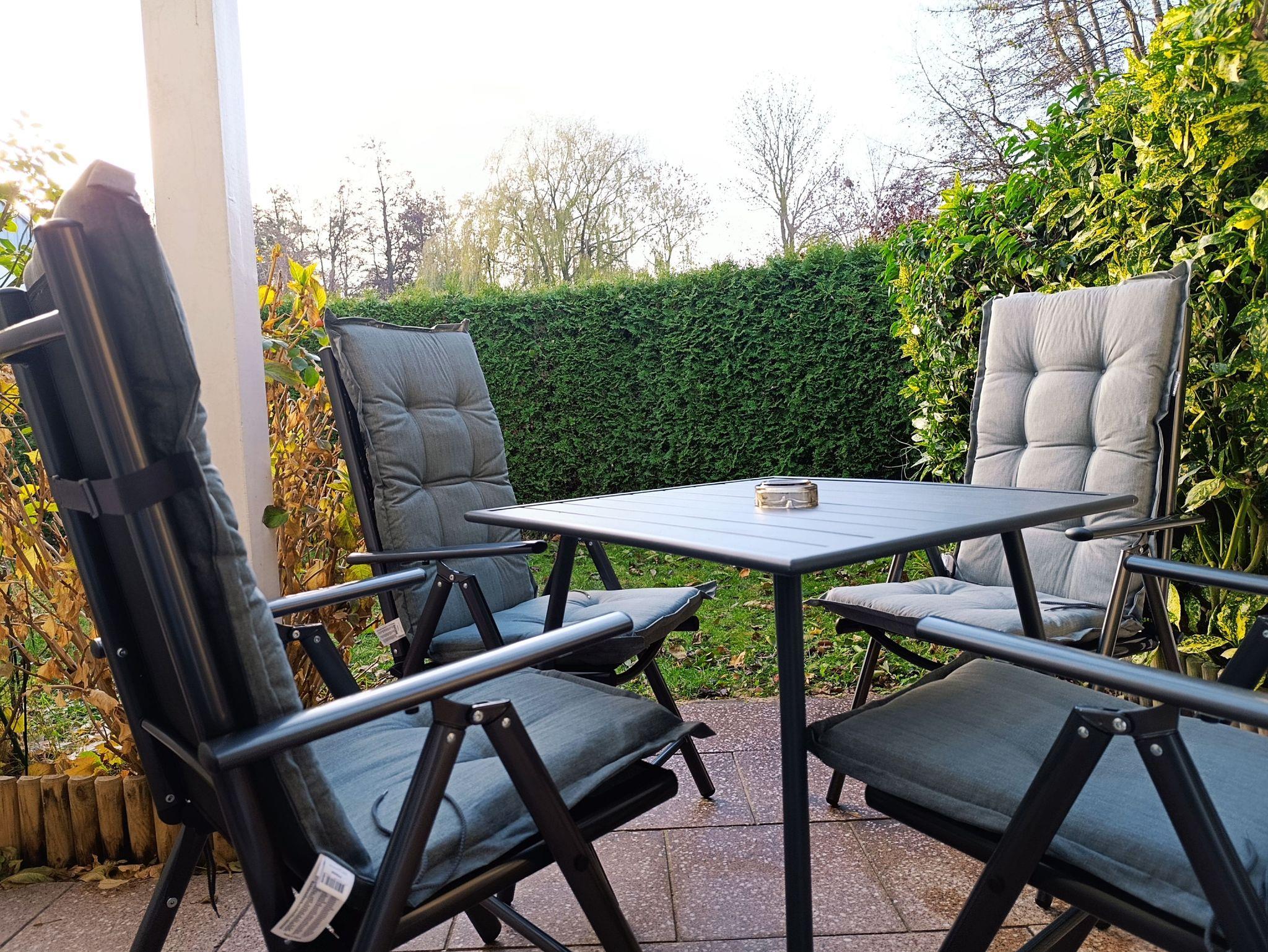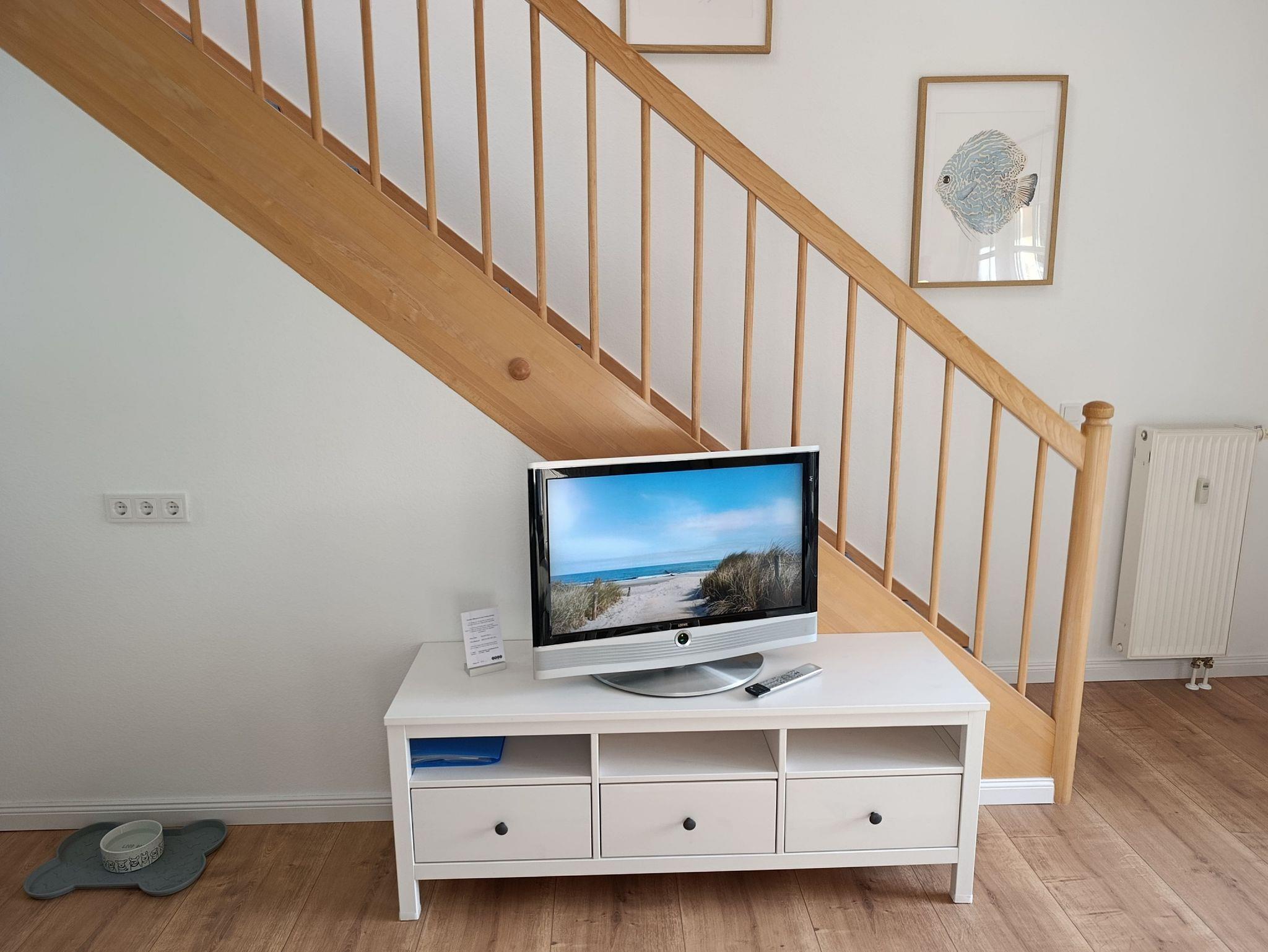 Die Wohnung liegt im Erdgeschoss und besitzt eine geschützte Terrasse zur Südseite. Das Wohnzimmer ist mit einer Schlafcouch, Couchtisch, TV - Bank mit TV, Essbereich und Küchenzeile ausgestattet. Im Schlafzimmer befinden sich ein Doppelbett und ein TV-Gerät.