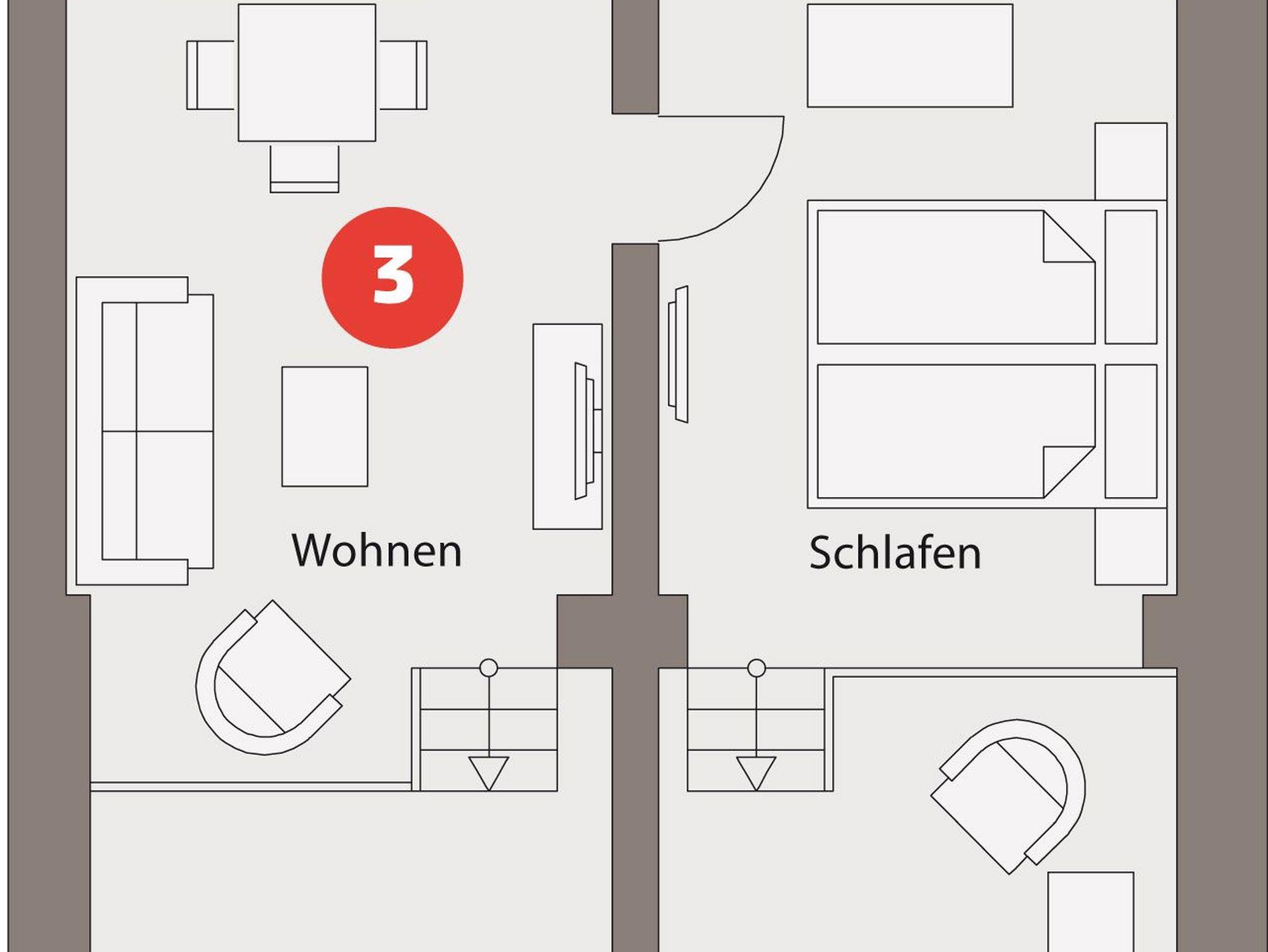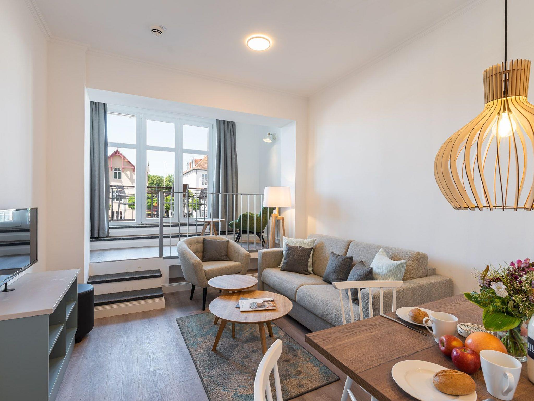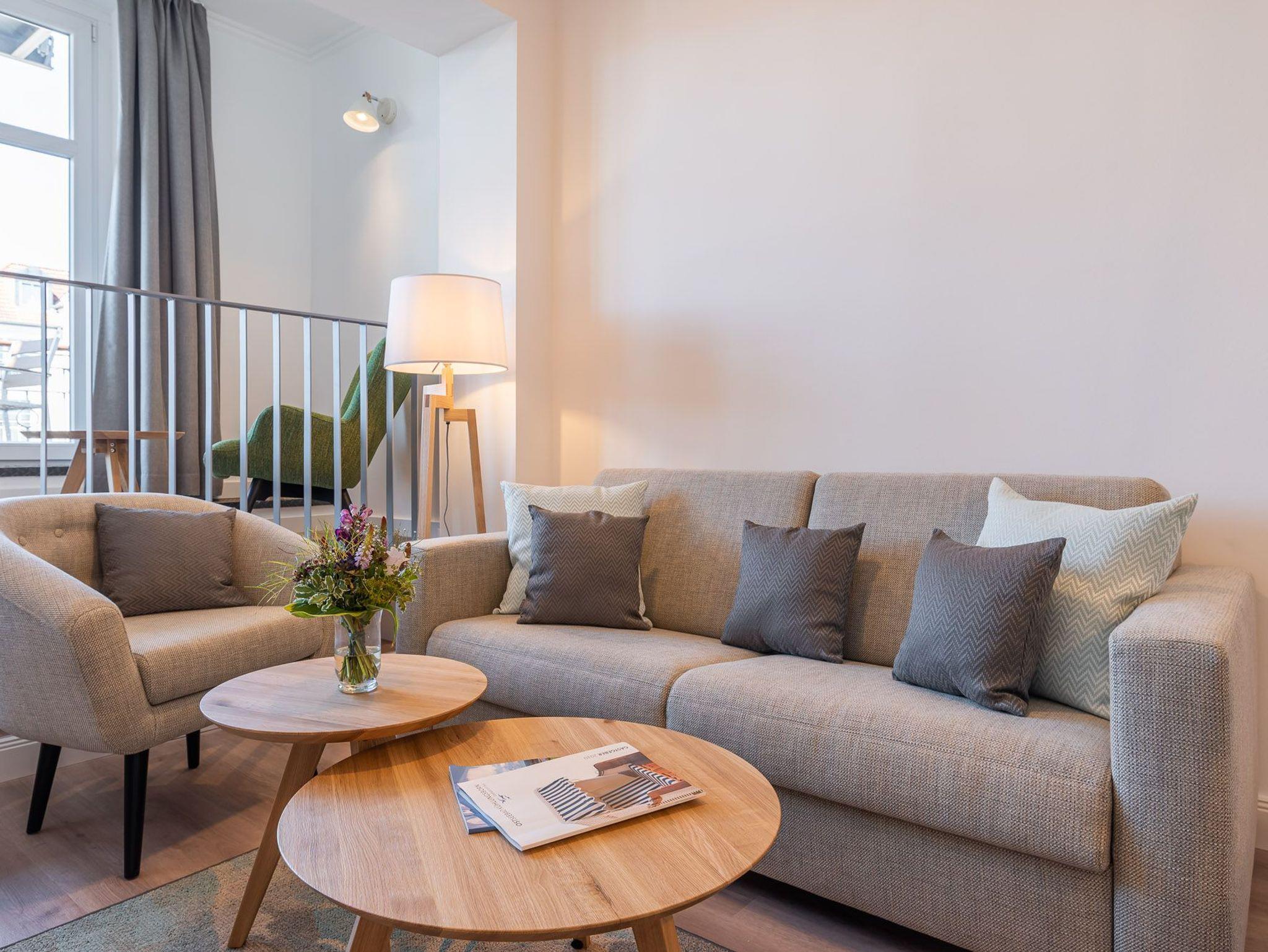 Das Bad verfügt über eine Dusche, einen Haartrockner, einen Handtuchtrockner und einen Kosmetikspiegel. Zu Ihrem Apartment gehört ebenfalls ein großer und lichtdurchfluteter Wohn- und Essbereich mit offener Pantry-Küche. Das Sofa im Wohnbereich hat eine Schlaffunktion mit einer Liegefläche von 1,50 x 1,95 m. Im Wohnbereich befindet sich ein Podest, auf dem in einem bequemen Lounge-Sessel entspannt werden kann.