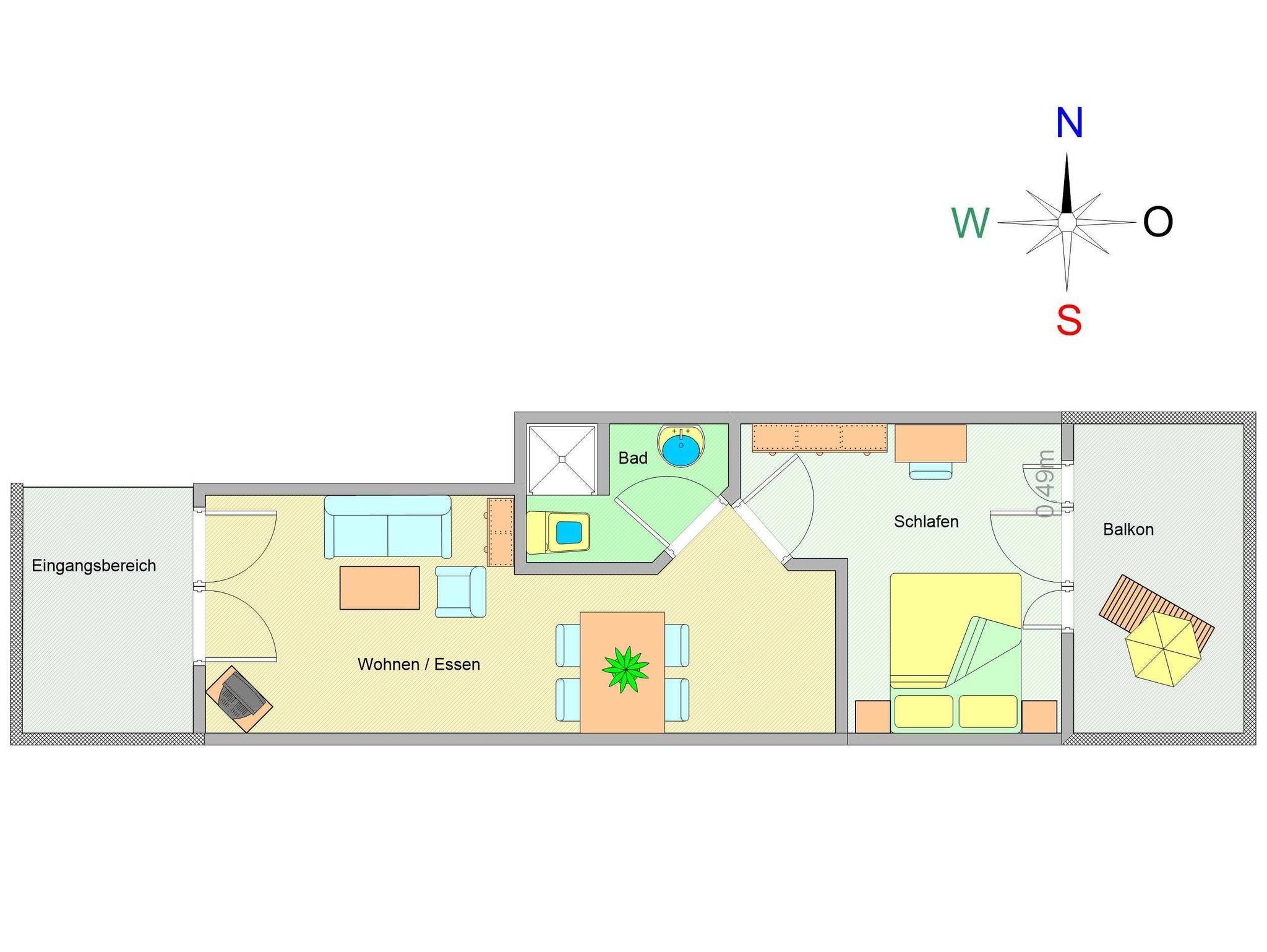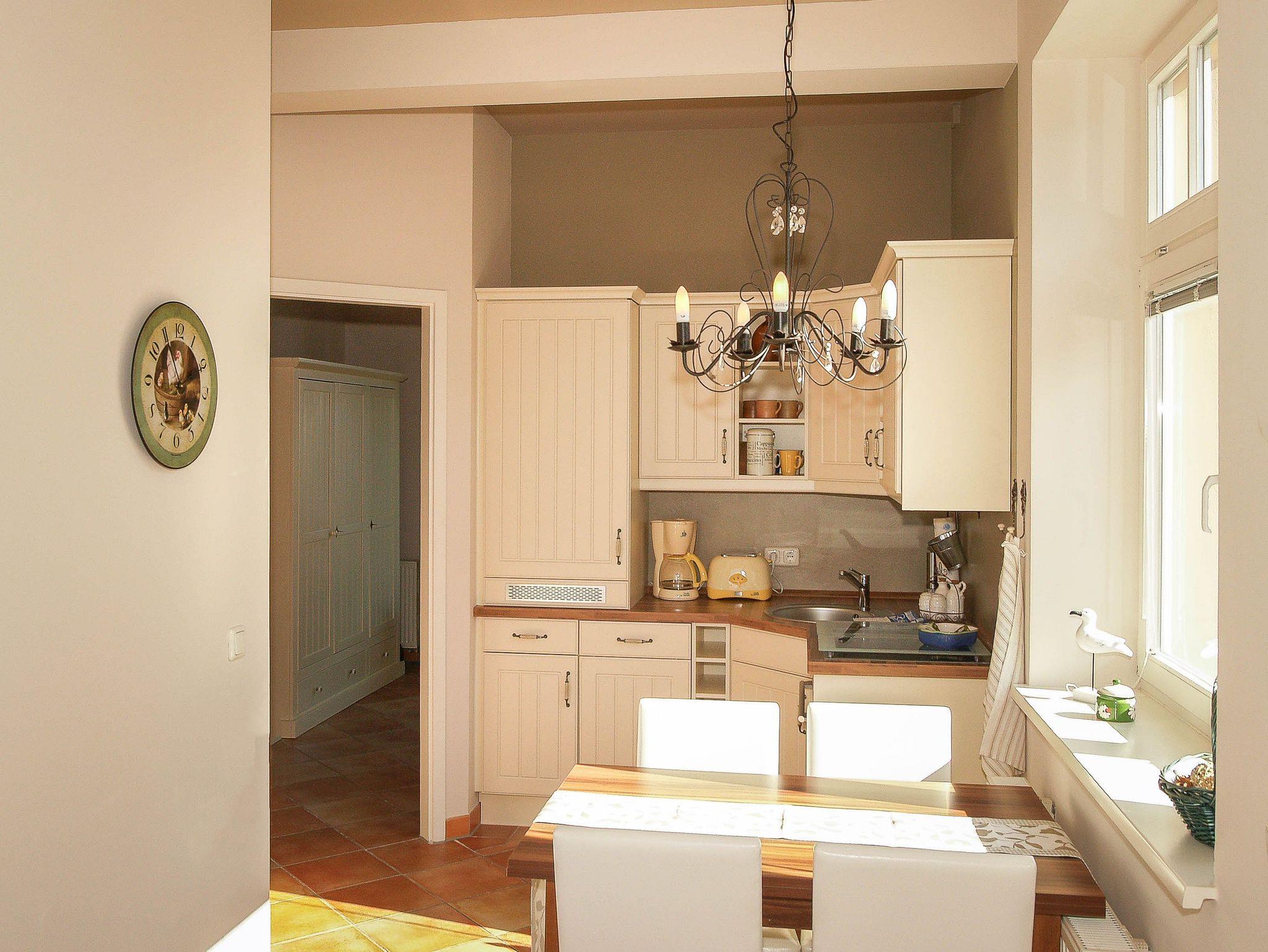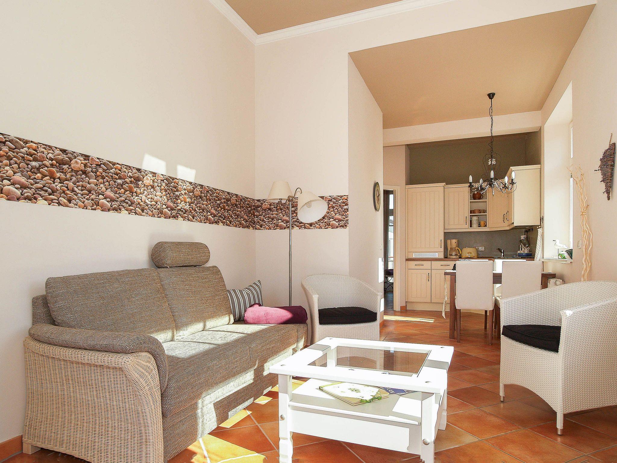 Sie wohnen in einer 48m² großen 2-Raum-Ferienwohnung, die sich im 2. Obergeschoss befindet. Sie betreten die Wohnung über eine Terrasse, auf die Sie über die Rückseite des Hauses per Außentreppe gelangen. Es begrüßt Sie ein heller freundlicher Wohnraum mit gemütlicher Schlafcouch, Flachbild-TV und Stereoanlage sowie einem Esstisch. Dem Wohnraum schließt sich die offene Küchenzeile an, welche ausgestattet ist mit Herd und Geschirrspüler, Kaffeemaschine und Wasserkocher sowie allen wichtigen Küchenutensilien. Vom Schlafraum mit Doppelbett betreten Sie den Balkon in Richtung Osten. Diese Wohnung wurde 2010 komfortabel renoviert.
