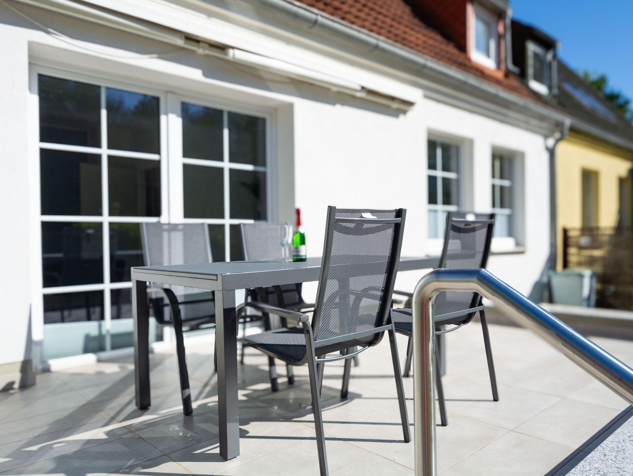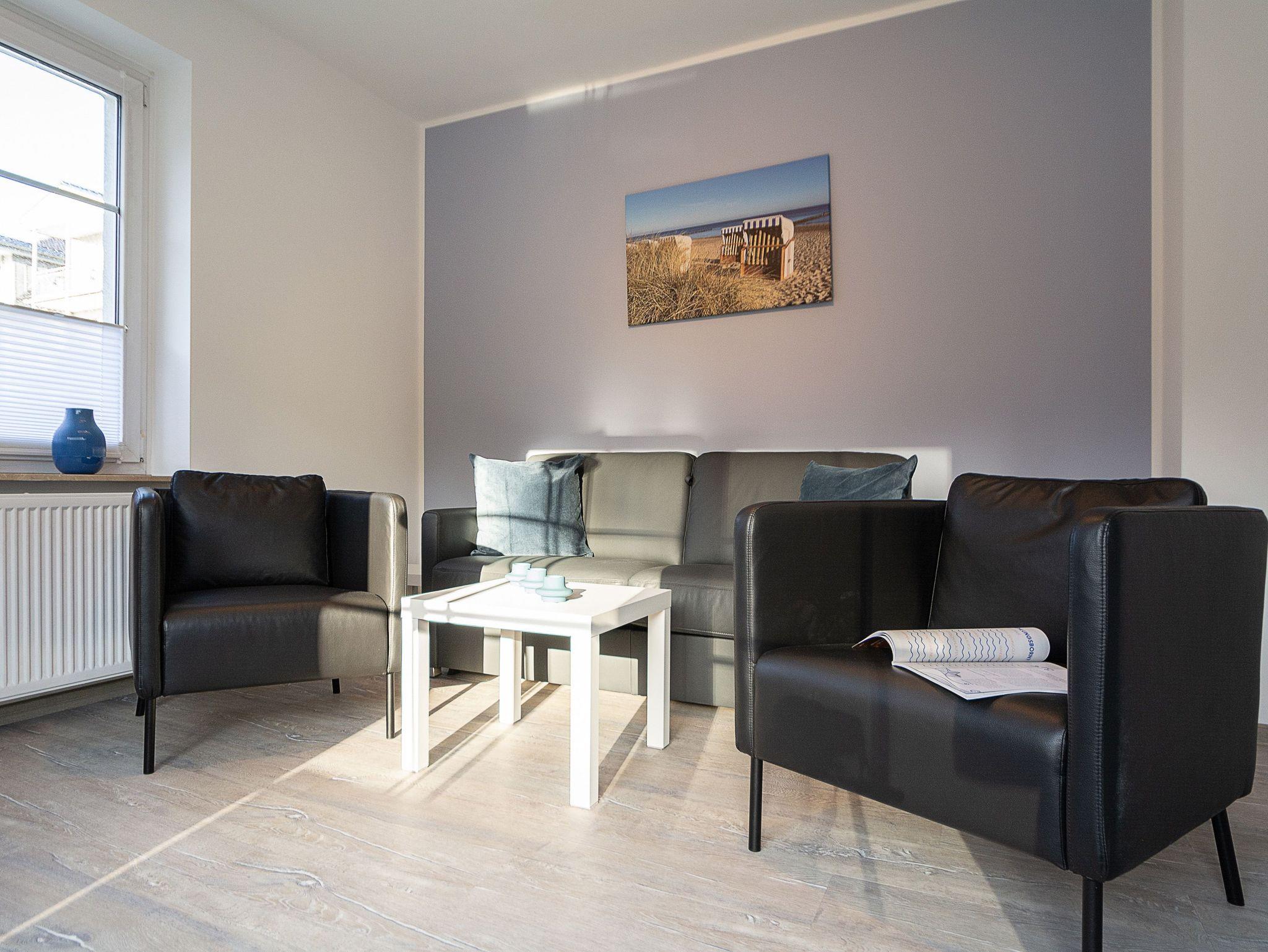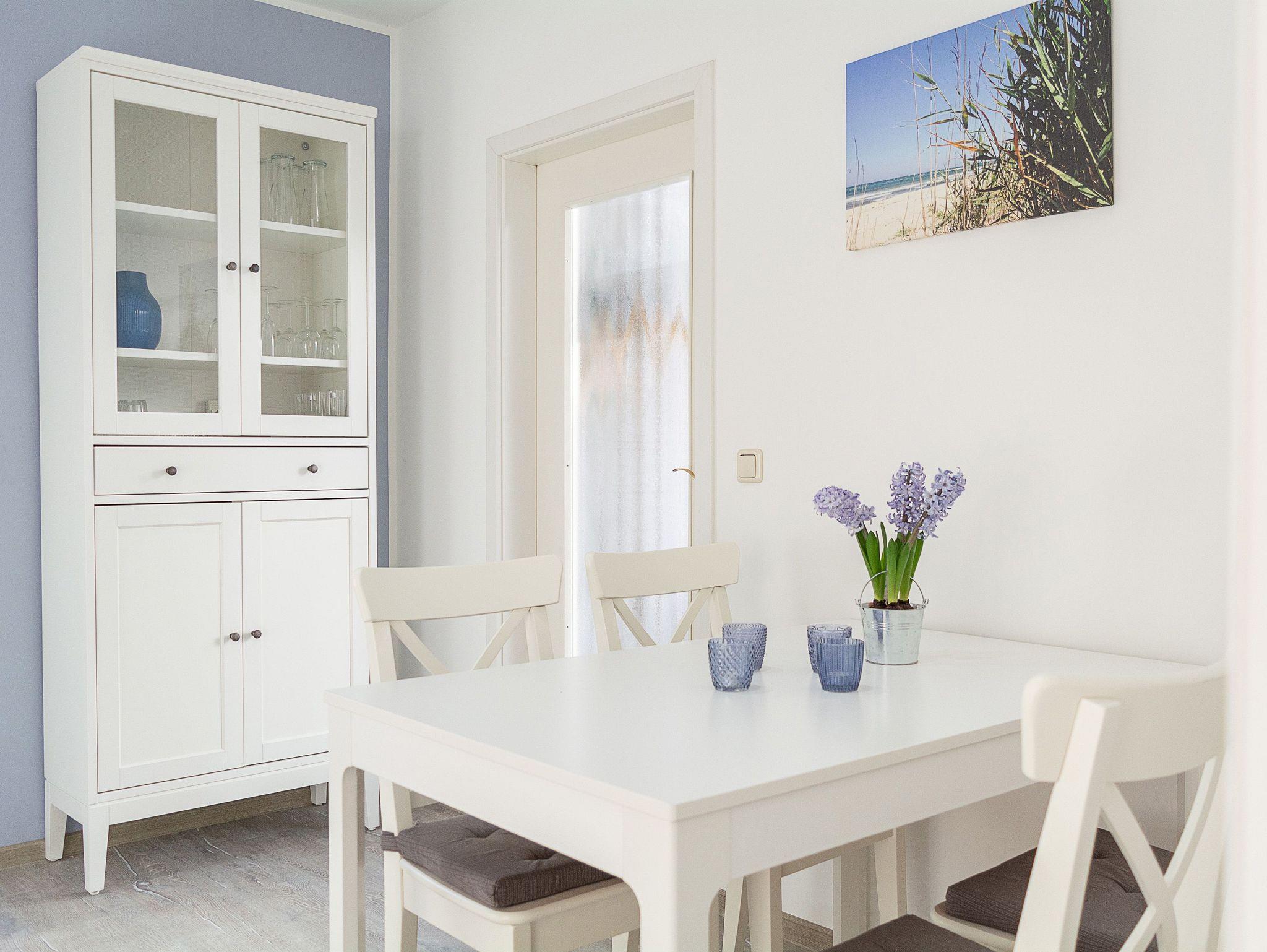 Es empfangen Sie ein offener Essbereich für 4 Personen sowie ein hell und freundlich gestaltetes Wohnzimmer mit gemütlicher Ledercouchgarnitur und Flachbild-TV. Mit nur wenigen Handgriffen lässt sich das Sofa zu einem bequemen Schlafplatz für eine dritte und vierte Person umwandeln. Vom Wohnbereich betreten Sie die große möblierte Terrasse, die nach Süden ausgerichtet ist. Hier können Sie Sonne tanken, relaxen und den Abend nach einem schönen Tag am Meer ausklingen lassen.