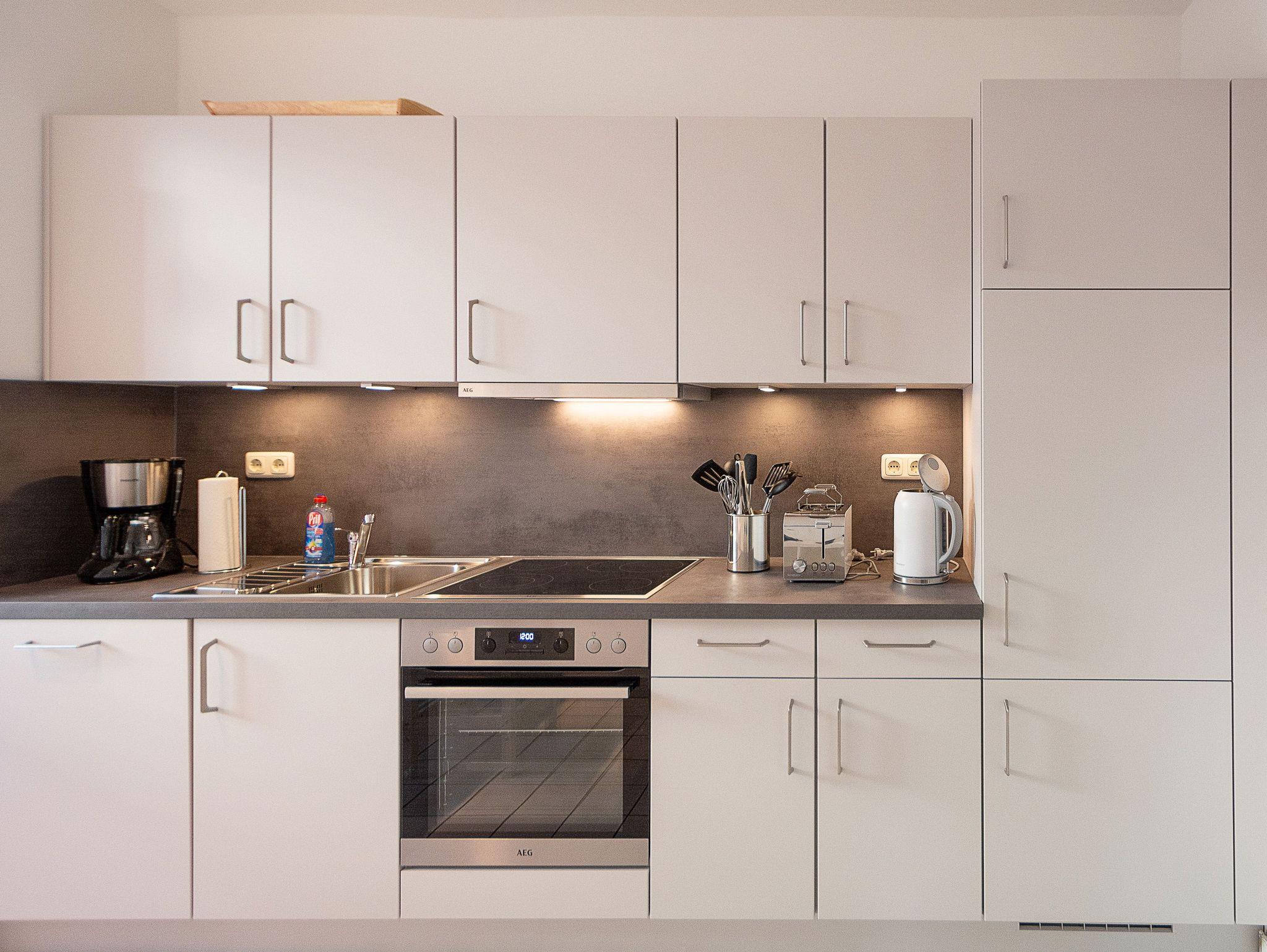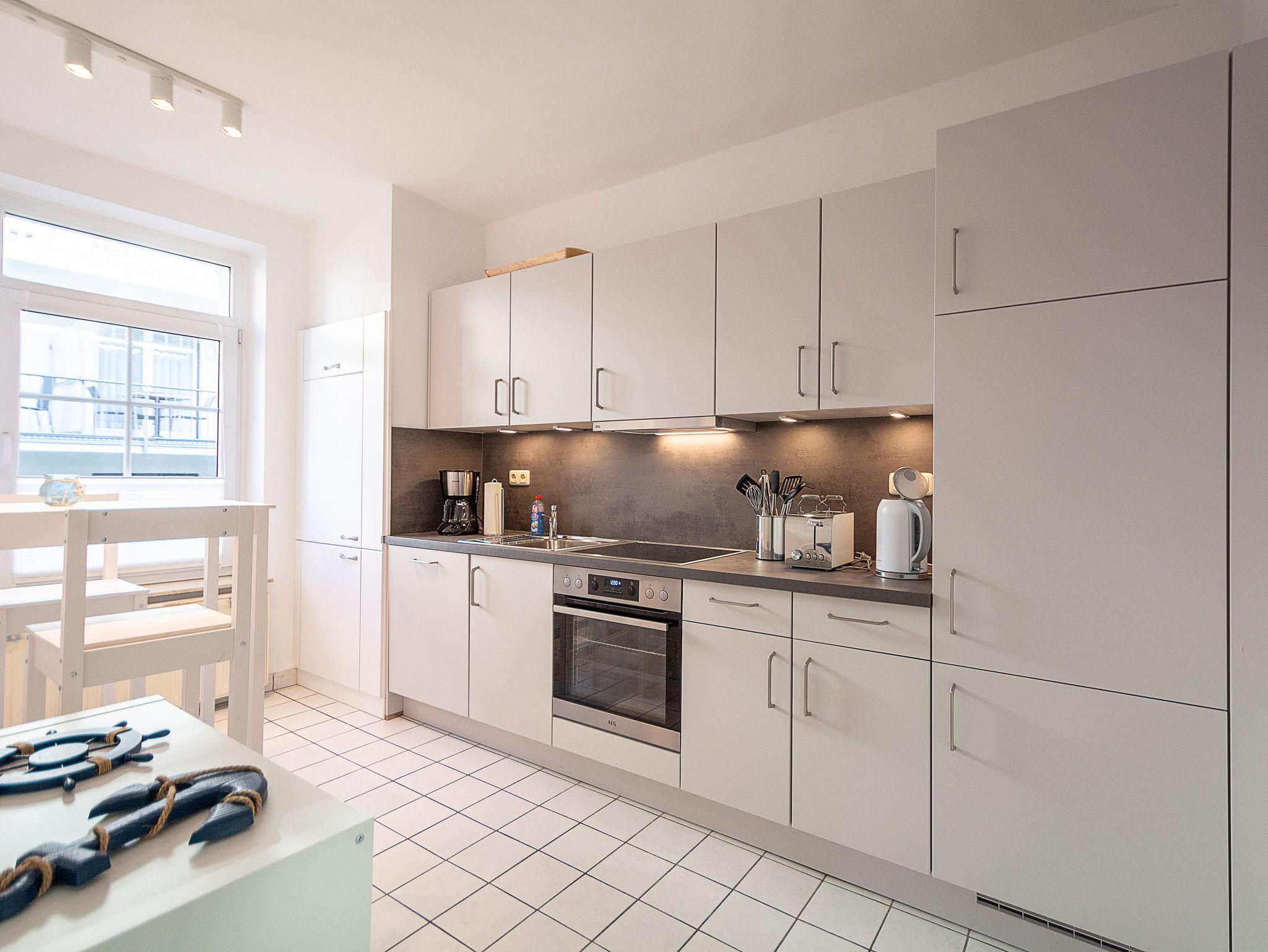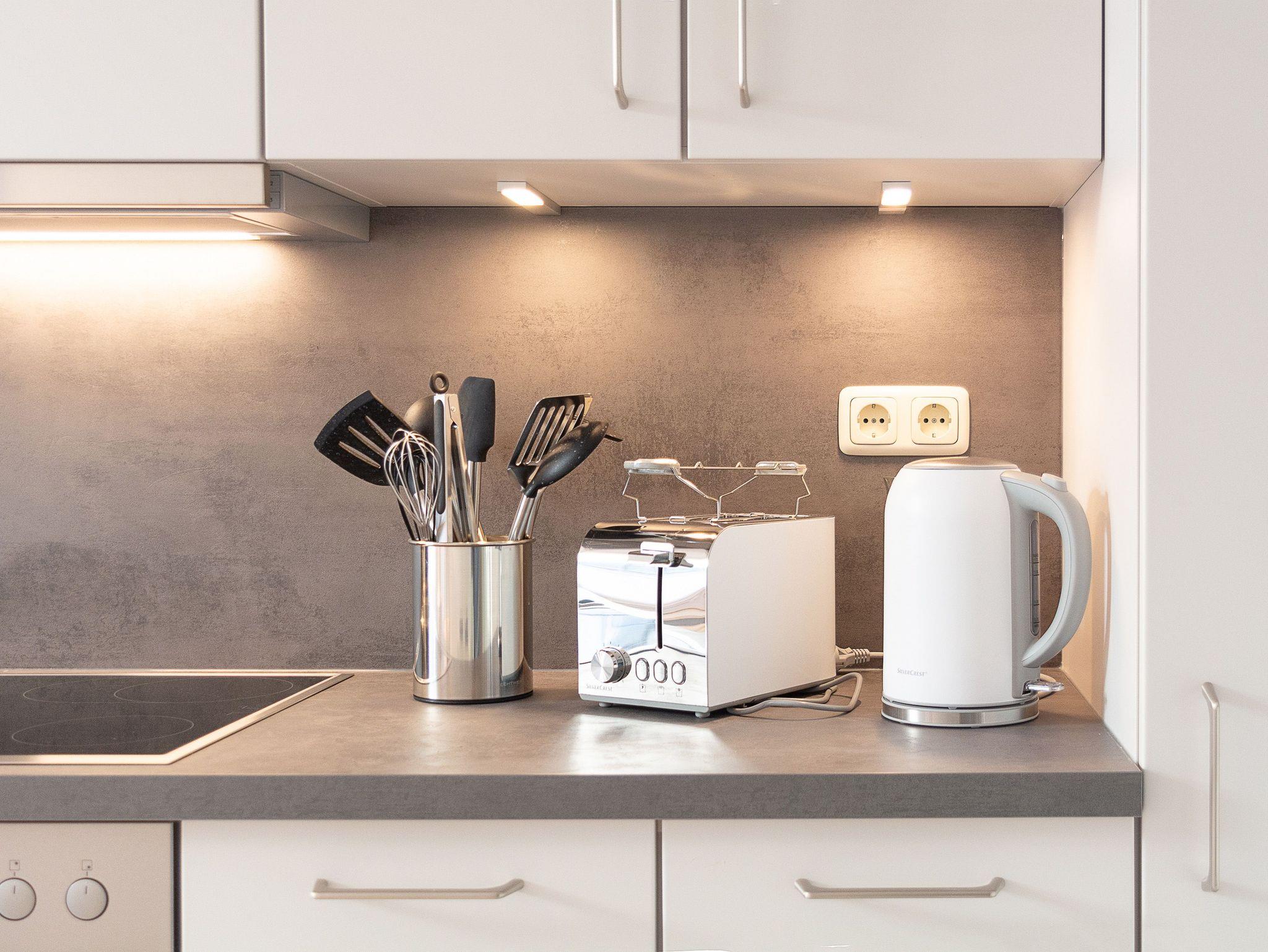 Die im moderne separate Küche hält für Sie alle wichtigen Küchengeräte und -utensilien bereit, die Sie für Ihr perfektes Dinner benötigen: Ein 4-Zonen-Cerankochfeld, ein Backofen mit Dunstabzug, ein Geschirrspüler sowie ein Kühlschrank mit Gefrierfach befinden sich in der Küche. Eine Kaffeemaschine, ein Wasserkocher und ein Toaster sowie genügend Koch- und Essgeschirr komplettieren die Küchenausstattung.