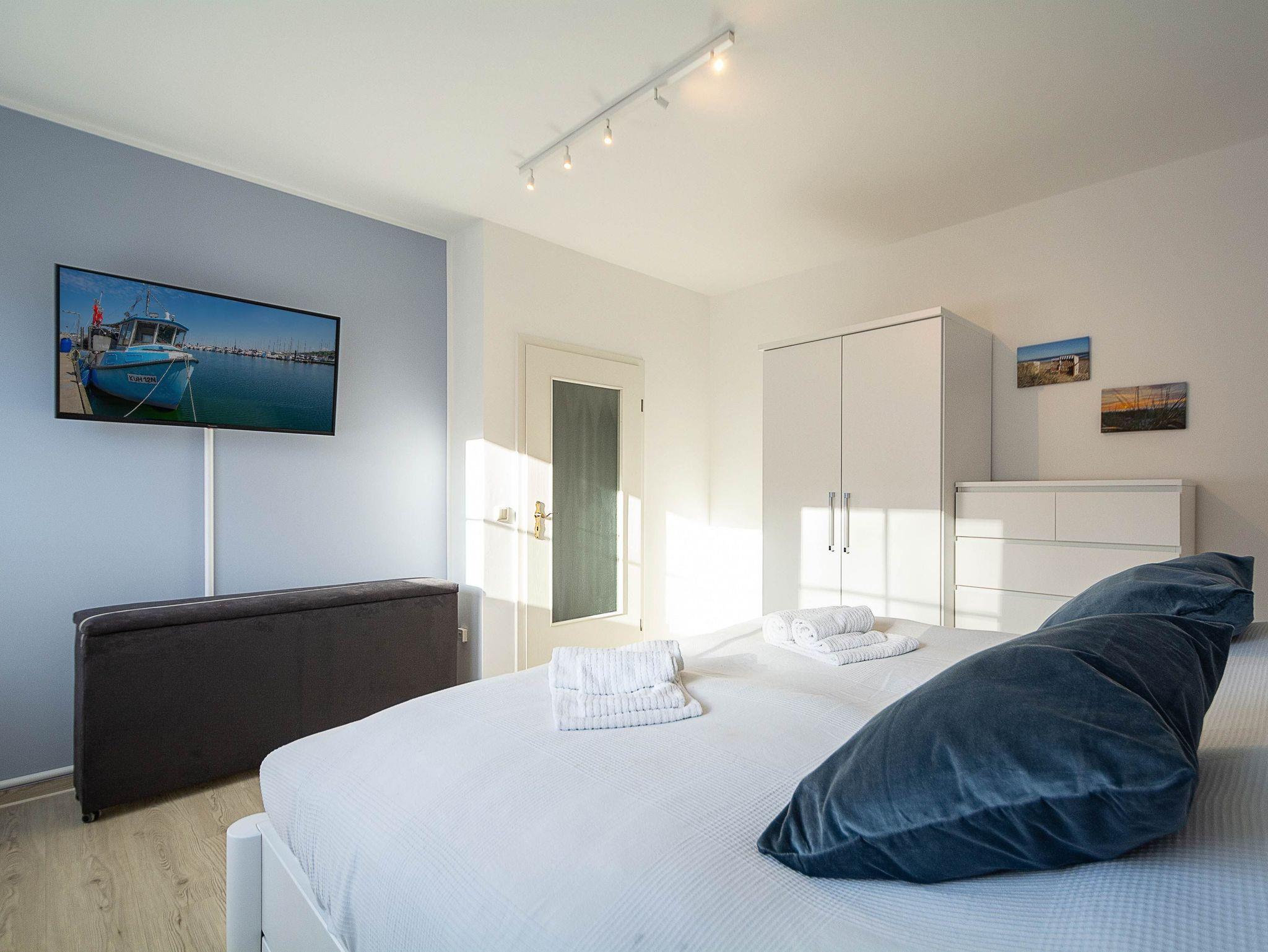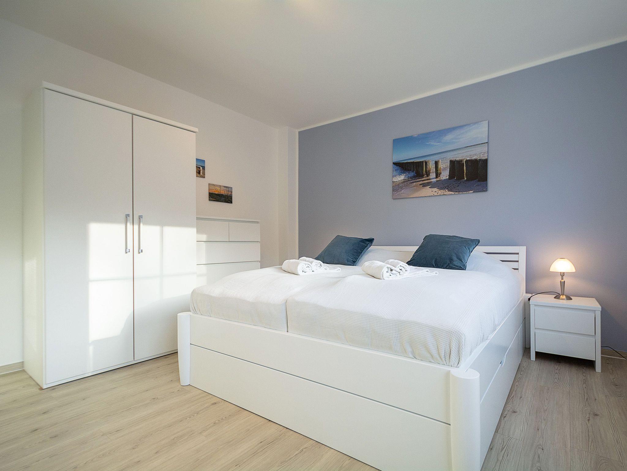 Im Schlafzimmer lädt Sie ein komfortables Doppelbett (2 x 80 x 200 cm) zur Nachtruhe ein. Der großzügige Kleiderschrank sowie eine Kommode bieten ausreichend Platz für Ihre Urlaubsgarderobe. Als Sichtschutz sind im Schlafzimmer und im Wohnzimmer Plissees an den Fenstern angebracht.