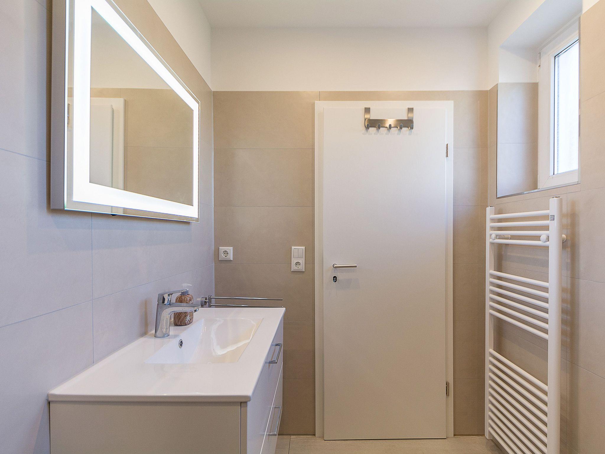 Das modern geflieste Tageslichtbad ist mit einer bodengleichen Duschkabine, Waschbecken und WC eingerichtet. Ein Handtuchheizkörper sorgt für kuschelig warme Handtücher und der Föhn für zusätzlichen Komfort während Ihres Aufenthalts.