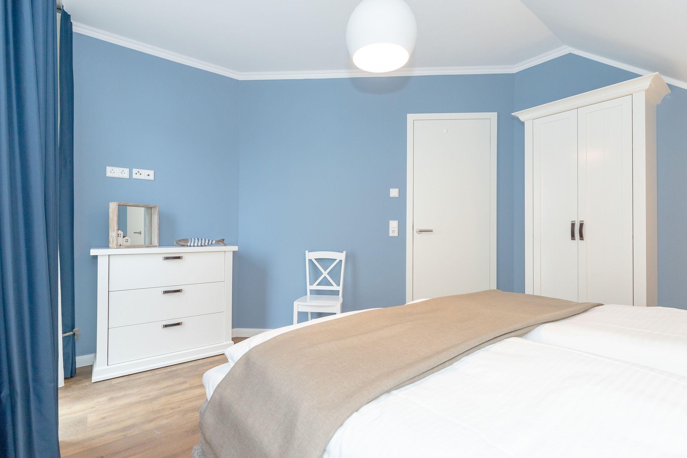 Das Schlafzimmer ist mit einem großen, bequemen Boxspringbett für zwei Personen und einem geräumigen Kleiderschrank mit vielen Ablagemöglichkeiten für Ihre Garderobe eingerichtet.