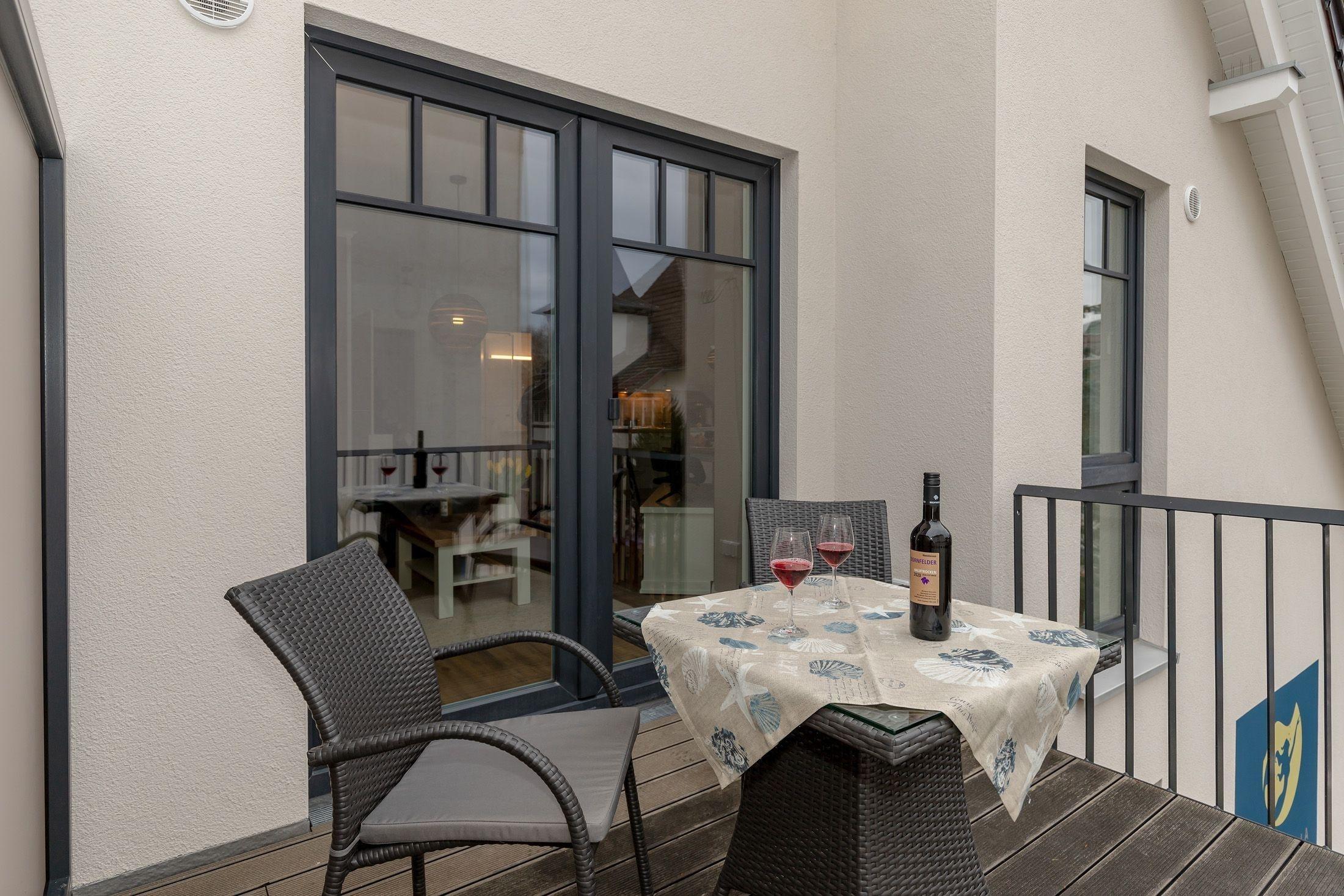 Zur Wohnung gehört ein Balkon zur Nordseite, welcher zum Verweilen und Entspannen nach langen Strandspaziergängen oder einem Shoppingtag einlädt.