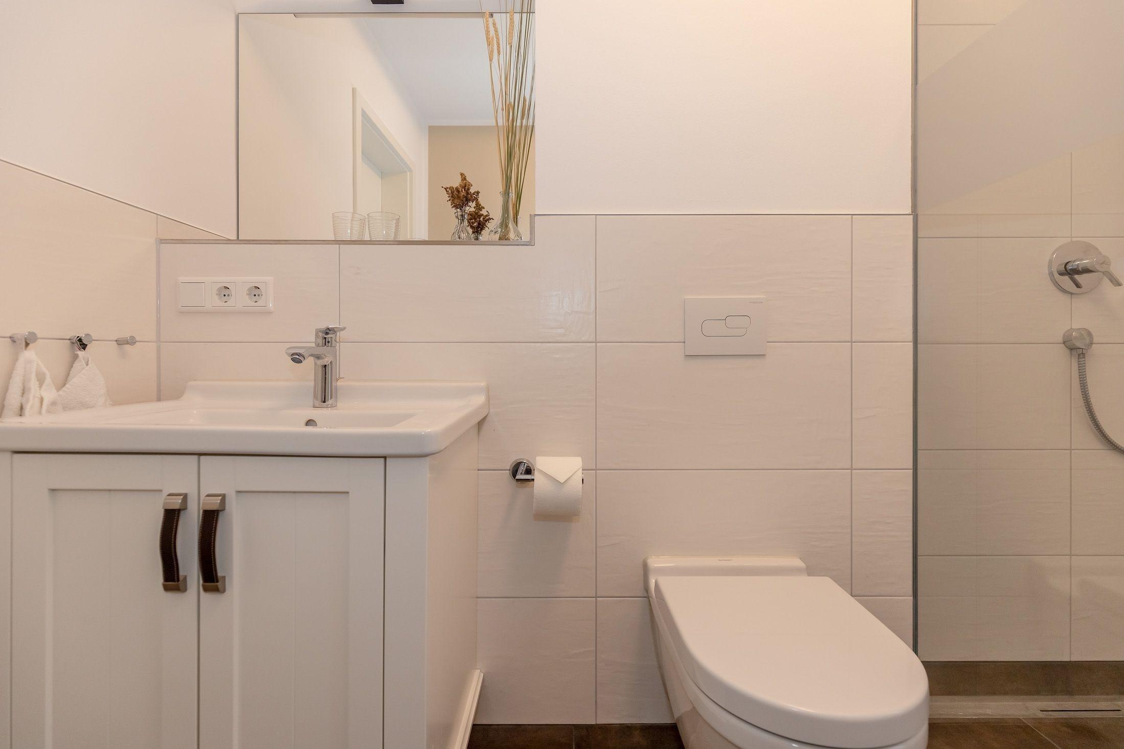 Das Duschbad ist mit einer großzügigen Dusche und WC modern eingerichtet.