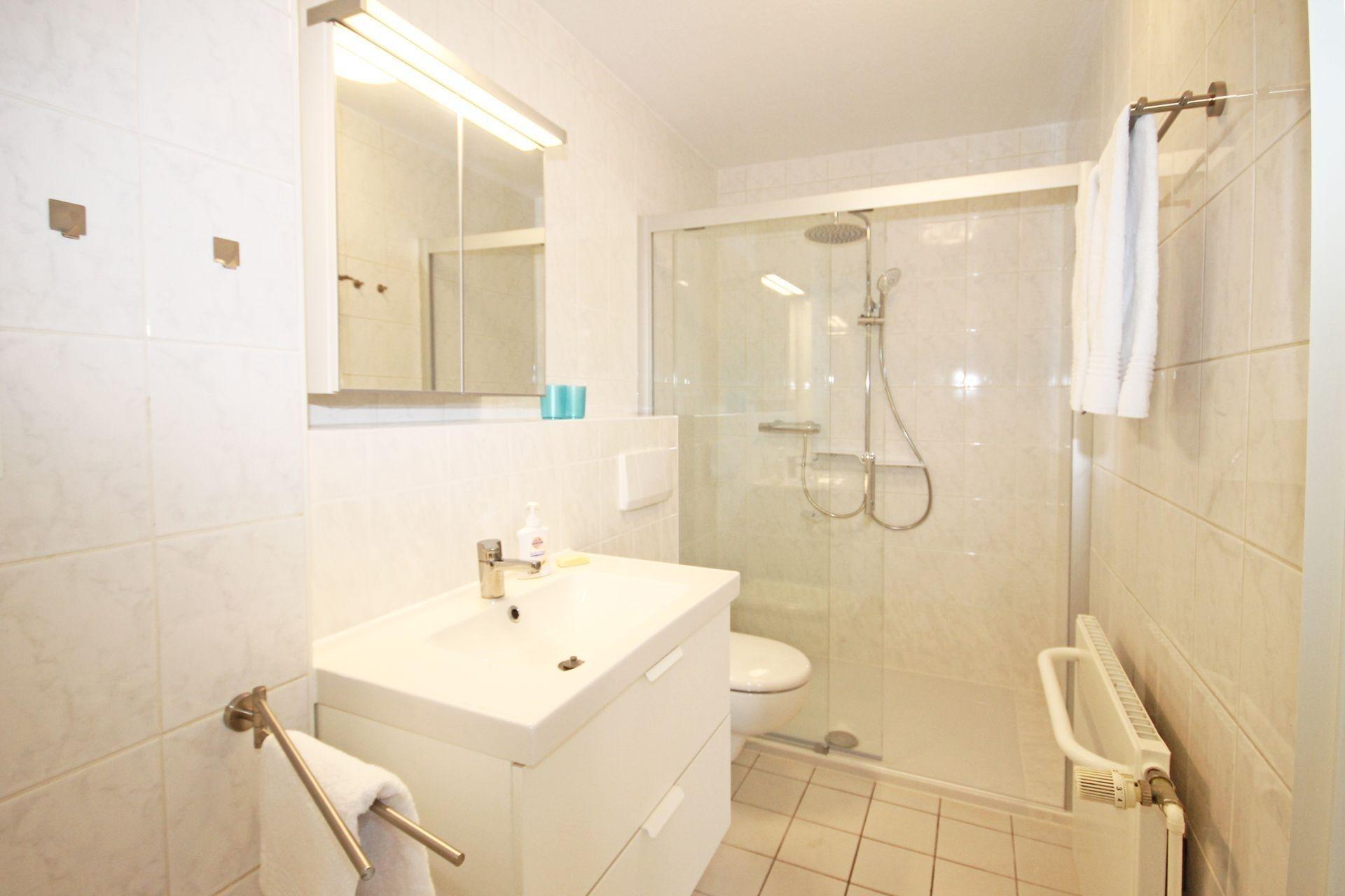 Das Bad ist mit einer großen, ebenerdigen Regendusche ausgestattet. Hier werden Sie viel Freude an einer erfrischenden Dusche nach einem langen Strandtag haben. Viele Möglichkeiten Ihre Handtücher aufzuhängen sind gegeben. Ablagemöglichkeiten für Ihre Utensilien sowie ein Fön ist vorhanden.