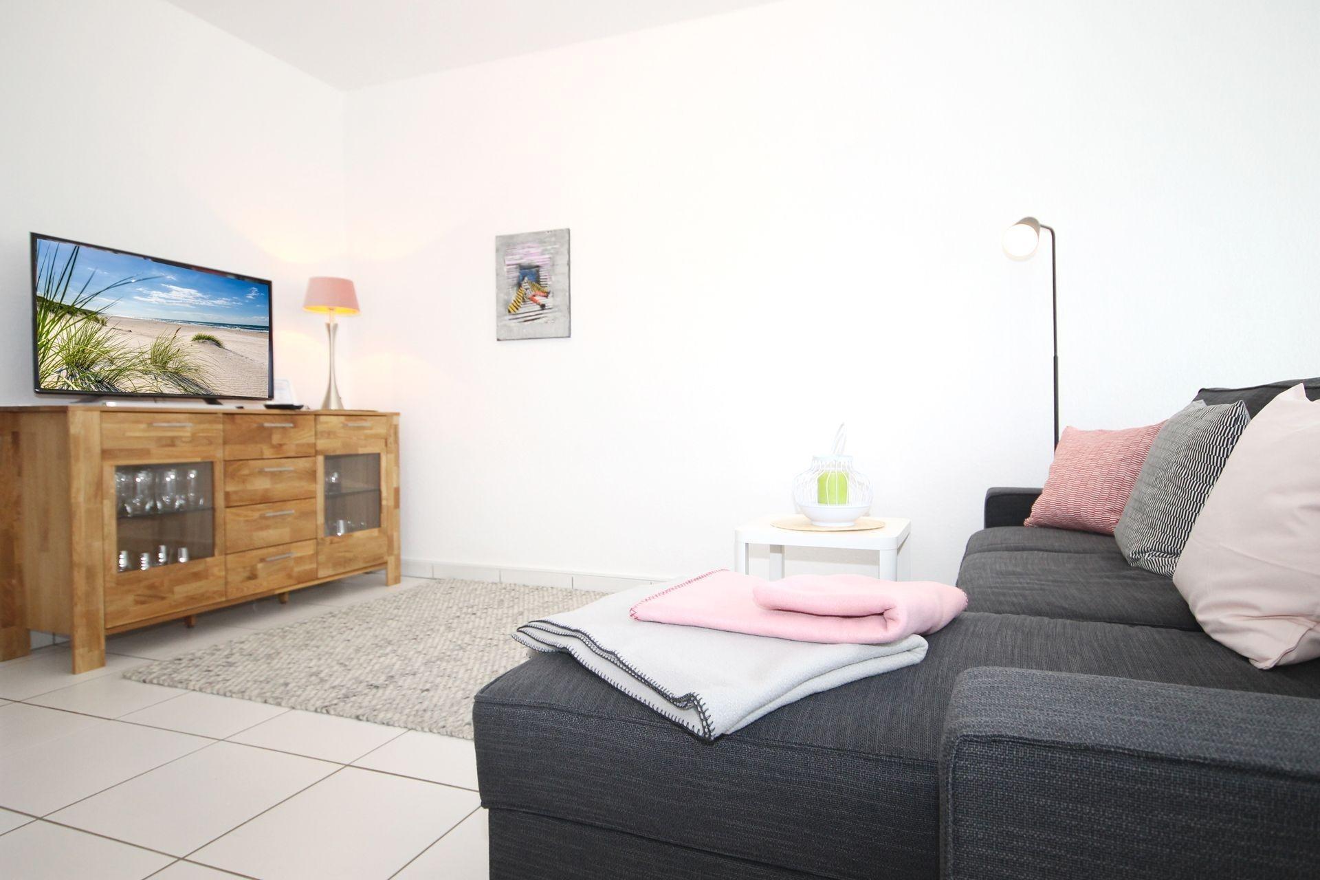 Im Wohnzimmer befindet sich ein großzügiges und bequemes Schlafsofa. Für Ihre Unterhaltung sorgt der Flachbild-TV.