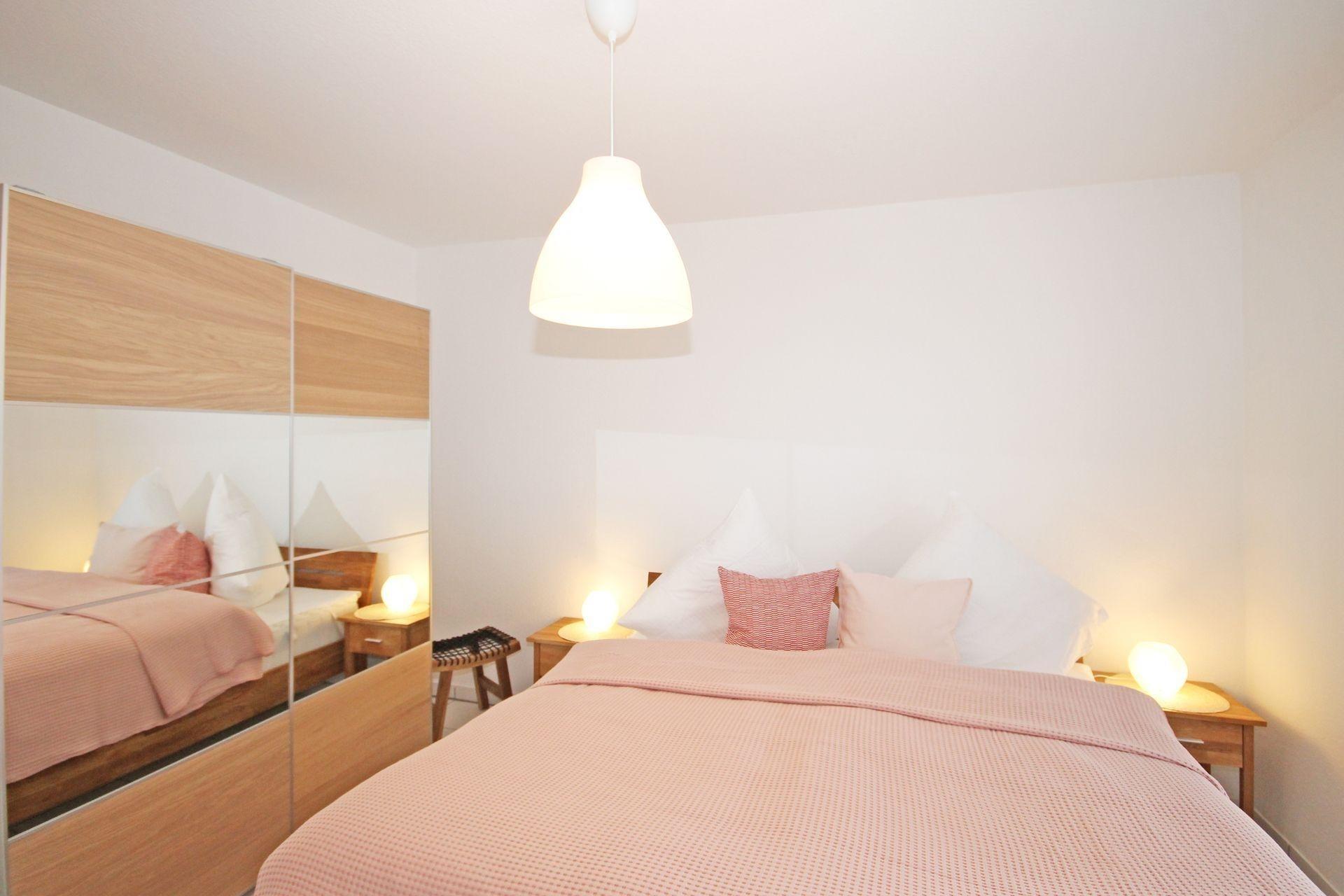 Das Schlafzimmer ist mit einem hochwertigem Doppelbett und modernen Kleiderschrank ausgestattet. Zur Ablage dient außerdem noch ein Kofferbock und Herrendiener.