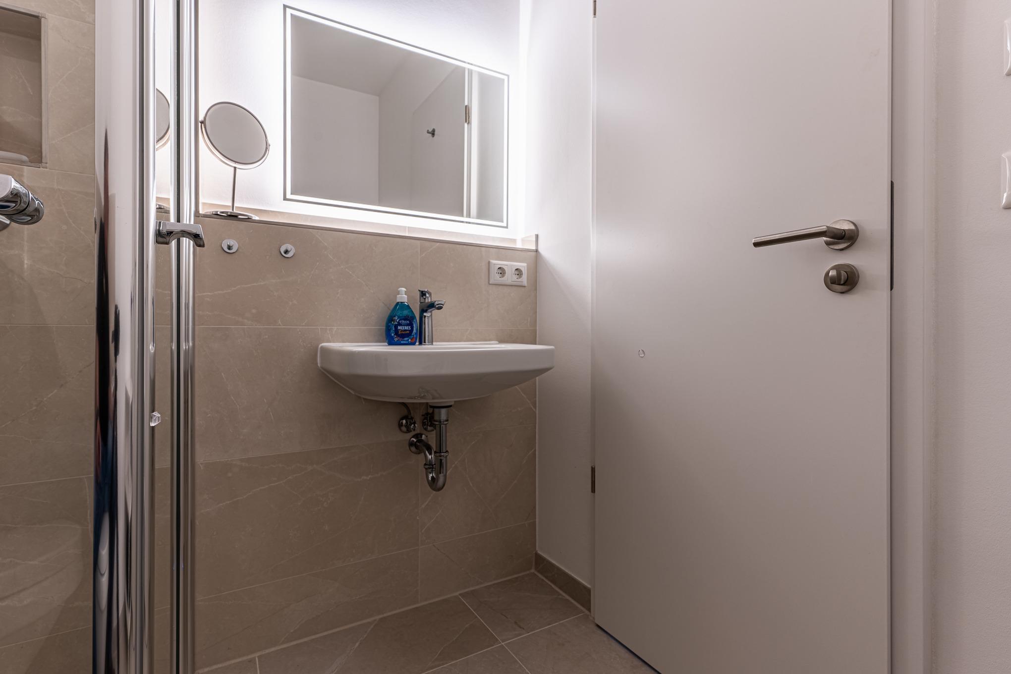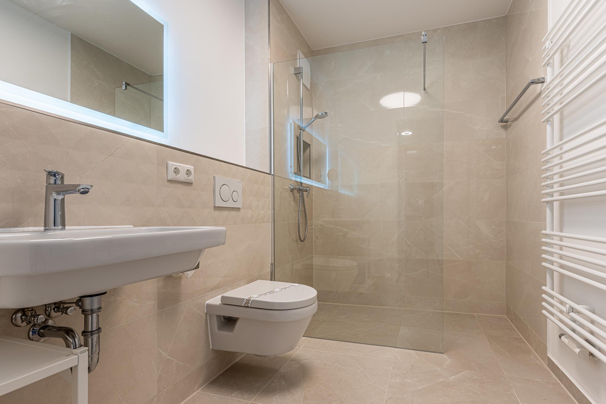 Die beiden modernen Duschbäder verfügen jeweils über eine ebenerdige Dusche und einen Waschbereich mit genügend Ablagemöglichkeiten für Ihre Kosmetikartikel. Der Zugang vom 2. Duschbad befindet sich in einem der Schlafzimmer.