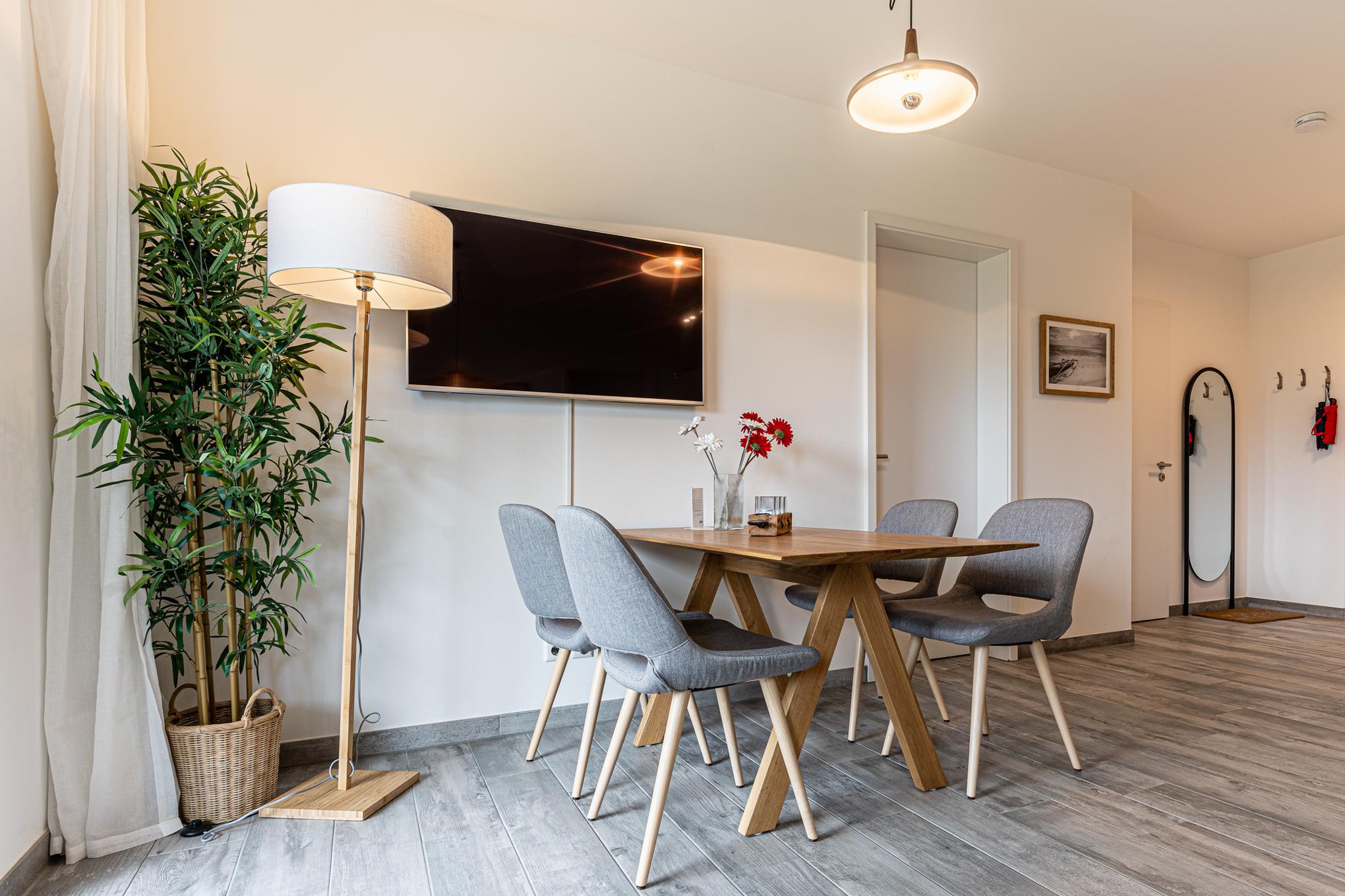 Das kombinierte Wohn/Esszimmer mit offener Küche bietet mit seiner hochwertigen Einrichtung ein gelungens Ambiente. Der Wohnbereich ist mit einer gemütlichen Couch, welche sich in nurwenigen Handgriffen zu einer weiteren Schlafmöglichkeit (z.B. als Ausweichmöglichkeit für Schnarcher oder für 5. + 6. Person) umfunktionieren lässt, sowie einen großem Flatscreen ausgestattet. An dem integrierten Esstisch findet sich genügend Platz für bis zu 6 Personen.