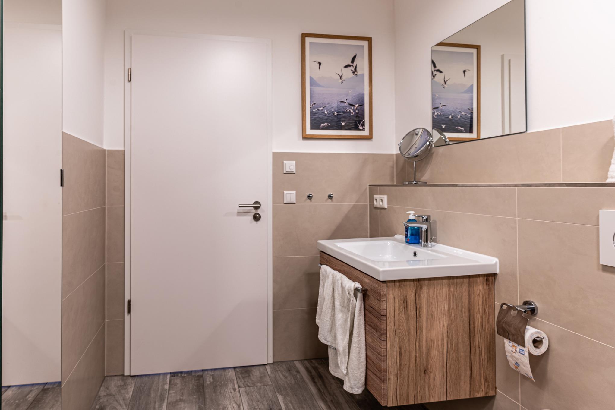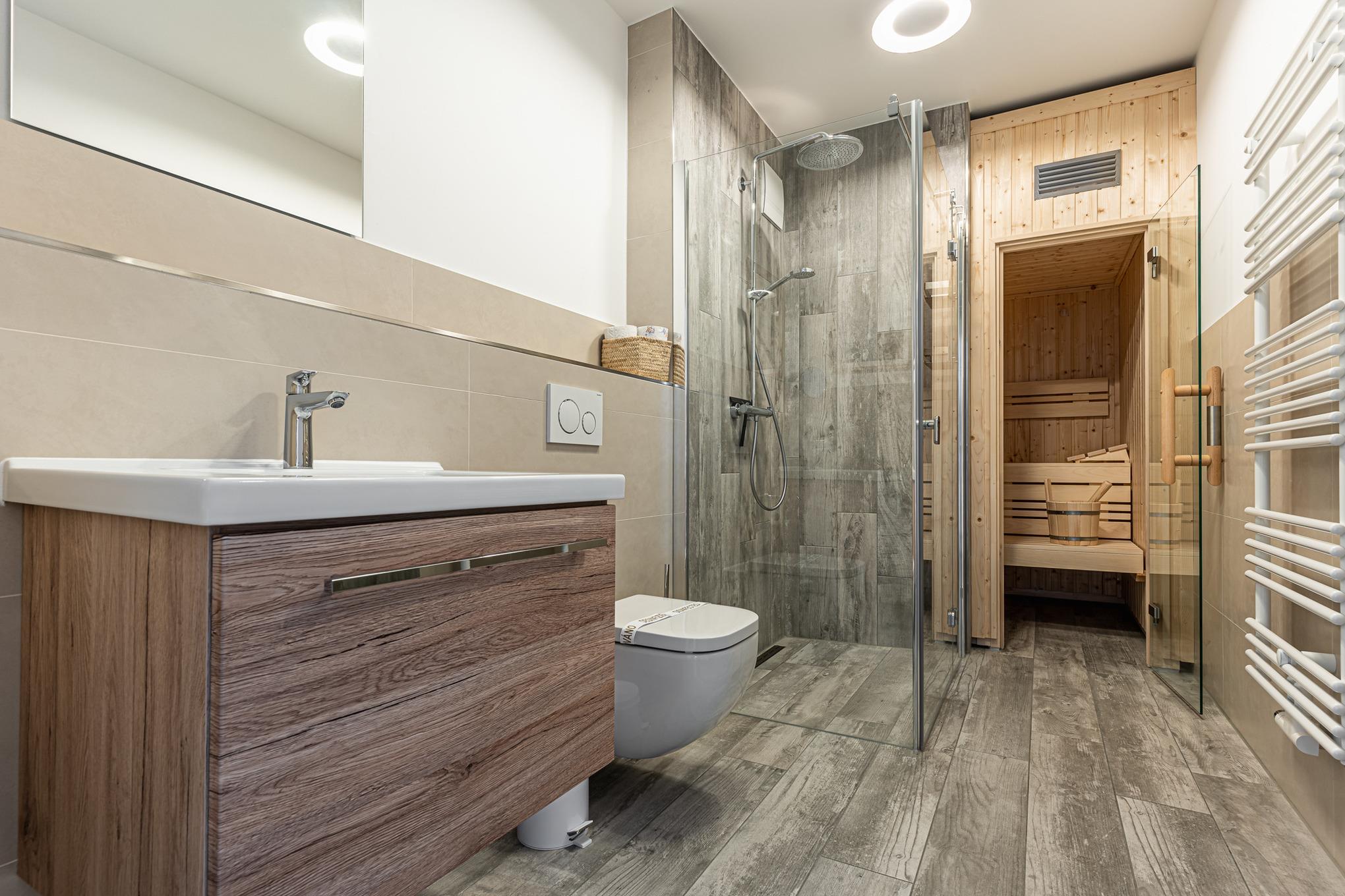 Das moderne Badezimmer ist mit Waschtisch, WC, Haarfön, Kosmetikspiegel und ebenerdiger Dusche ausgestattet. Über das Badezimmer gelangen Sie in Ihre eigene Privatsauna, welche Ihnen den gesamten Aufenthalt natürlich kostenfrei zur freien Verfügung steht. Der Einbau der Sauna erfolgt spätestens im Herbst 2021, eine Nutzung ist ab dem 01.11. garantiert.