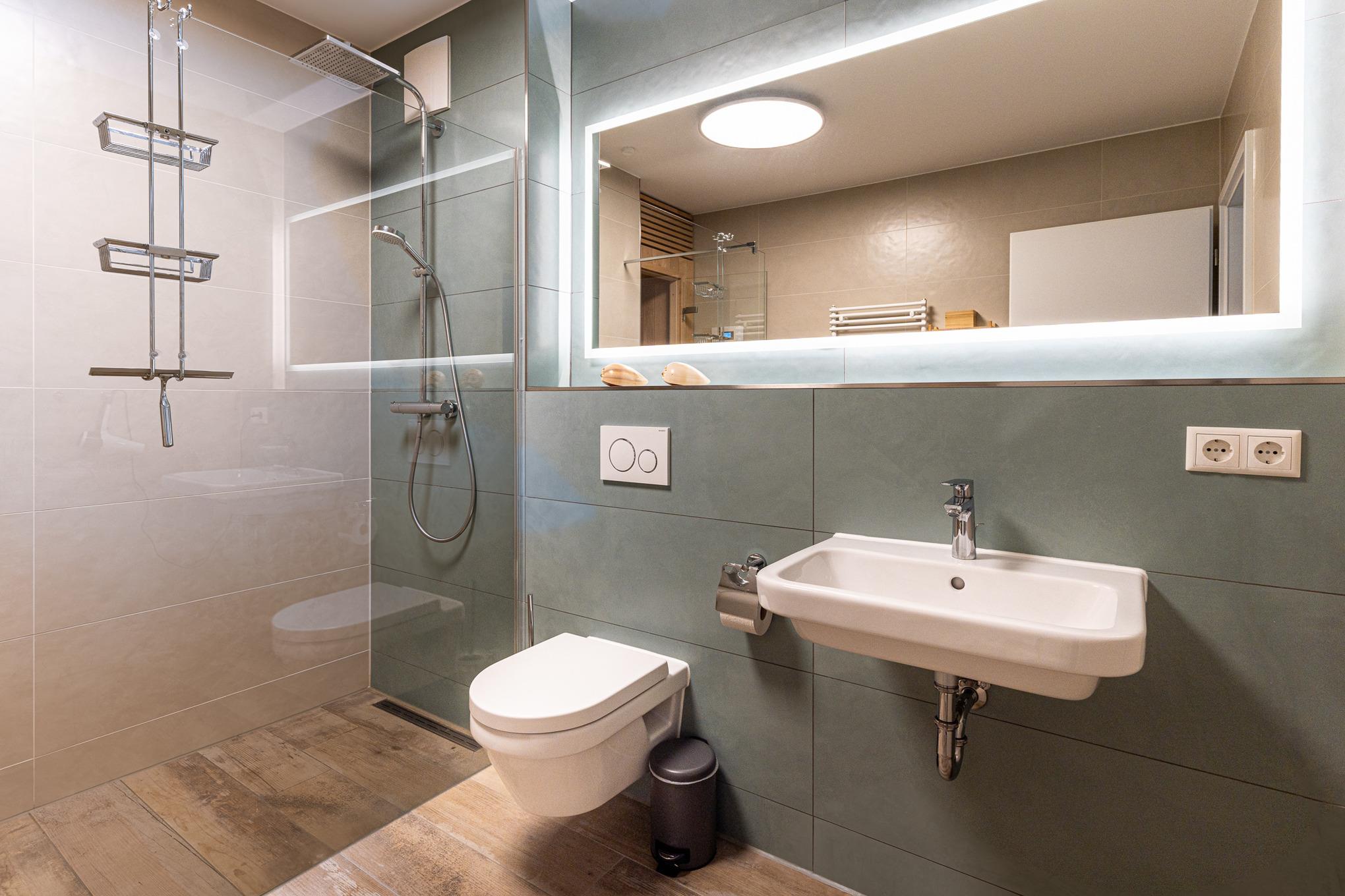 Das moderne Bad ist geschmackvoll ausgestattet und bietet Ihnen nebst WC eine ebenerdige Dusche (140cm) mit Echtglasabtrennung und Regenbrause, sowie einem großen Waschtisch mit Lichtspiegel, Haarfön und genügend Ablagemöglichkeiten für Ihre Kosmetikartikel. Über das Bad gelangen Sie in Ihre eigene Privatsauna, welche Ihnen während des Aufenthaltes natürlich kostenfrei zur Verfügung steht.