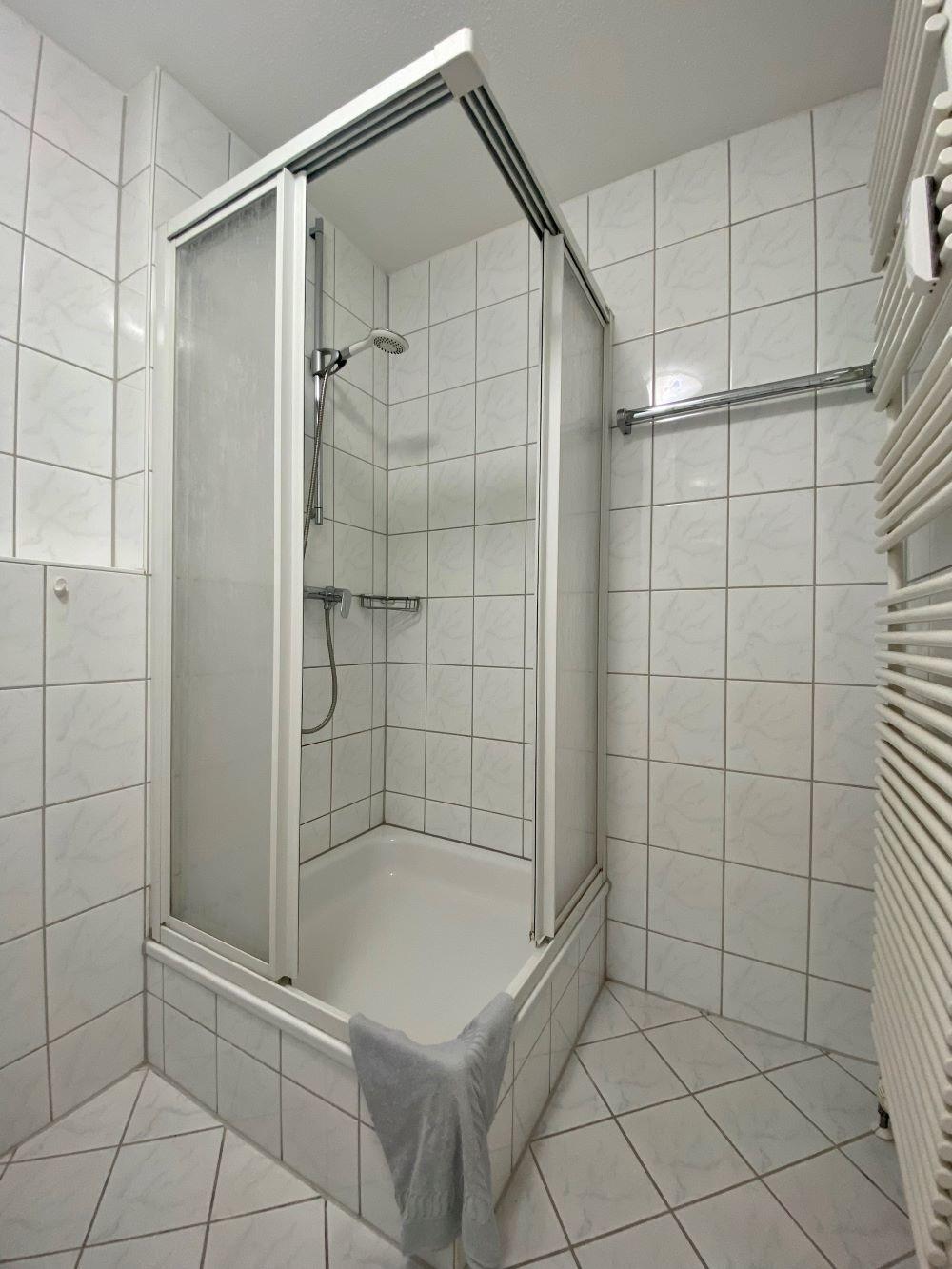 Das Badezimmer verfügt über eine Dusche, WC sowie einem Waschtisch mit beleuchteten Spiegel.