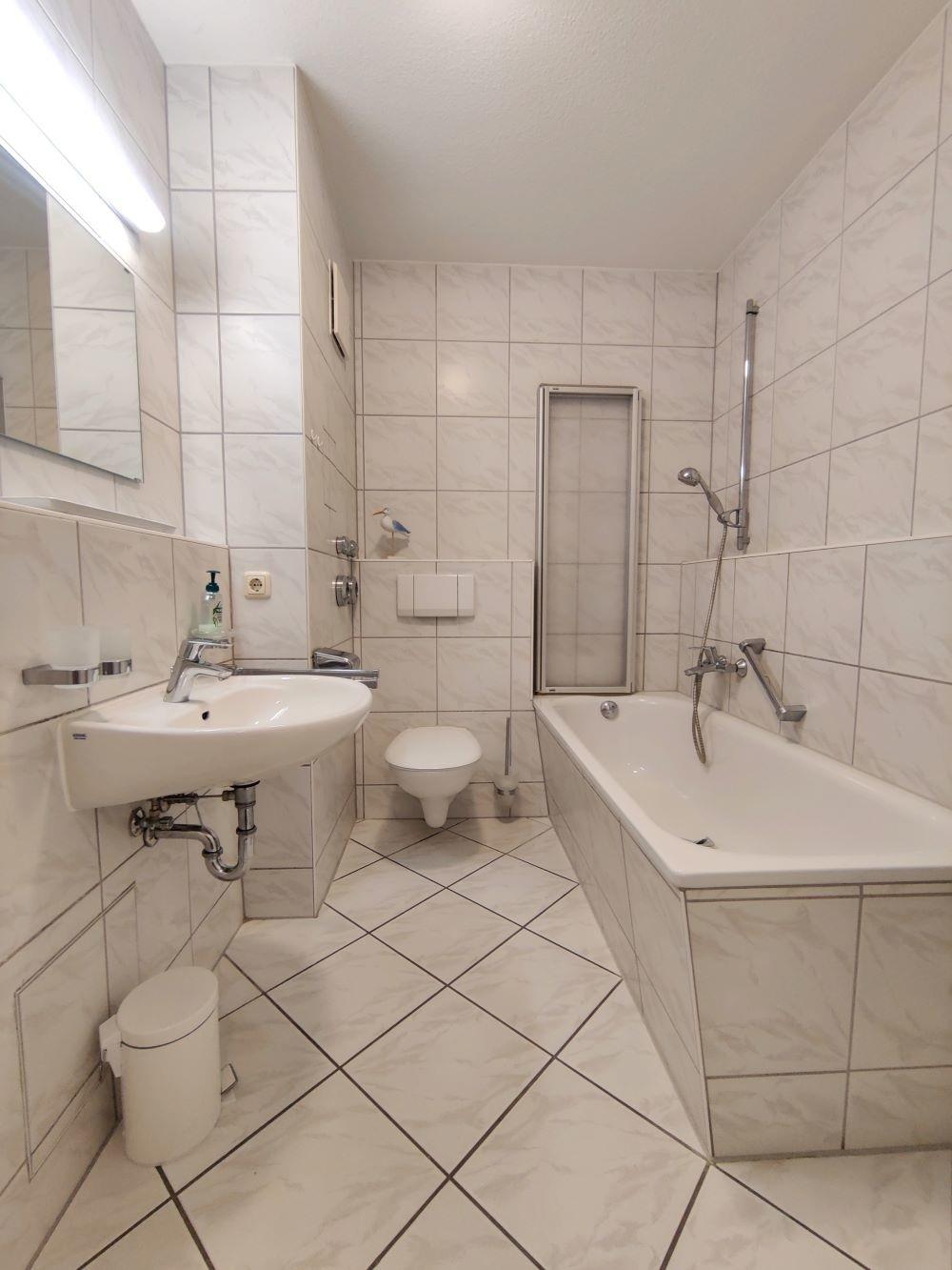 Das Badezimmer verfügt über eine Badewanne, WC sowie einem Waschtisch mit beleuchteten Spiegel.