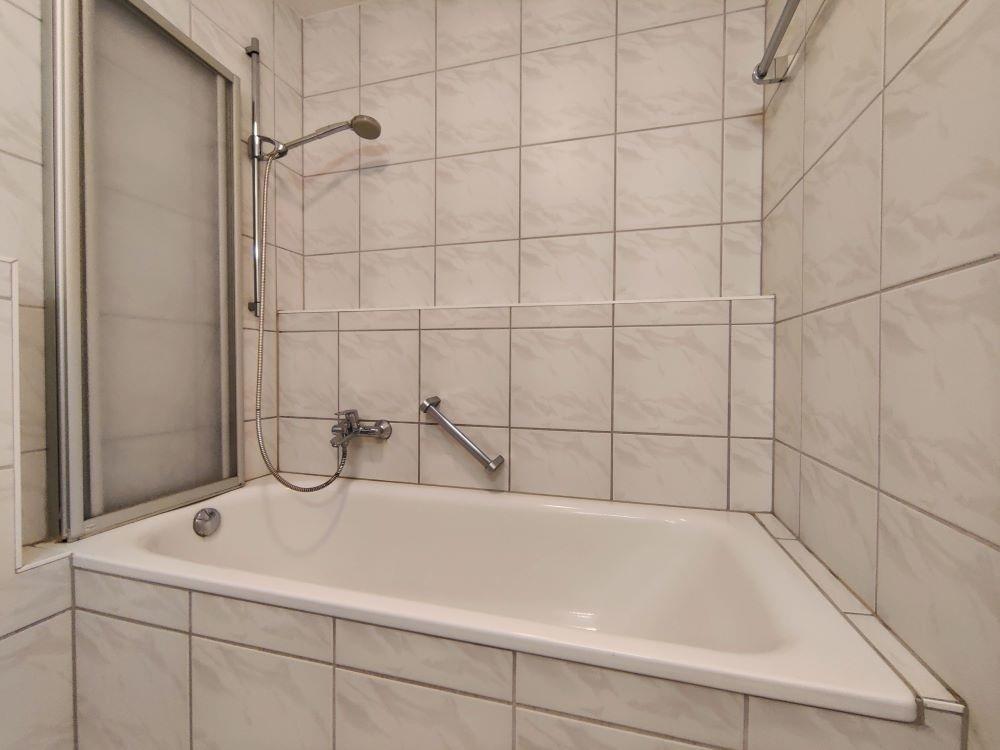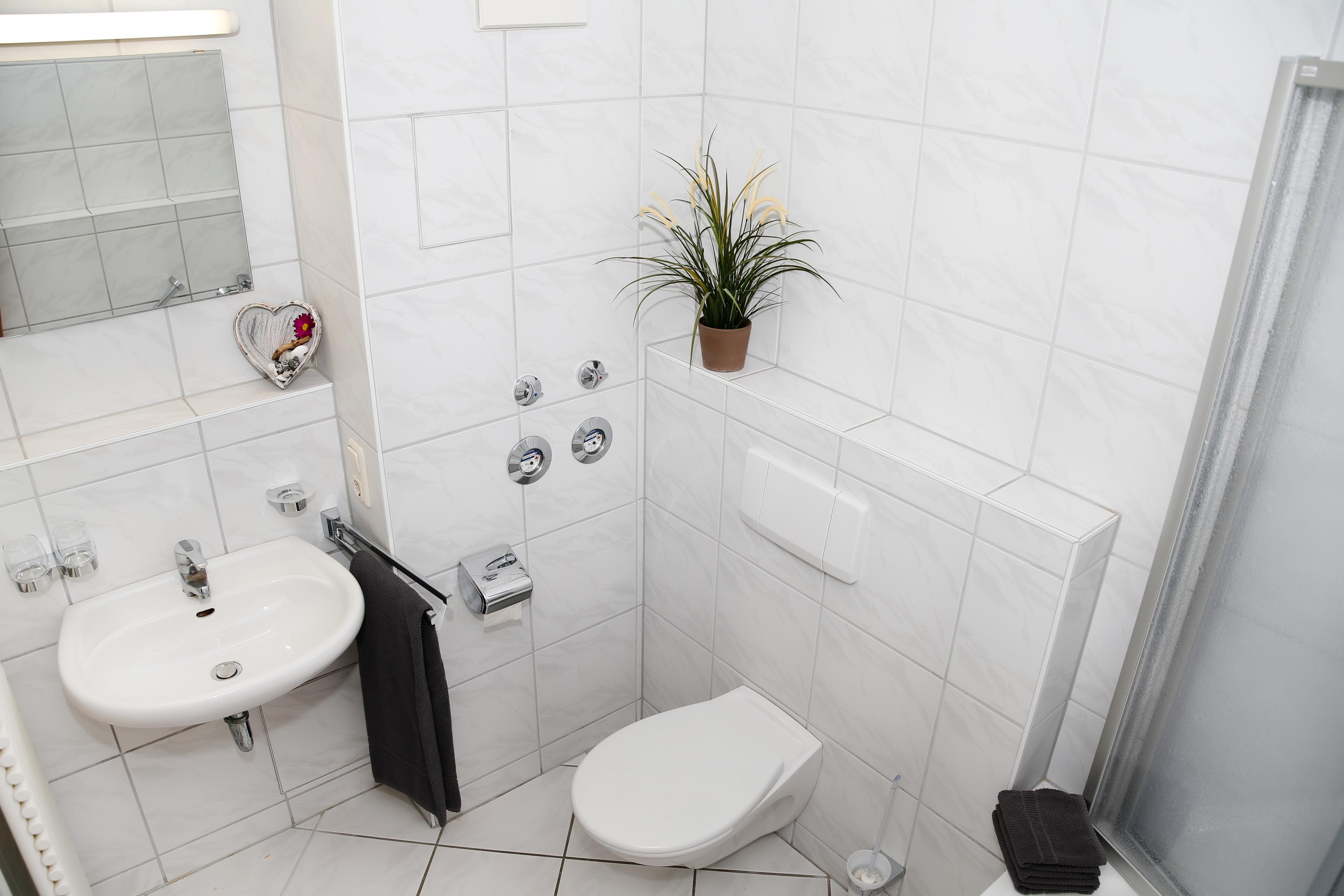 Das Badezimmer verfügt über eine Badewanne, WC sowie einem Waschtisch mit beleuchteten Spiegel.