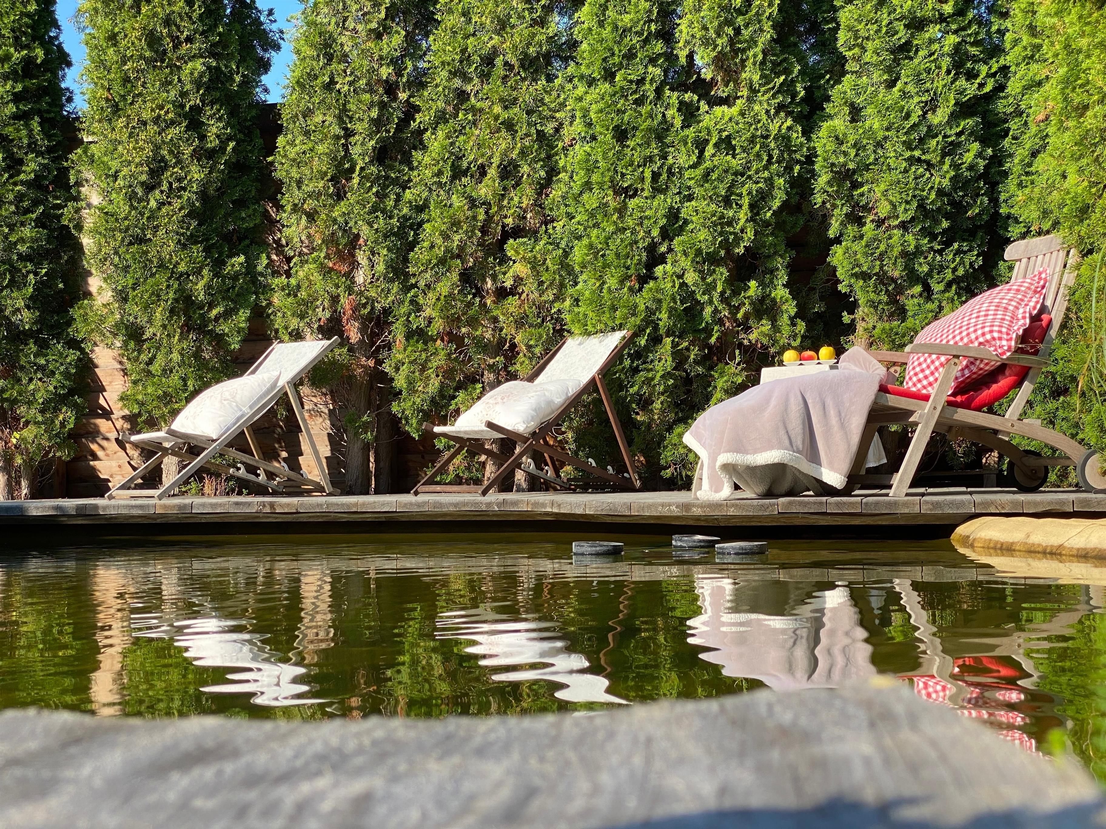 Gesamtgröße ca. 70m², zuzüglich ca. 6qm überdachter Gartenlaubenbalkon, kostenfreies WLAN, 1 PKW Stellplatz, Nutzung des Garten SPA mit Schwimmteich, Gartensaunen & Ruhebereichen