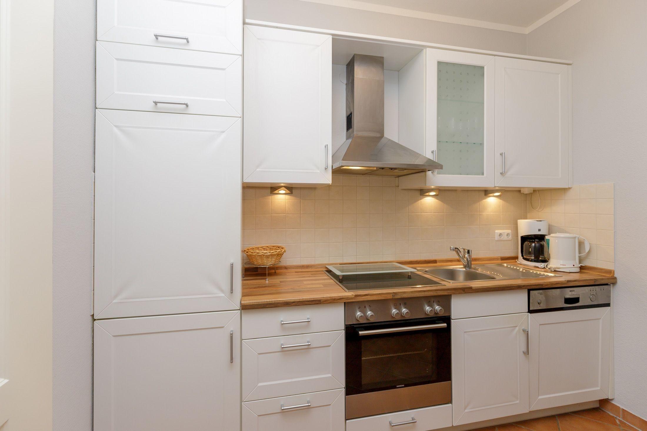 Die Küche ist mit allen Geräten wie Kühlschrank mit Gefrierfach, Kaffeemaschine, Toaster und Kochutensilien ausgestattet. Hier macht das gemeinsame Kochen auf dem 4-Plattenherd Spaß.